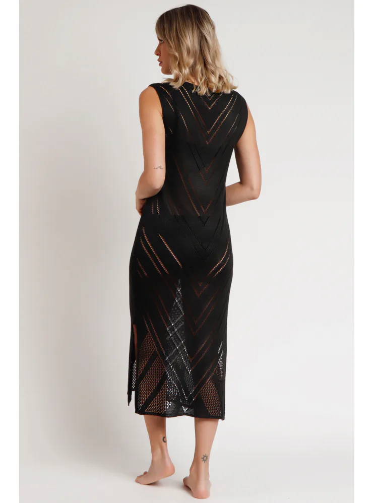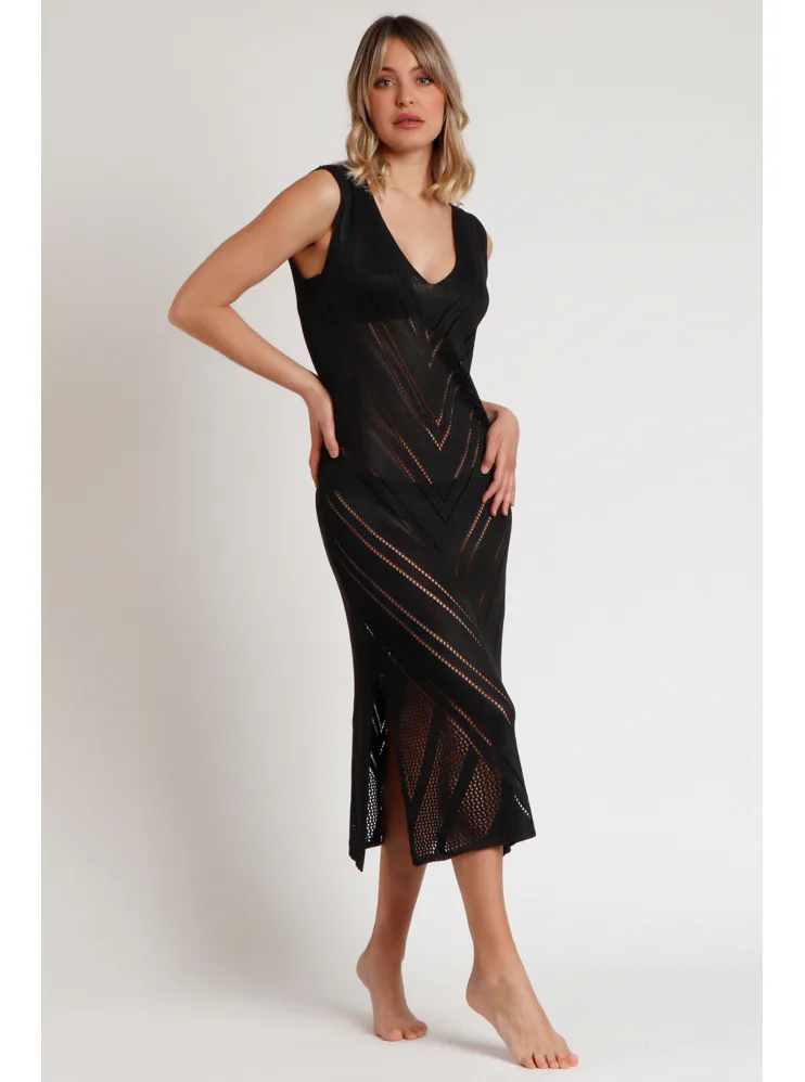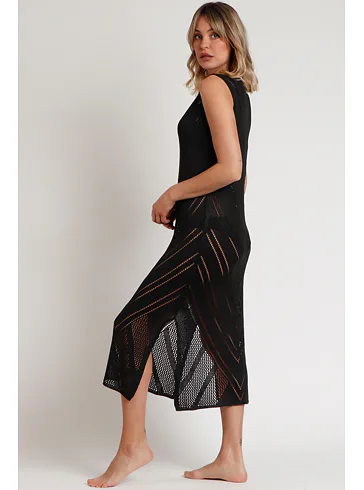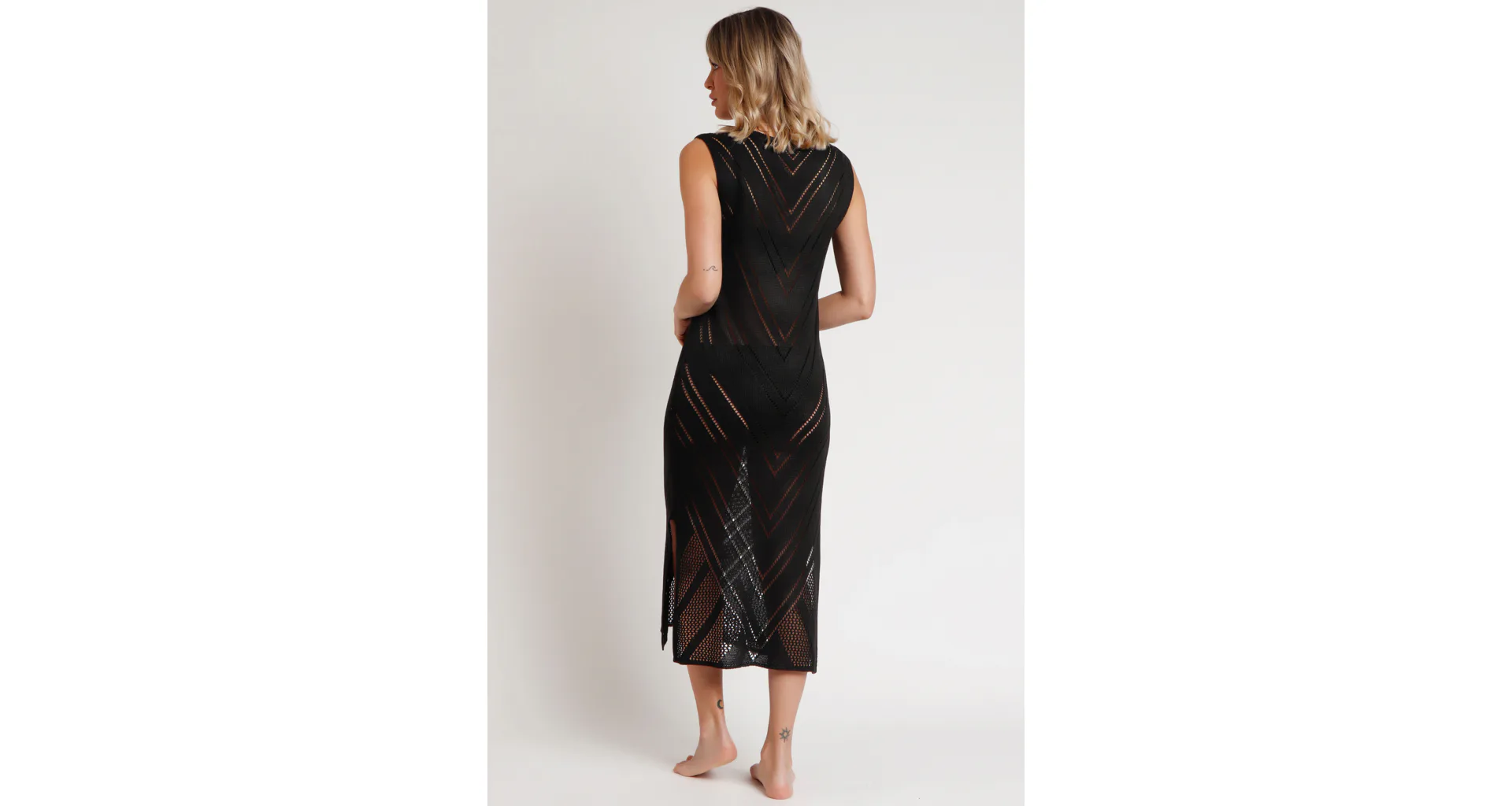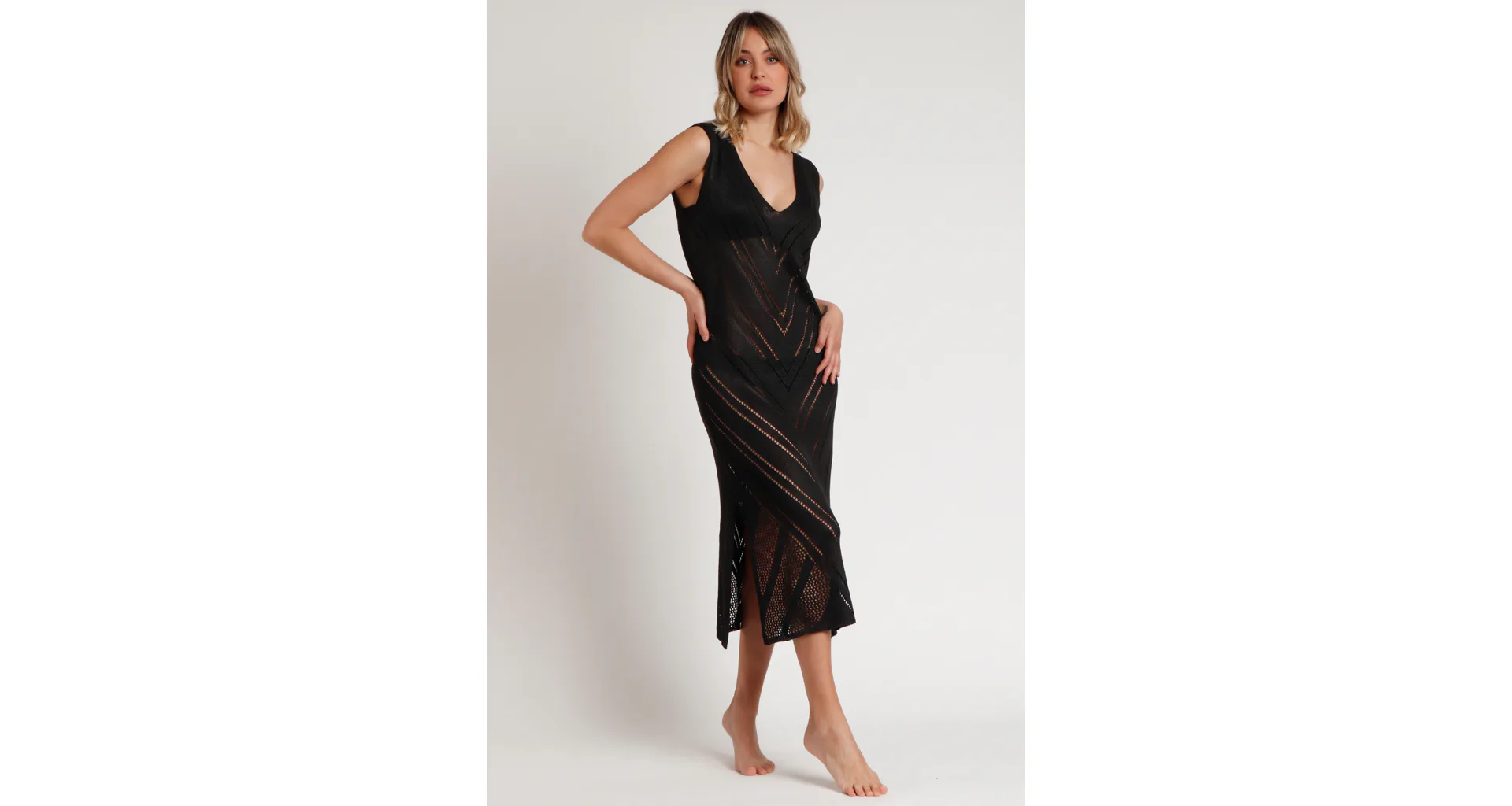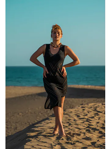 Černé dámské šaty zaujmou na první pohled prošívaným detailem a krátkým rozparkem po obou stranách. Výstřih do písmene V vykouzlí sexy dekolt. Silnější ramínka dodávají šatům eleganci a nezařezávají se do ramen. Končí přibližně pod koleny. Lehká bavlněná látka vyniká prodyšností, jemností a vysokou odolností proti opotřebení. Ideální na každodenní nošení.
