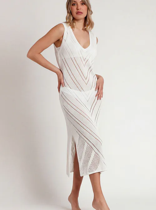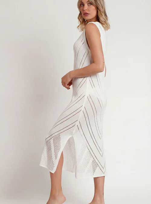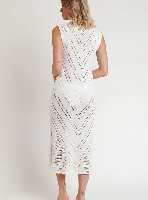Bílé bavlněné šaty vynikají lehkostí, prodyšností a měkkostí. Zaujmou rozparky po obou stranách a výrazným geometrickým vzorem. Šaty lichotí postavě a poskytují maximální pohodlí. Háčkované šaty jsou ideální na letní večery, rande nebo na dovolenou k moři.