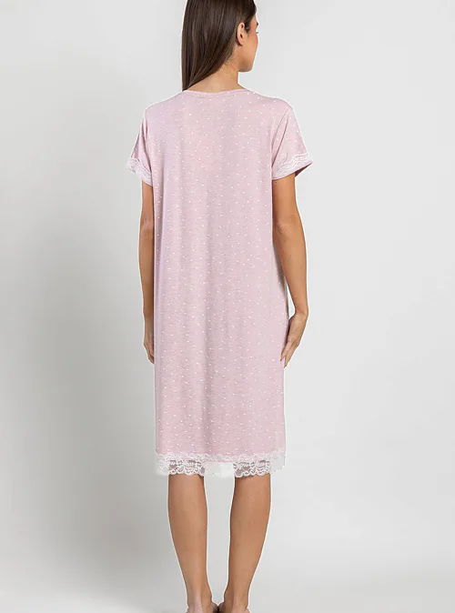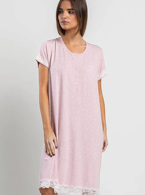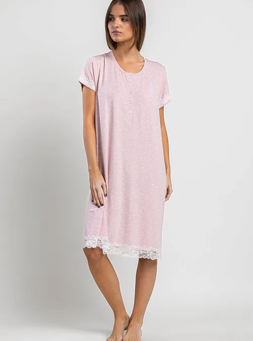 Dopřejte si kvalitní spánek v pohodlné noční košili z příjemné viskózy. Kulatý výstřih působí něžně a přirozeně, zatímco krátké rukávy podtrhují lehkost a vzdušnost. Krajkové lemování dodává košilce romantický nádech.