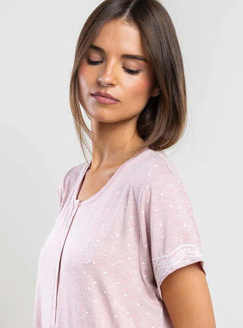 Zajistí maximální pohodlí, volnost a lehkost při každém pohybu. Růžová noční košile s krátkým rukávem představuje ideální volbu pro klidné noci a pohodová rána. Pro dokonale sladěný vzhled můžete pořídit i župan do setu, se kterým vytvoříte elegantní domácí outfit.