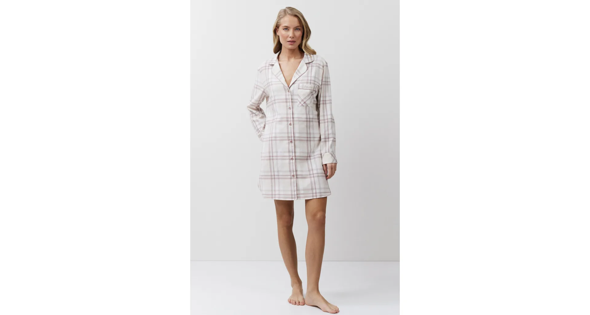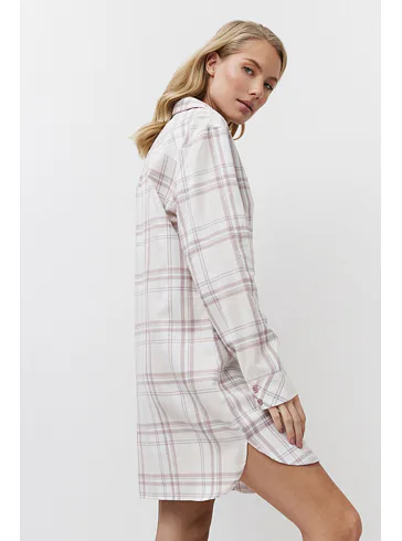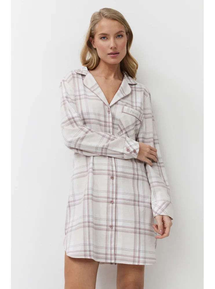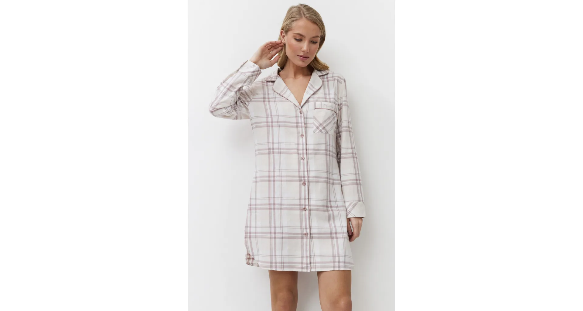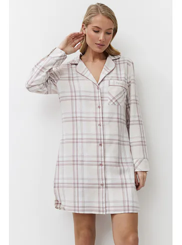 Objevte pohodlí a styl v každém detailu. Bavlněná noční košile má dlouhé rukávy a zapínání na knoflíky. Zaujme nadčasovým bílým a béžovým kostkovaným vzorem. Elegantní volný střih s délkou přibližně nad kolena je ideální pro chvíle odpočinku.