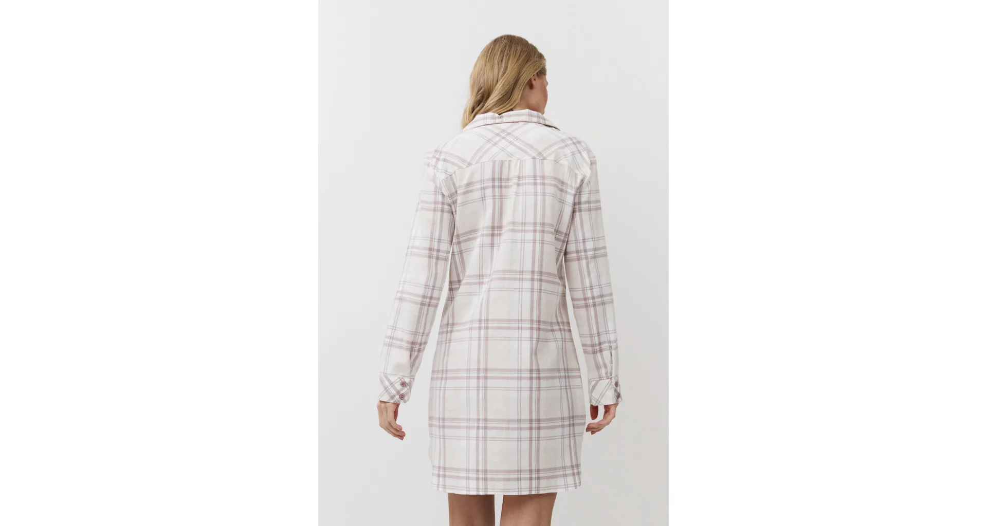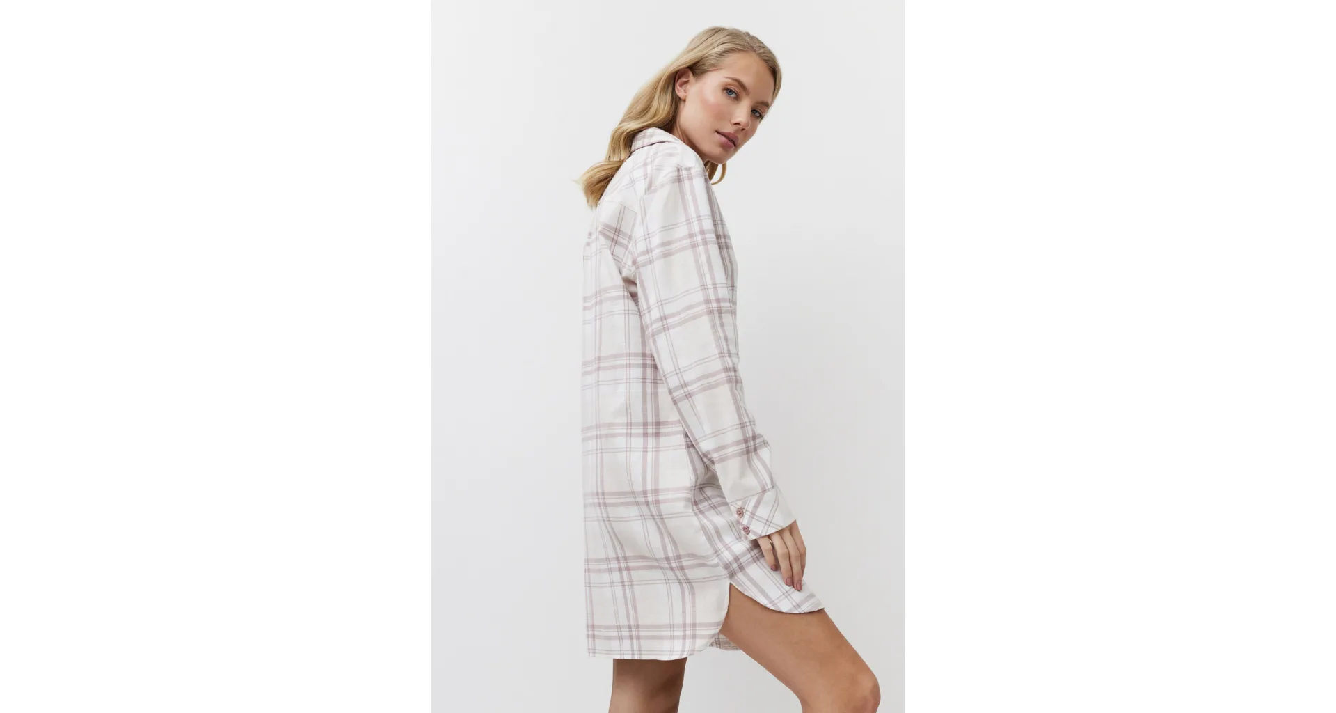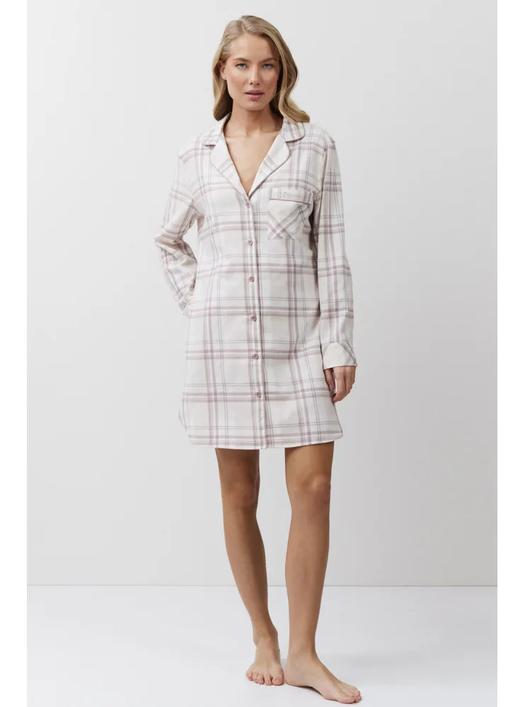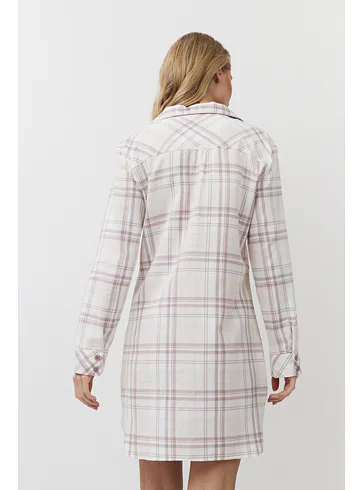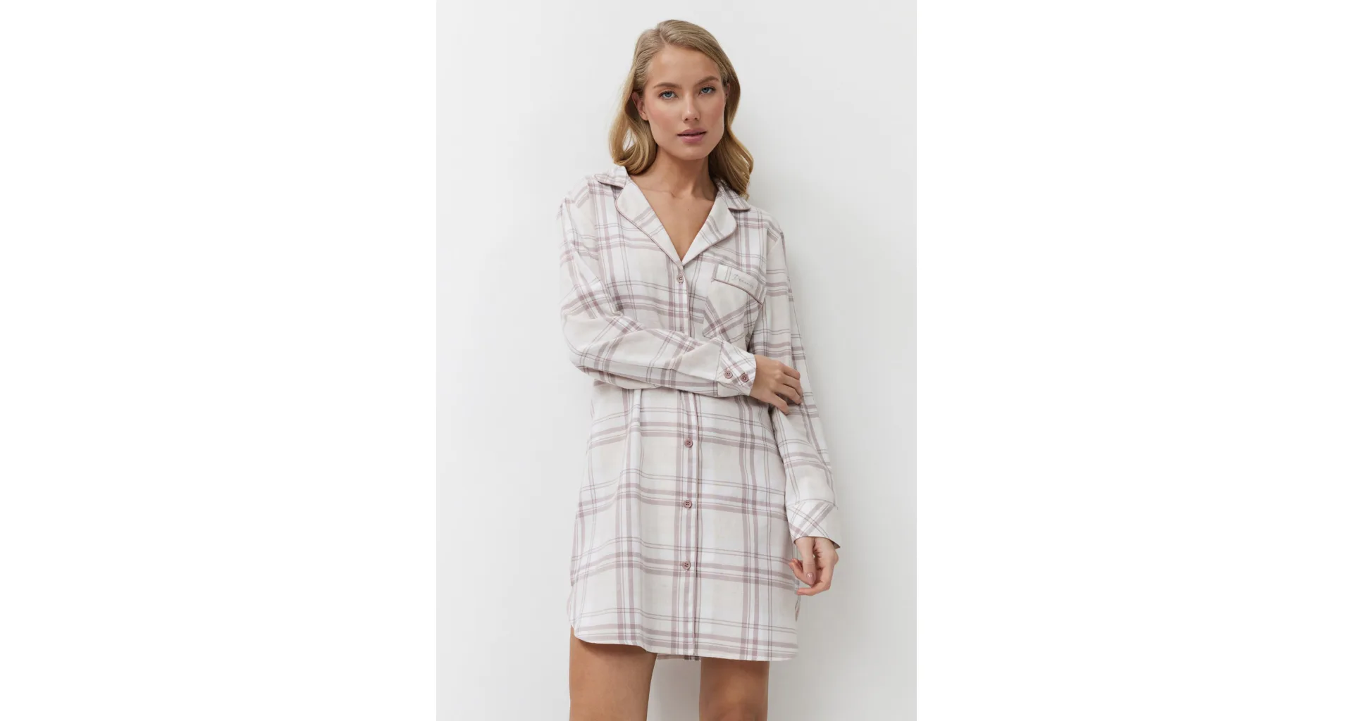 Objevte pohodlí a styl v každém detailu. Bavlněná noční košile má dlouhé rukávy a zapínání na knoflíky. Zaujme nadčasovým bílým a béžovým kostkovaným vzorem. Elegantní volný střih s délkou přibližně nad kolena je ideální pro chvíle odpočinku.