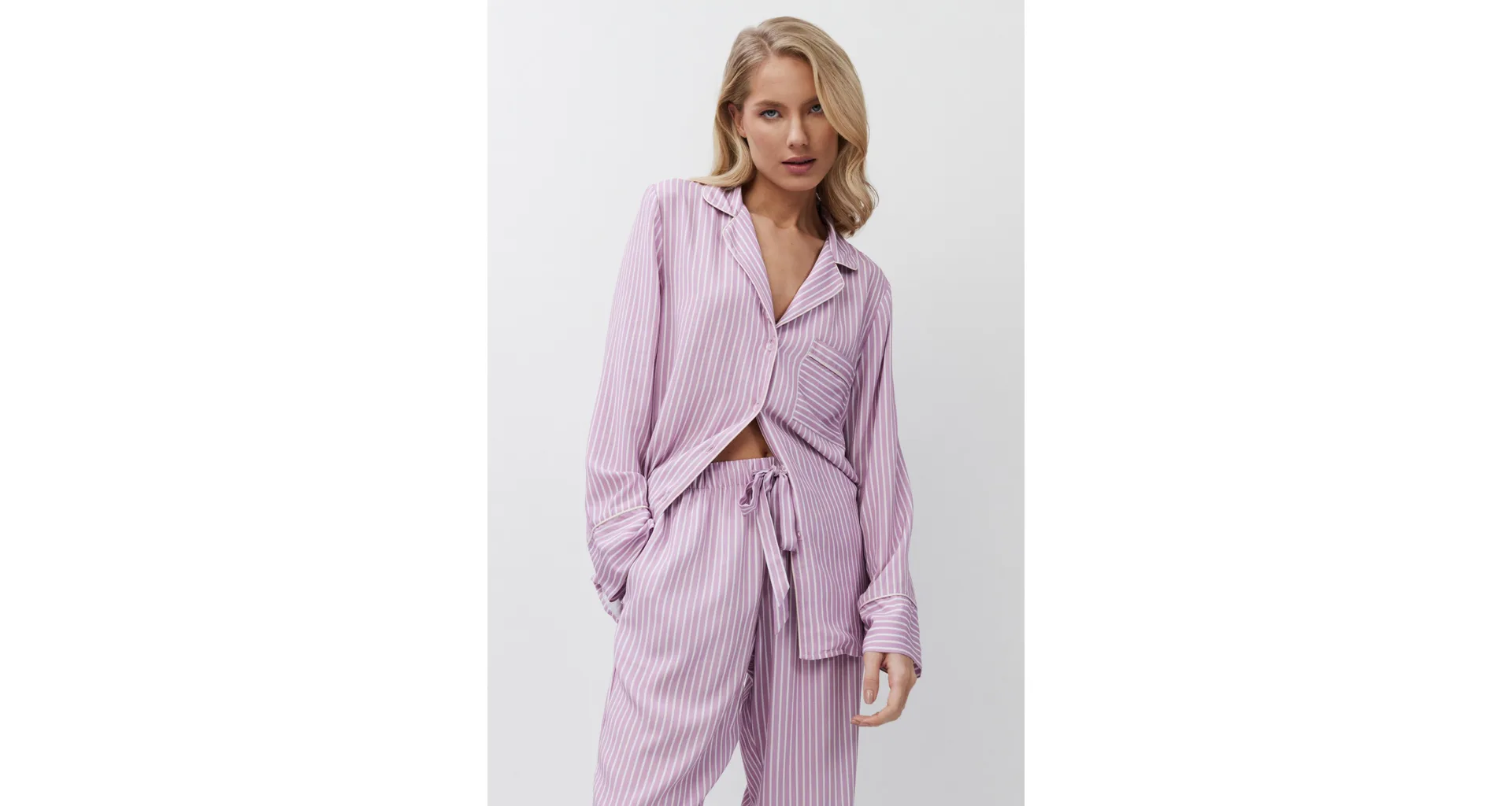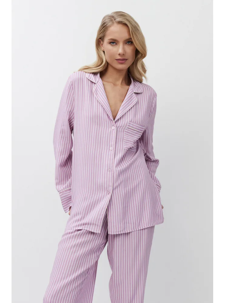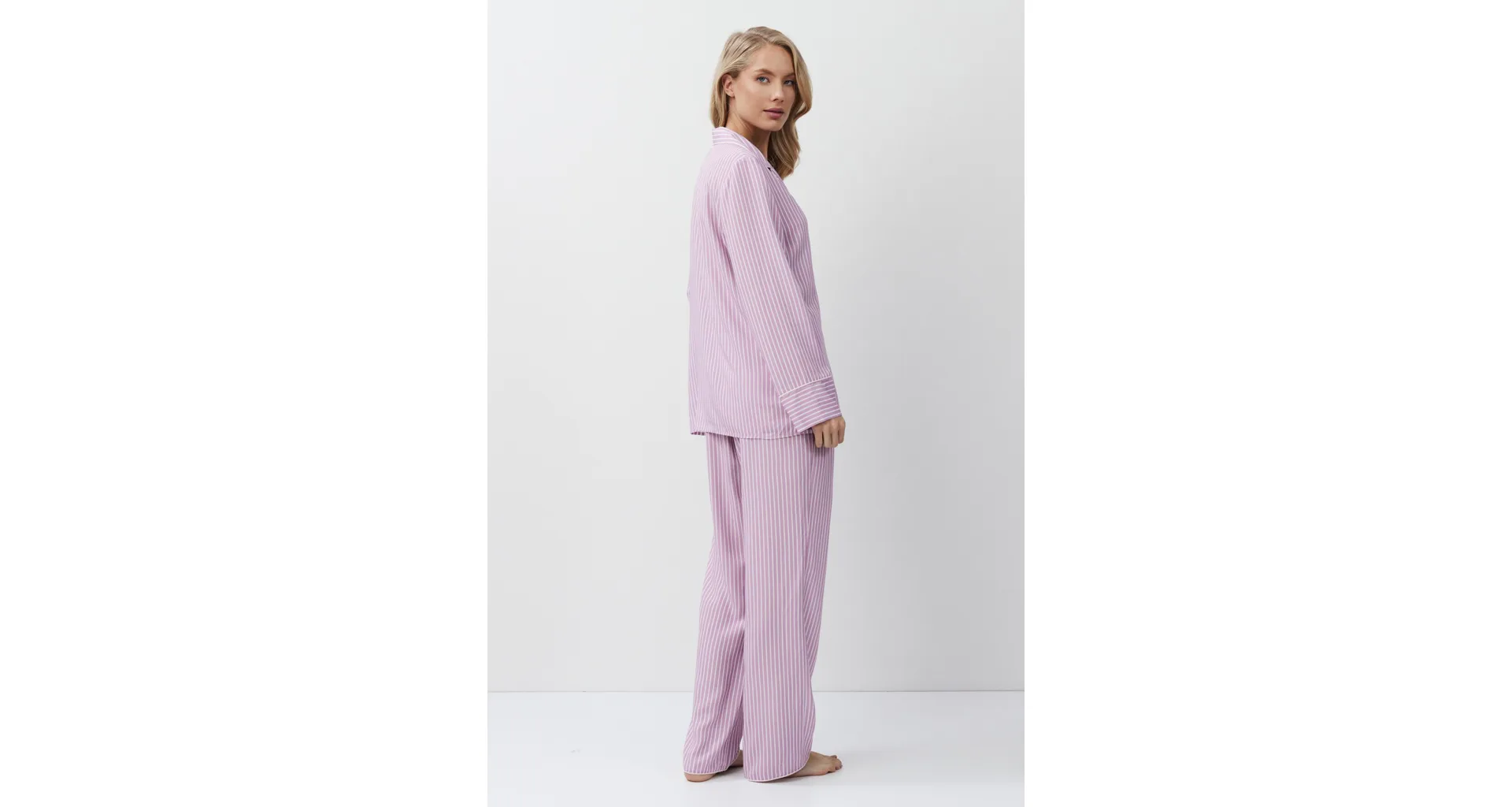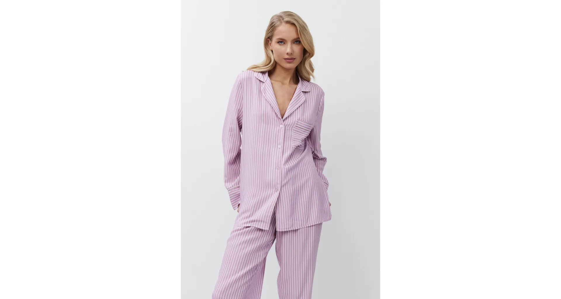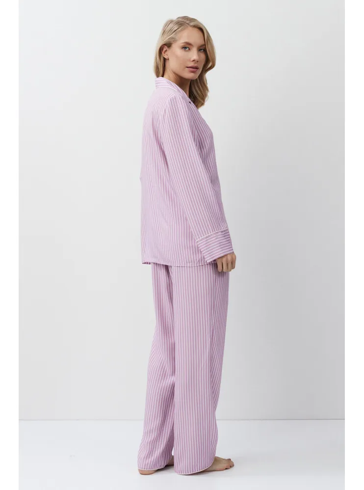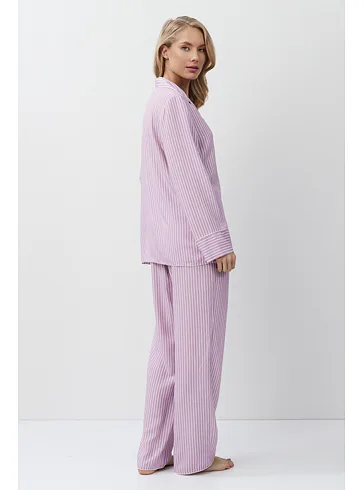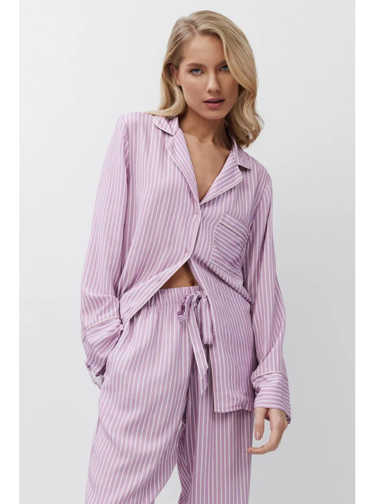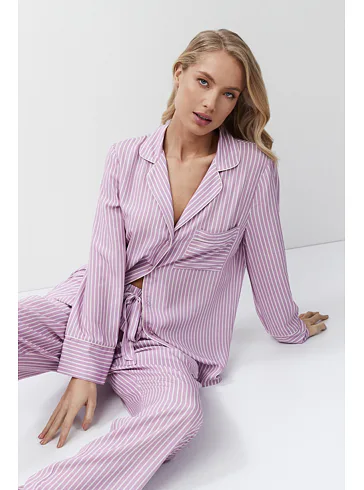 Dopřejte si pruhované dámské pyžamo pro klidné noci a sladké sny. Košile s dlouhým rukávem zaujme límcem ve tvaru V a knoflíkovou přední částí. Dlouhé kalhoty mají v pase praktické zavazování. Ideální pro celoroční využití.
