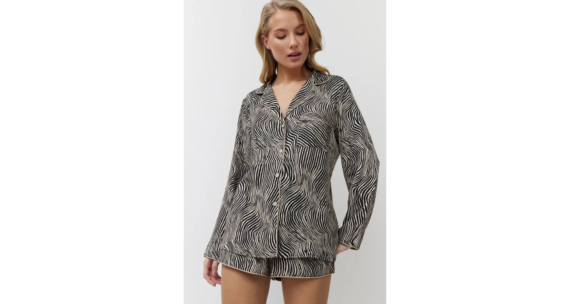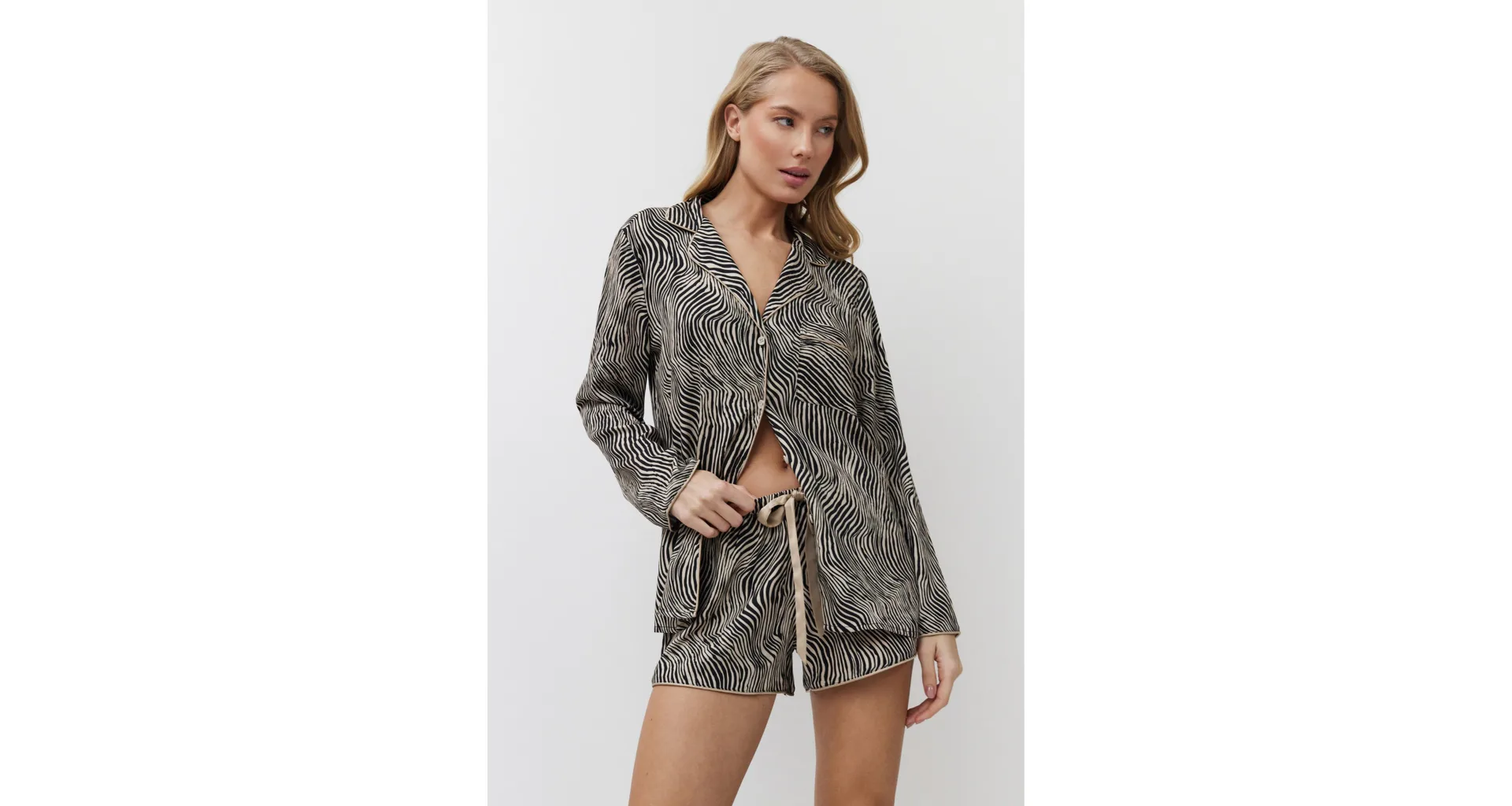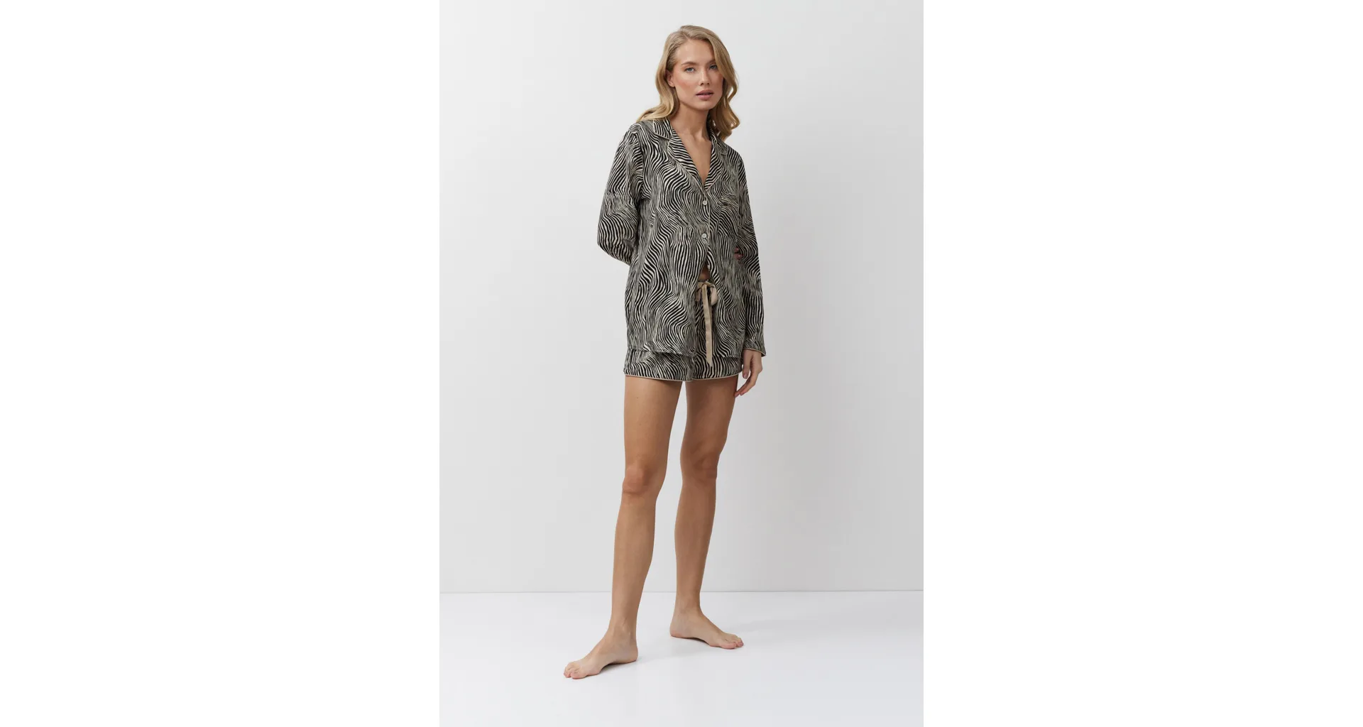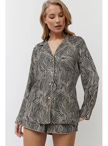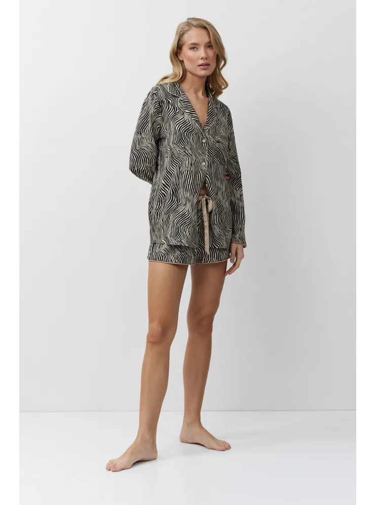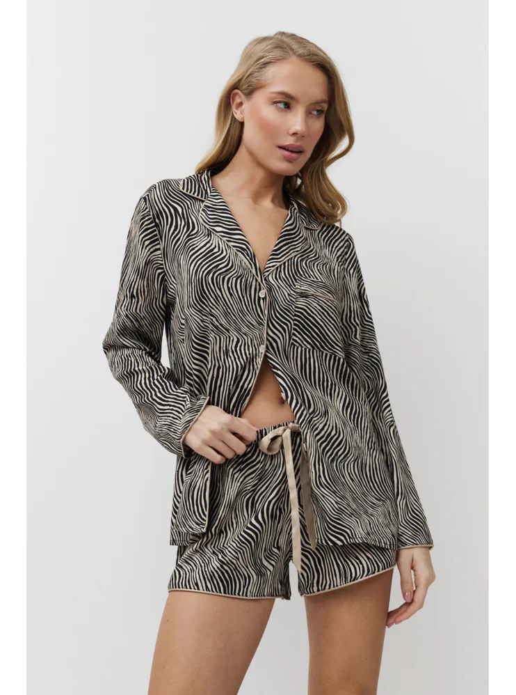 Dámský pyžamový komplet tvoří košile s dlouhým rukávem a krátké kraťasy. Košile má praktické zapínání na knoflíky a kraťasy lze utáhnout páskem pro optimální přizpůsobení vaší postavě. Zebří vzor dodává pyžamu stylový a exotický vzhled.