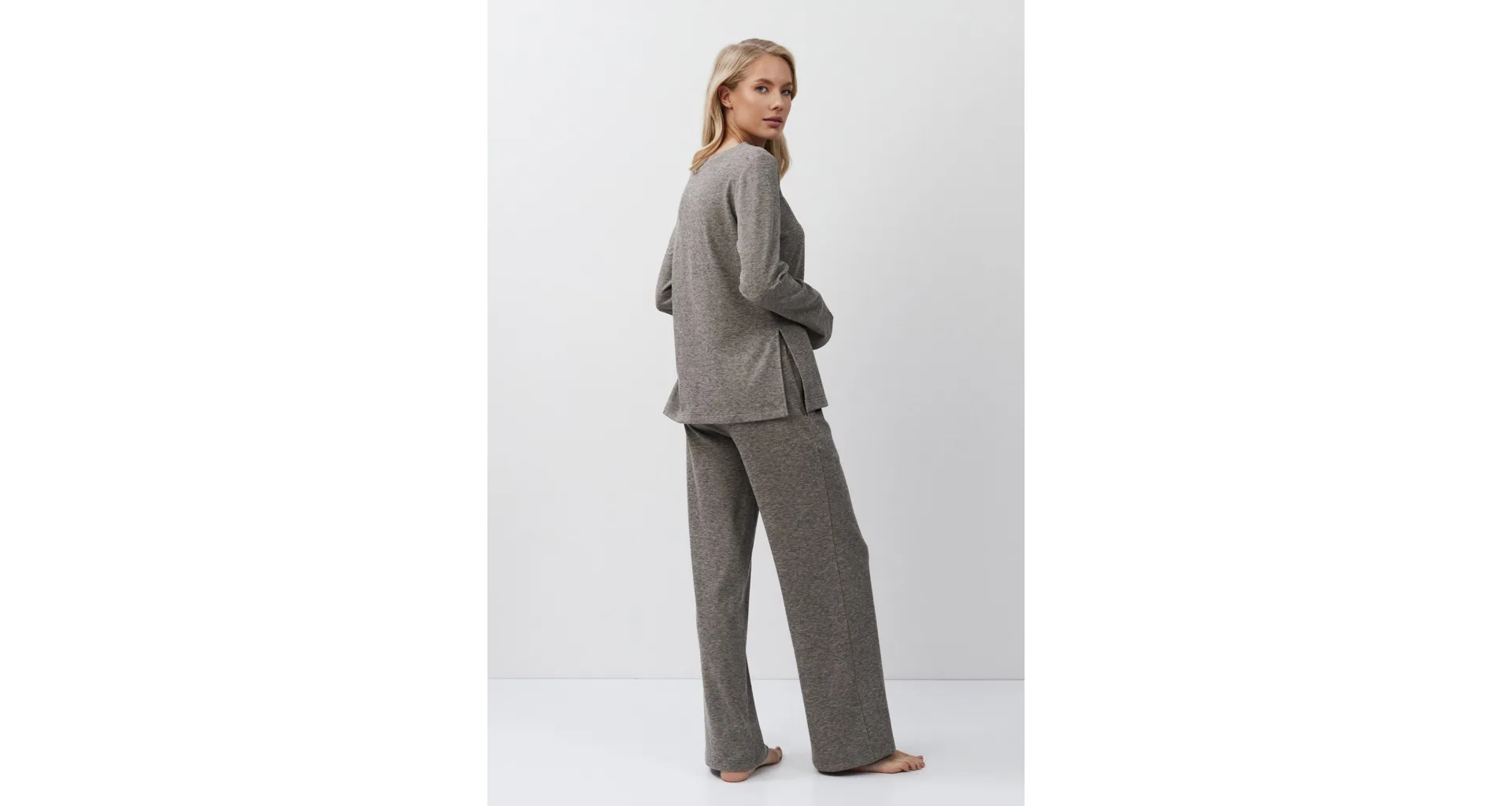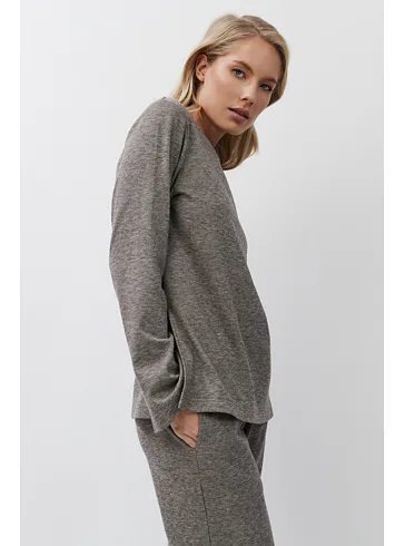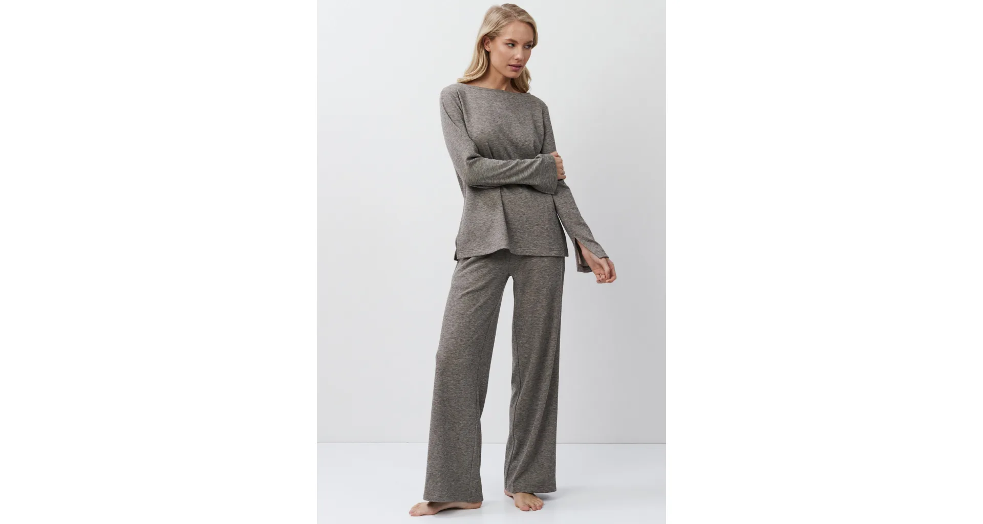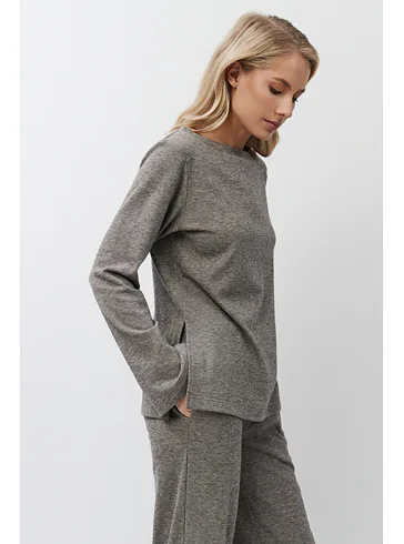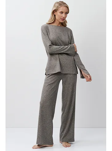Stylový domácí oděv je vyroben z příjemné látky s jemnou proužkovanou strukturou. Zajistí vám pohodlí při celodenním nošení. Moderní rozparky po stranách dodávají hornímu dílu šmrnc. Kalhoty mají praktické kapsy pro uložení drobností. Pořiďte si atraktivní outfit z limitované kolekce Aruelle.