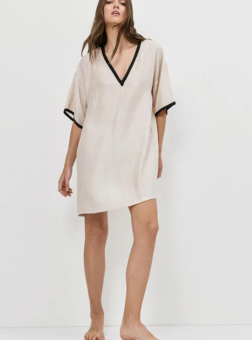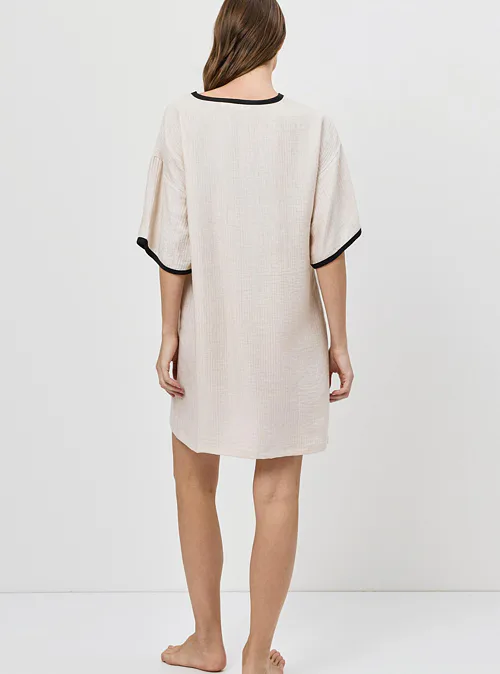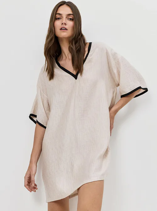 Plážové šaty jsou praktický a zároveň stylový doplněk pro letní dny strávené u vody. Jednoduše je obléknete přes plavky a během chvíle vytvoříte letní outfit vhodný na pláž, k bazénu nebo na promenádu. Šaty zaujmou decentním černým lemováním ve výstřihu a na rukávech.