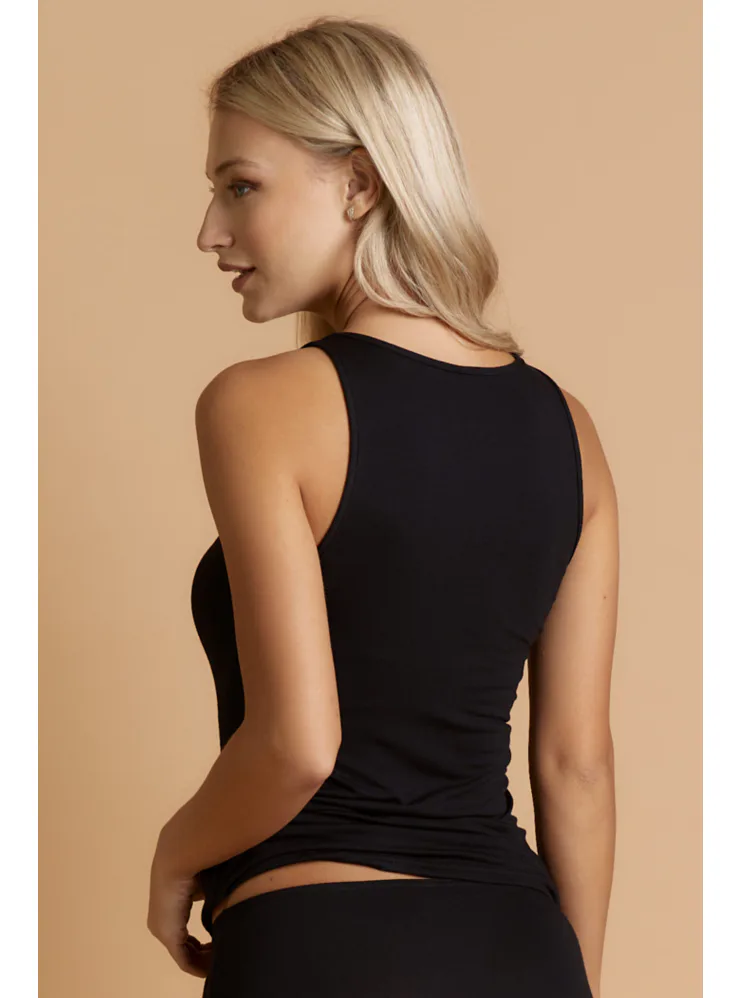Dámské tílko z exkluzivního modalového úpletu je vysoce příjemné na dotek a zajišťuje maximální pohodlí při nošení. Díky své prodyšnosti dobře odvádí vlhkost, což oceníte zejména v teplejších měsících, naopak v chladných dnech vás tílko krásně zahřeje. Tílko v černé barvě se snadno kombinuje s různými kousky oblečení a lze nosit po celý rok. Navíc modal se méně mačká než jiné přírodní materiály, často se tak nemusí ani žehlit.