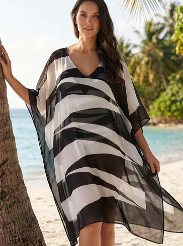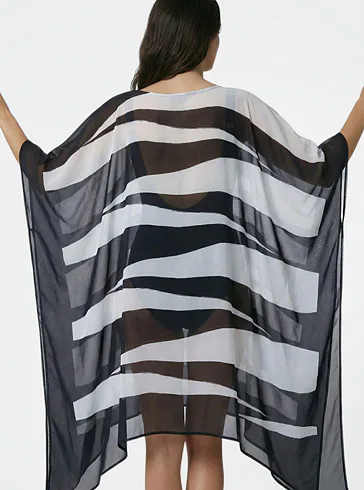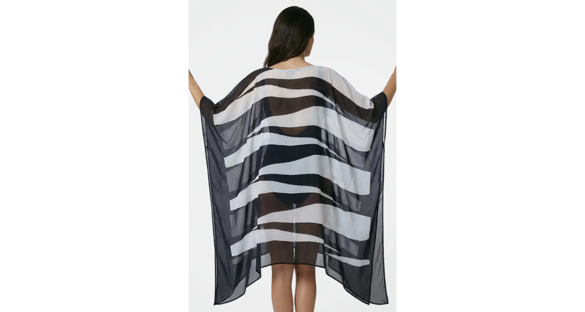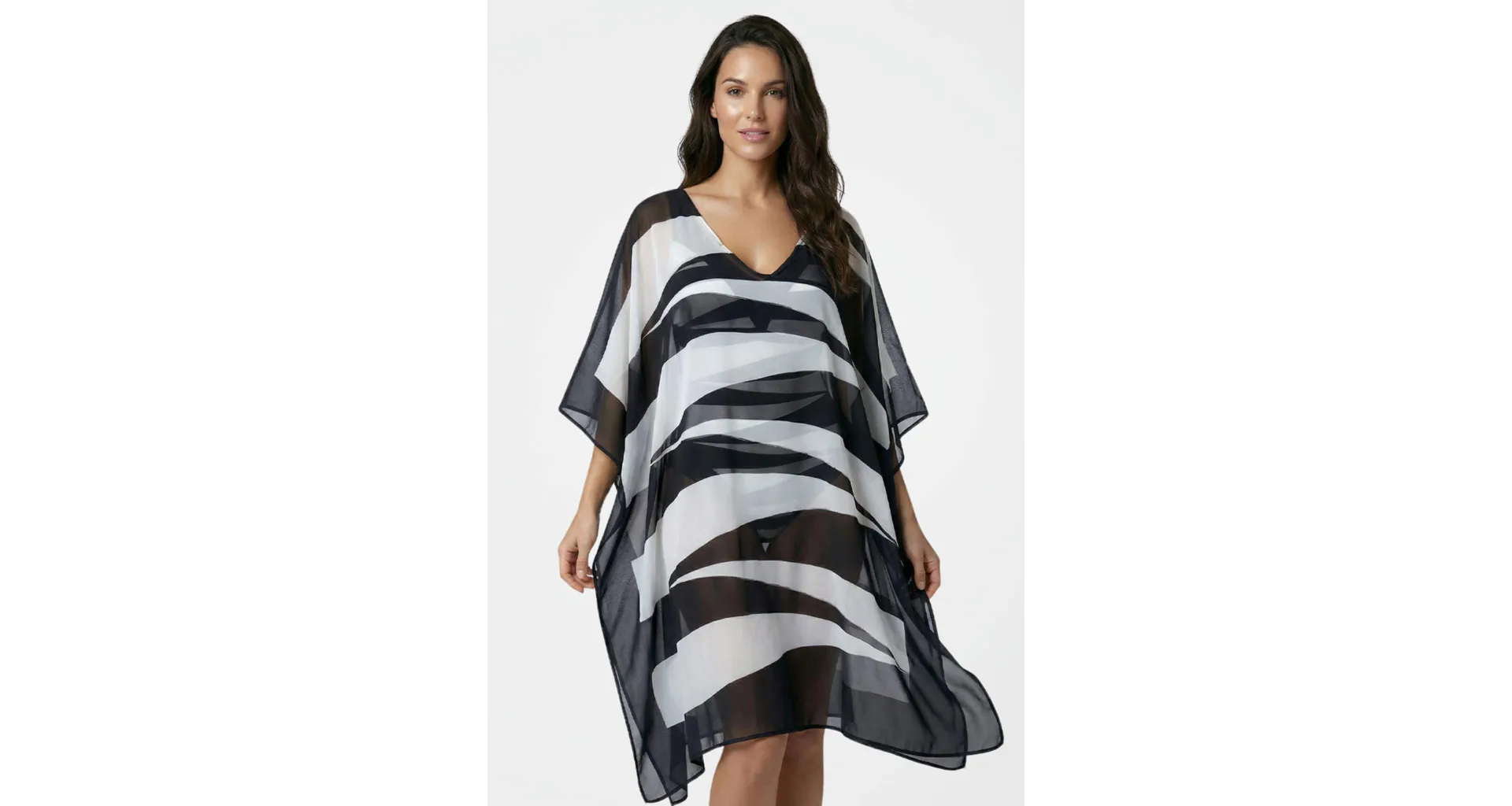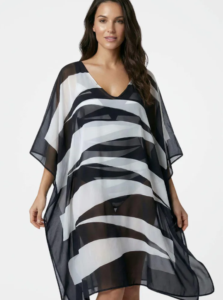 Hledáte stylový přehoz přes plavky? Právě jste ho našla. Elegantní kaftan zaujme výrazným černobílým vzorem inspirovaným zebřími pruhy. Díky volnému střihu se pohodlně obléká přes plavky. Pořiďte si na letní dovolenou kaftan v univerzální velikosti.