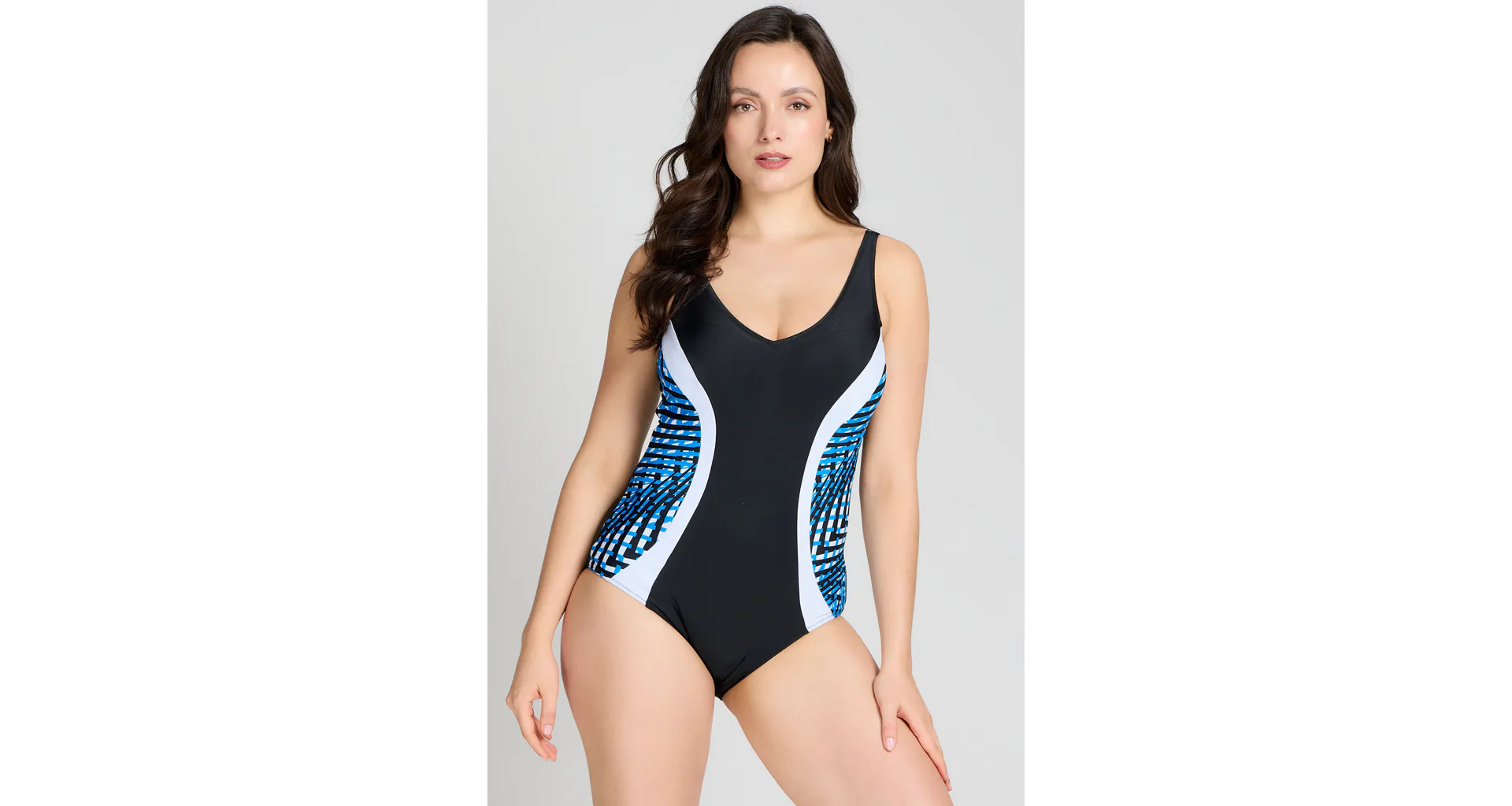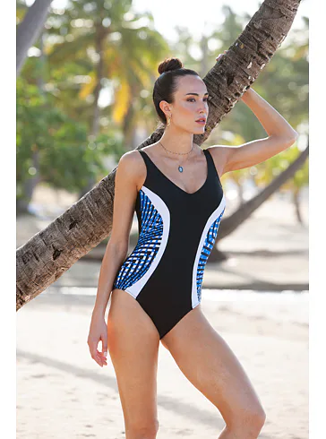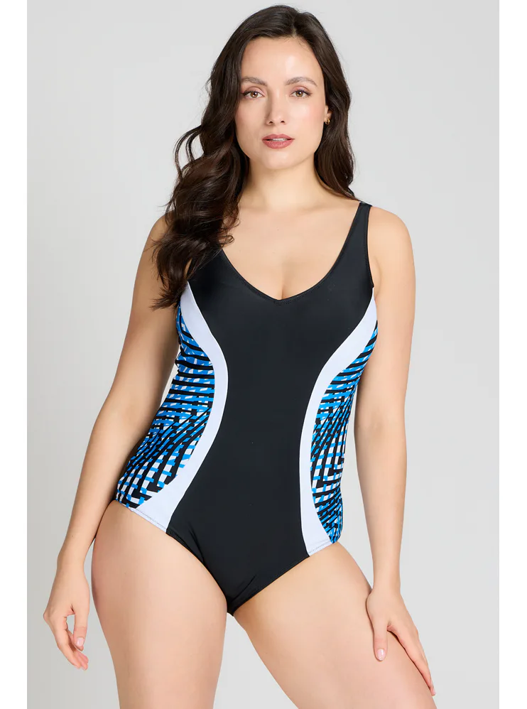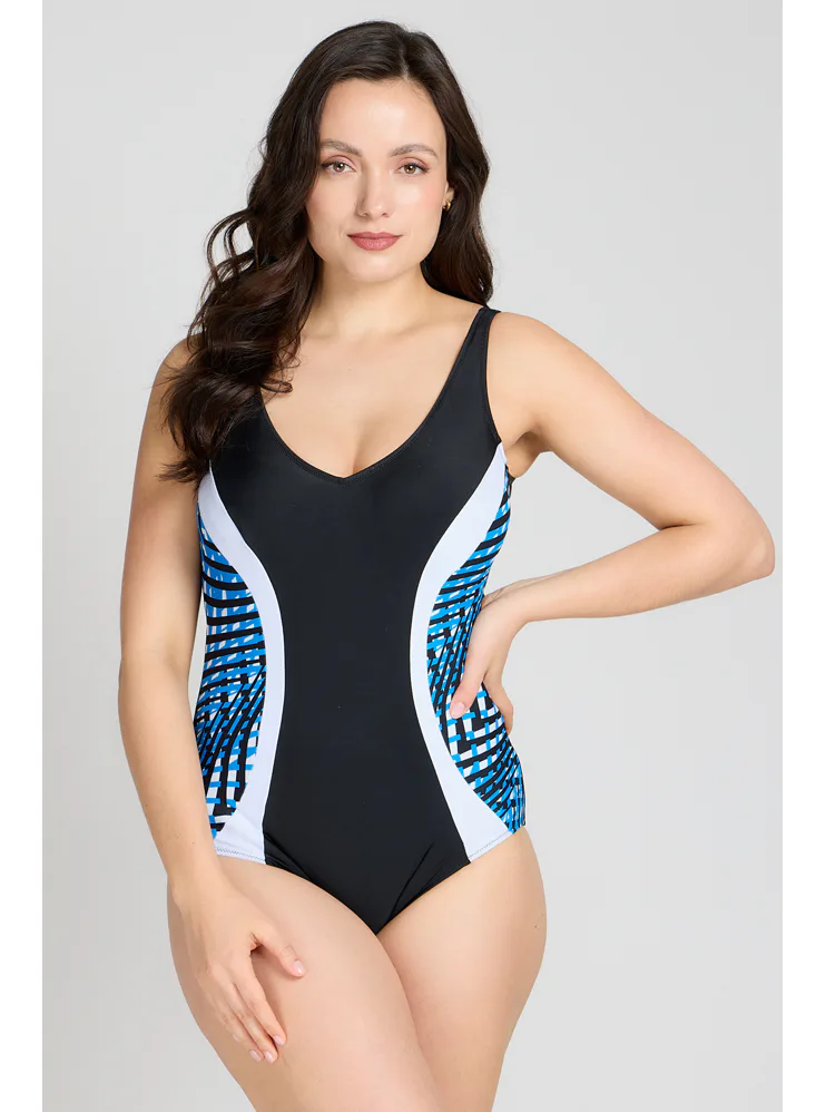 Dámské jednodílné plavky bez kostic dokonale padnou každé postavě. Okouzlí vás kontrastními barvami a geometrickým vzorem, který opticky zeštíhlí postavu. Lehce vyztužené košíčky poskytnou potřebnou oporu a nijak neomezují v pohodlí. Výstřih do písmene V vykouzlí neodolatelný dekolt. Plavky mají širší ramínka a lze je pořídit až do velikosti 100. Připravte se s předstihem na letní dny strávené u vody a pořiďte si elegantní dámské plavky.