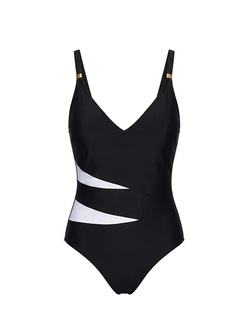 Jednodílný střih schová bříško a zakryje drobné nedokonalosti. Plavky zaujmou bílým geometrickým vzorem v oblasti pasu, který vytváří opticky zeštíhlující efekt. Nastavitelná ramínka zdobí elegantní zlaté kovové detaily, které plavkám dodávají luxusní vzhled.