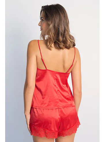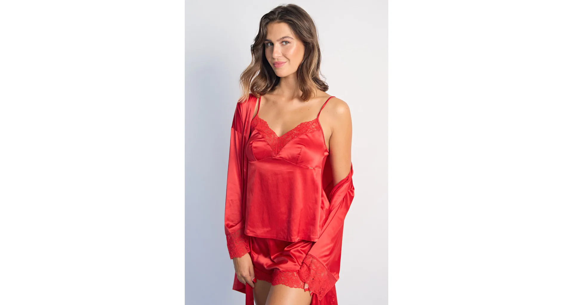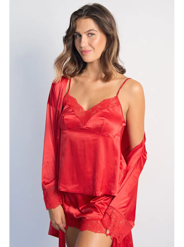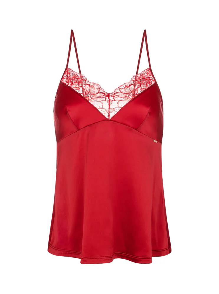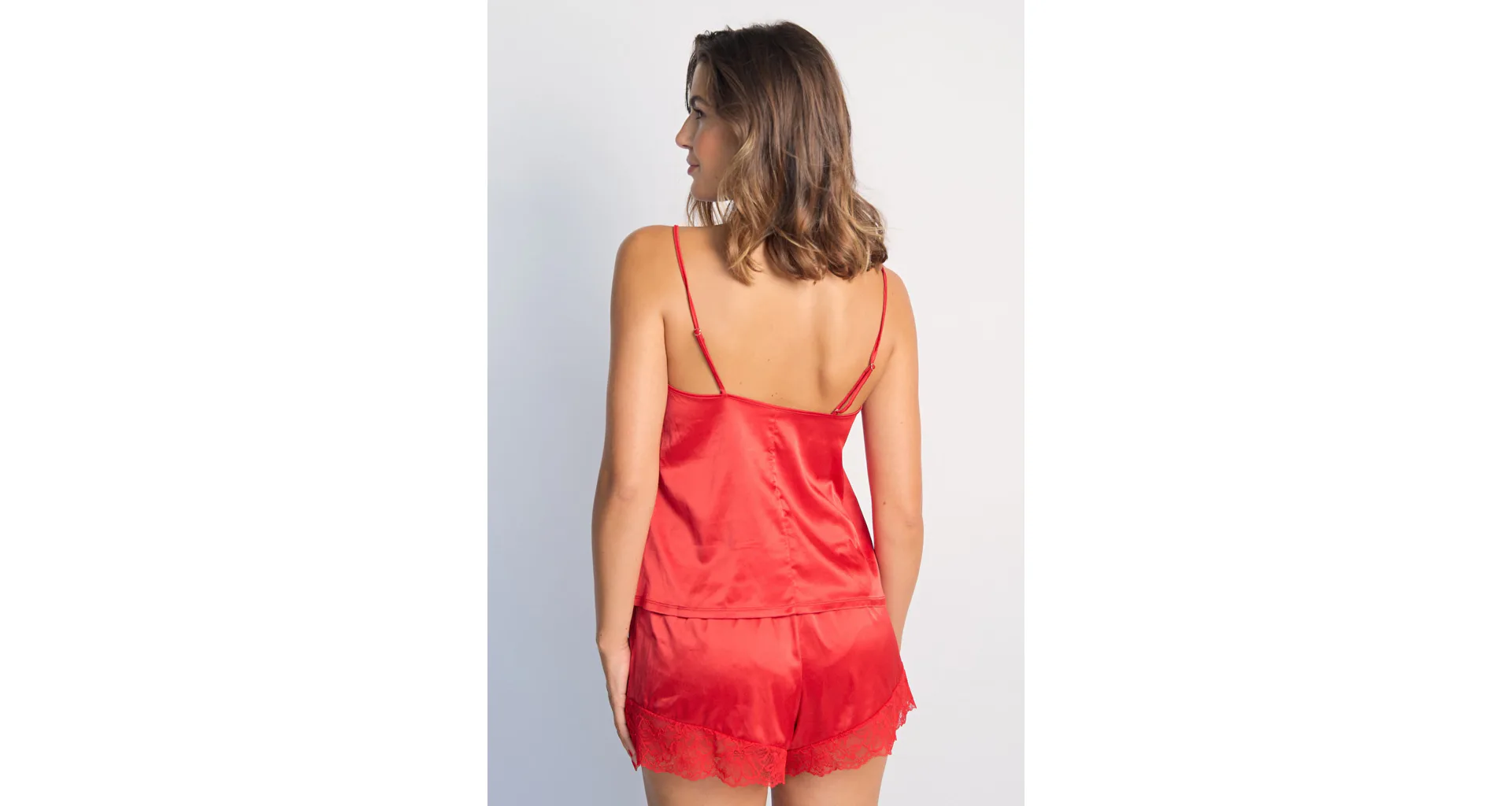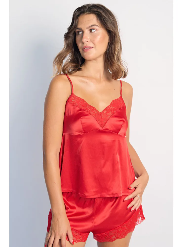 Červené tílko má nastavitelná ramínka, díky kterým si snadno nastavíte hloubku dekoltu. Saténové tílko příjemně chladí a je hebké na dotek. Ve výstřihu má něžnou krajku, která mu dodává romantický nádech. Lze si pořídit i červené šortky a mít tak kompletní set.