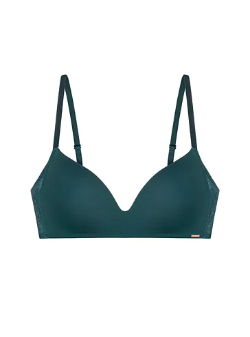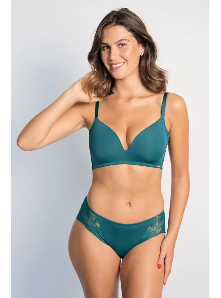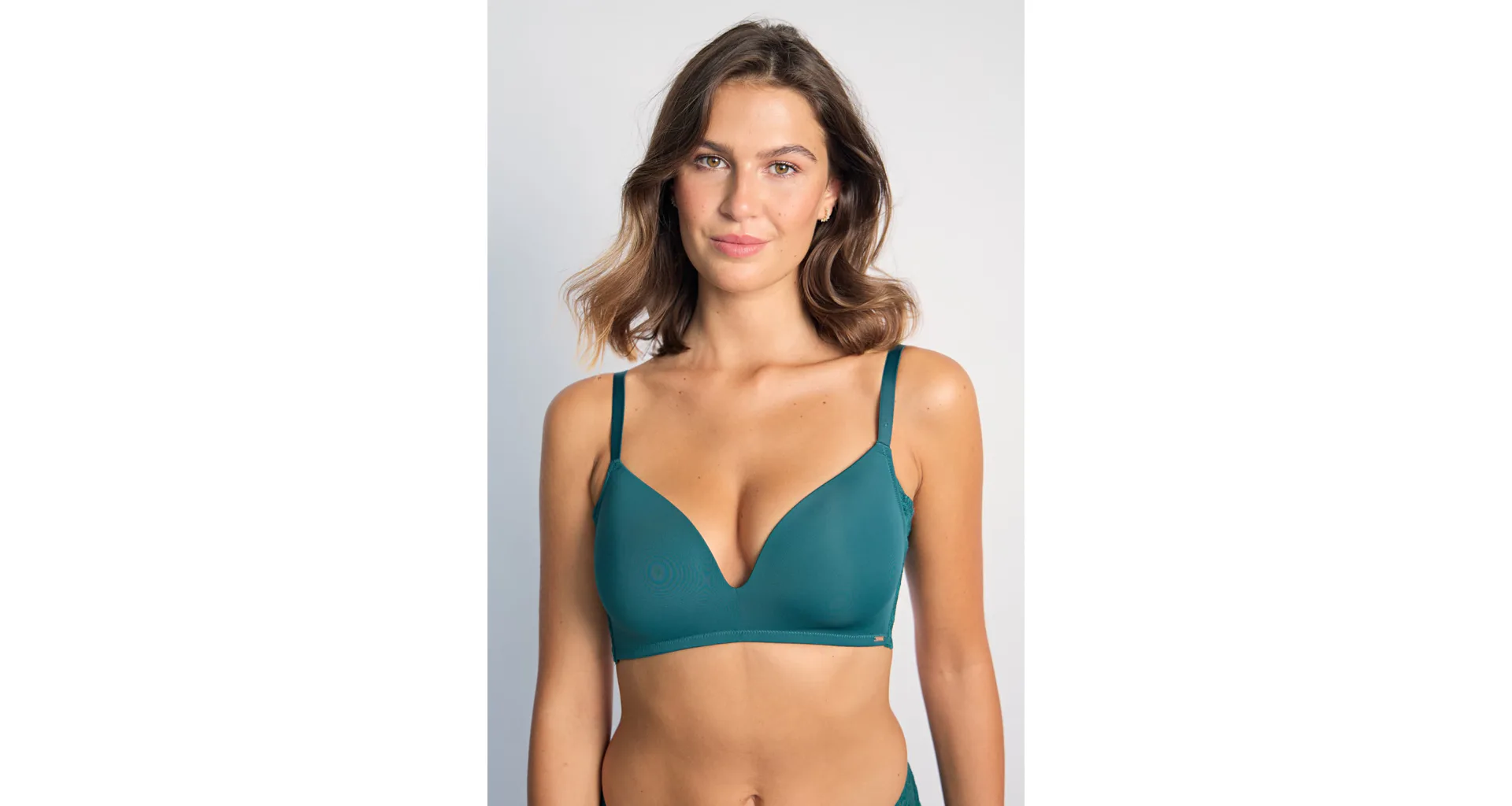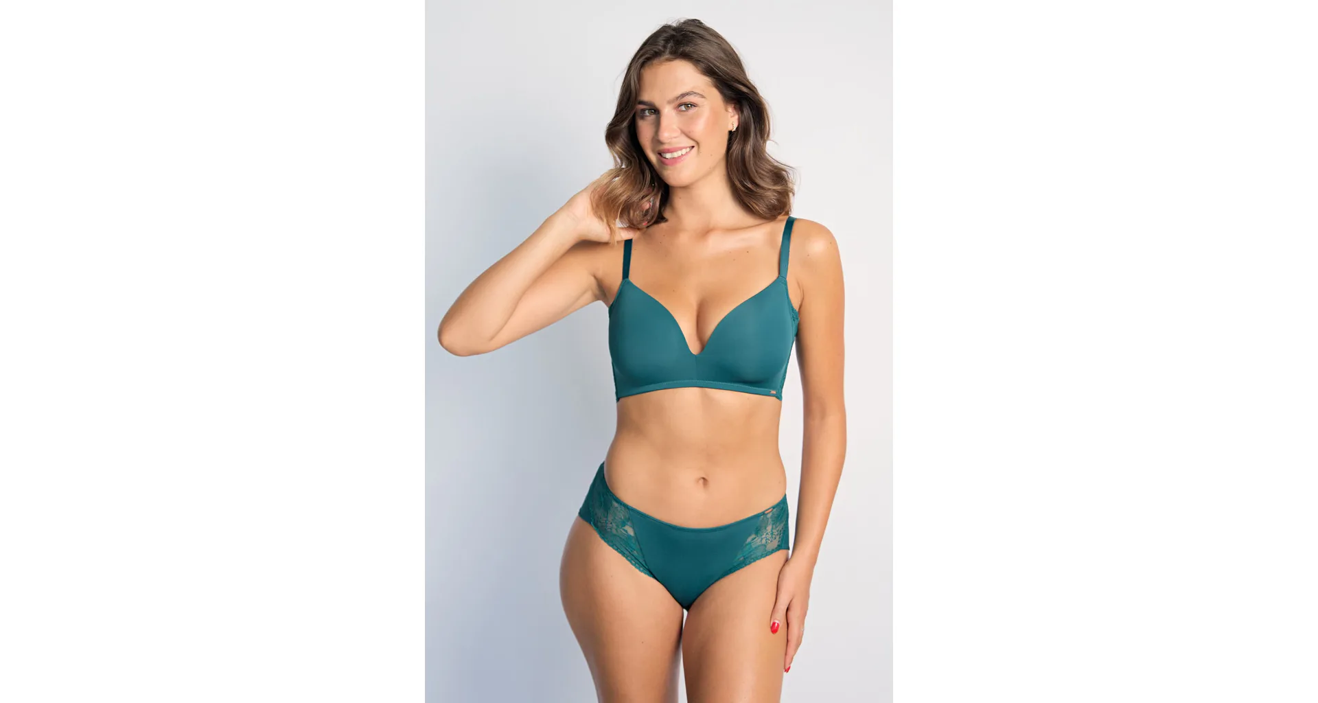Tence vyztužená zelená podprsenka bez kostic nikde netlačí, nezařezává se a zajišťuje poprsí dostatek opory. Koše podprsenky tvoří speciální pěna , která se přizpůsobí tvaru prsa. Flexibilní výztuha nahrazuje boční kostice. Díky hladkému provedení se nerýsuje pod oblečením. K této podprsence si lze pořídit kalhotky ve stejném designu.