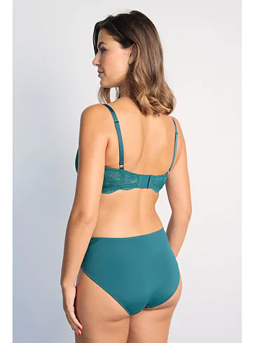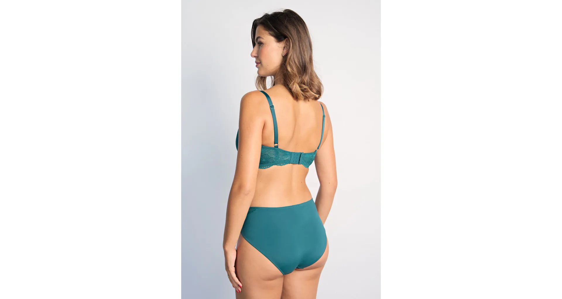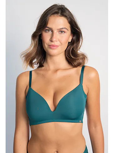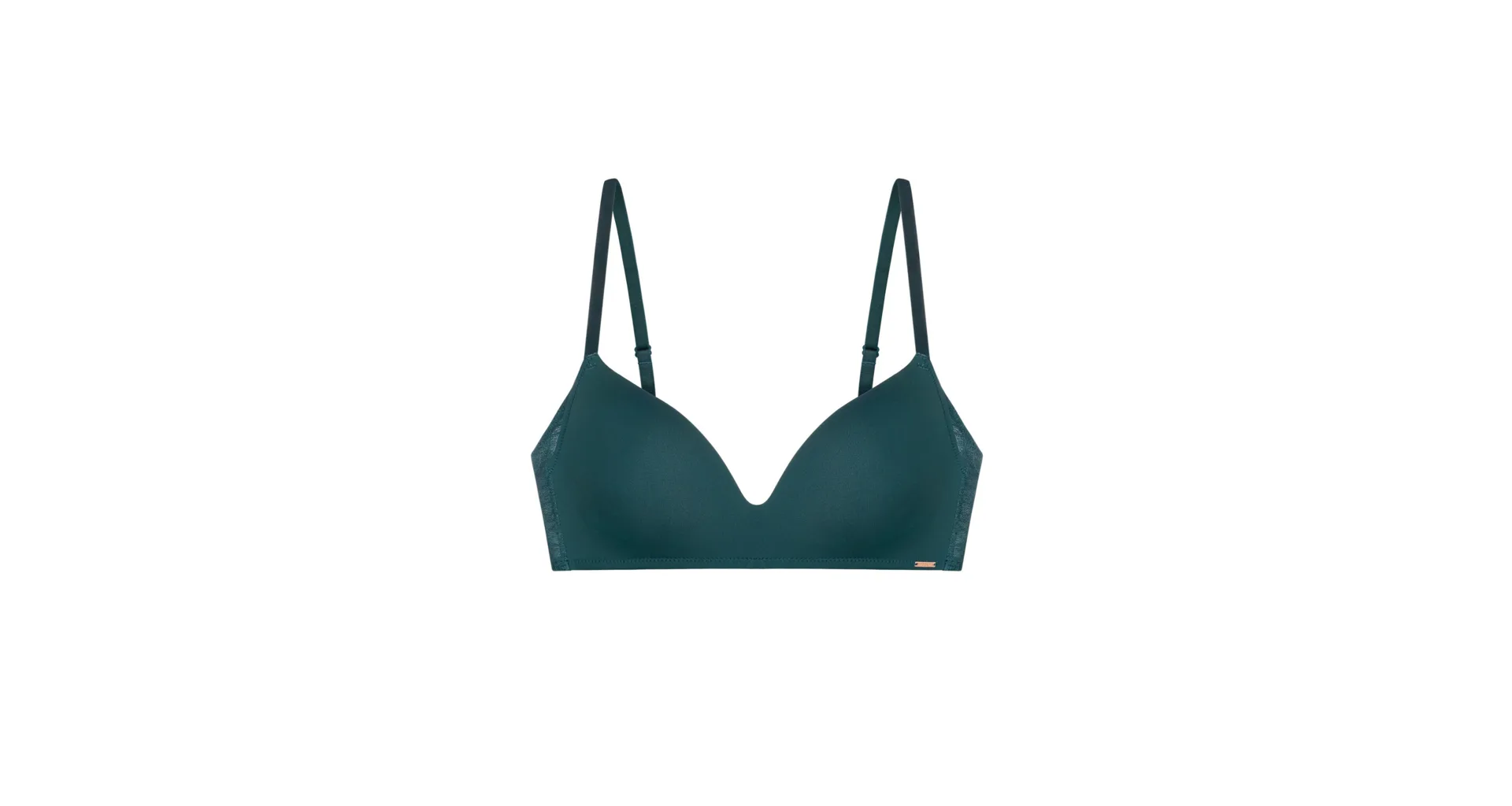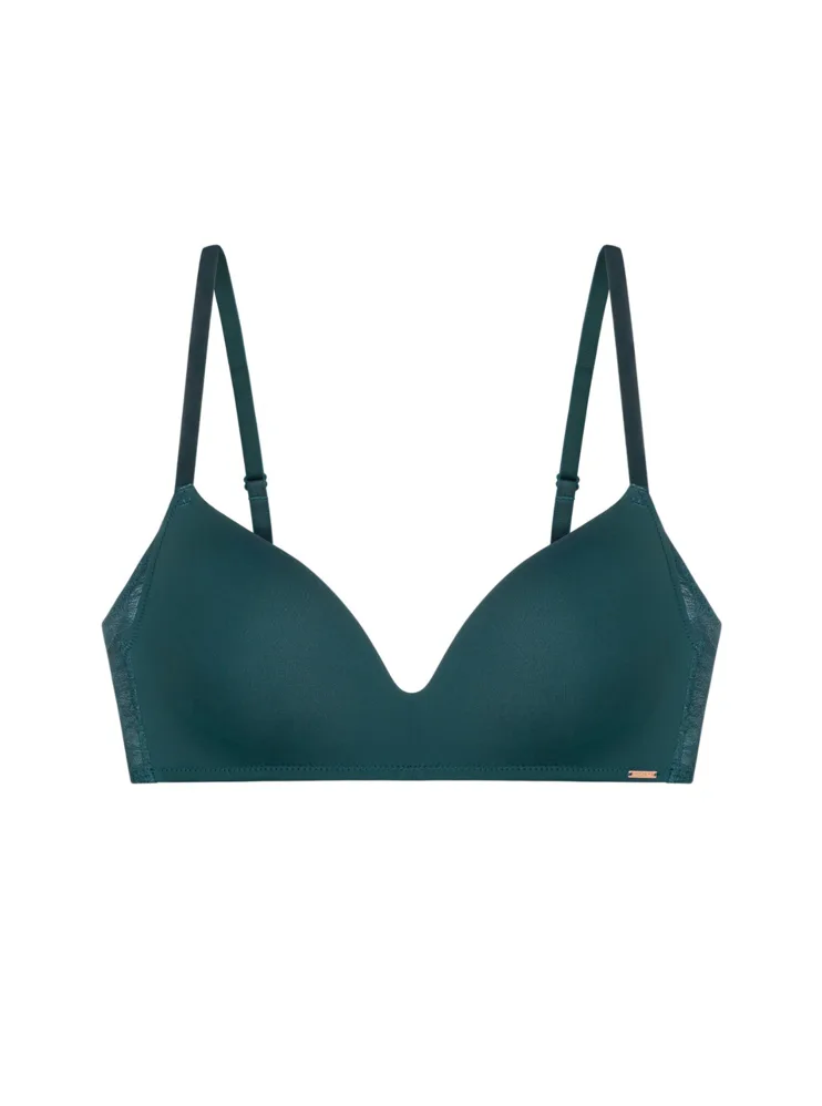 Tence vyztužená zelená podprsenka bez kostic nikde netlačí, nezařezává se a zajišťuje poprsí dostatek opory. Koše podprsenky tvoří speciální pěna , která se přizpůsobí tvaru prsa. Flexibilní výztuha nahrazuje boční kostice. Díky hladkému provedení se nerýsuje pod oblečením. K této podprsence si lze pořídit kalhotky ve stejném designu.