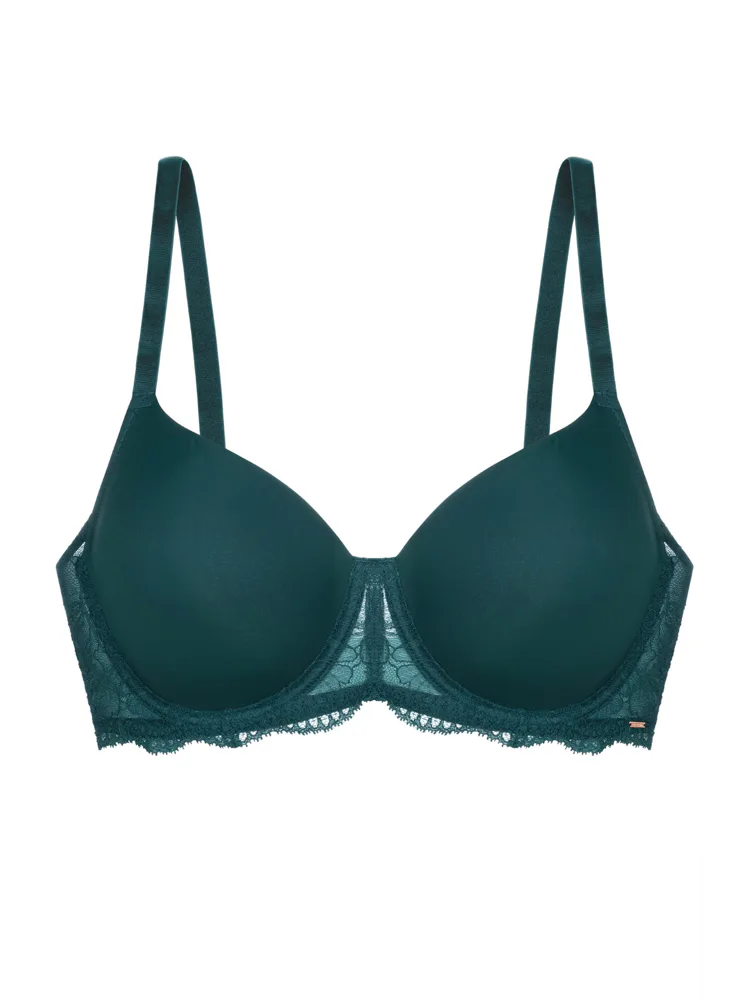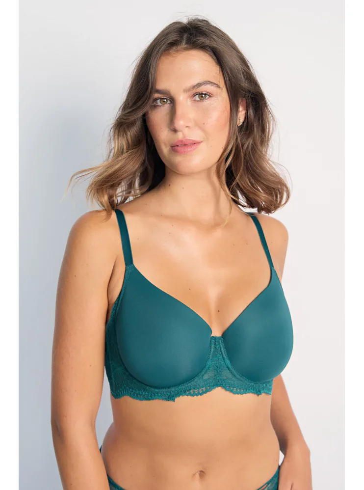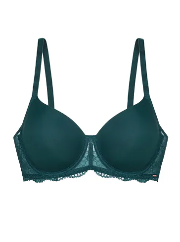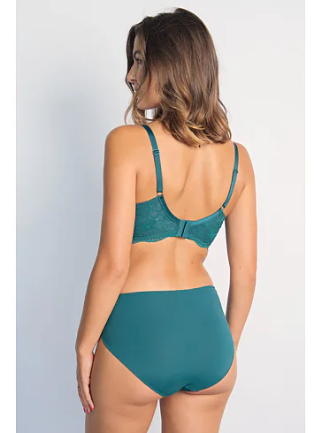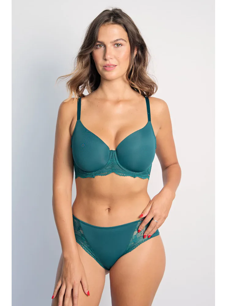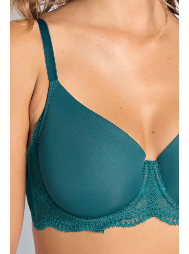 Podprsenka Dorina v zelené barvě s kosticemi zaujme na první pohled romantickou krajkou. Vyrobena je z ekologického mikrovlákna s krajkou. Dopřejte si maximální komfort při celodenním nošení. Vyztužená podprsenka poskytne poprsí potřebnou oporu a udrží ňadra pevně na místě. K této podprsence si lze pořídit kalhotky ve stejném designu.