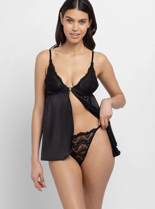 Užijte si intimní chvíle ve svůdném spodním prádle. Jemná košilka s krajkovým vrškem zvýrazní dekolt, lehce splývá po těle a díky zapínání vpředu se snadno obléká a svléká. Celokrajková tanga dodávají outfitu šmrnc.