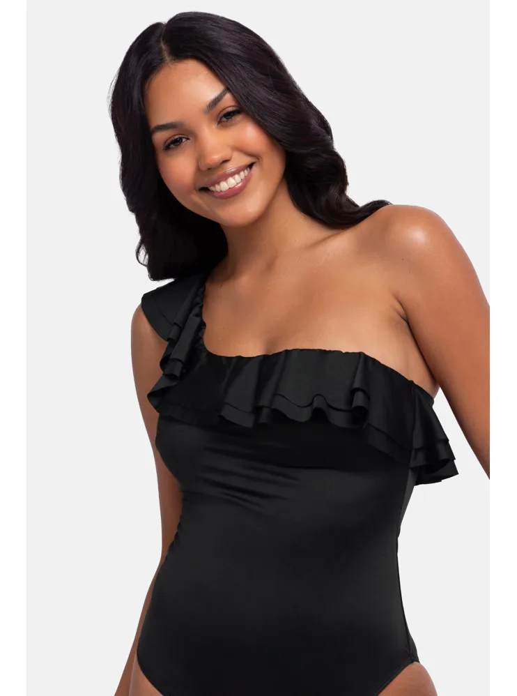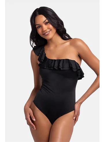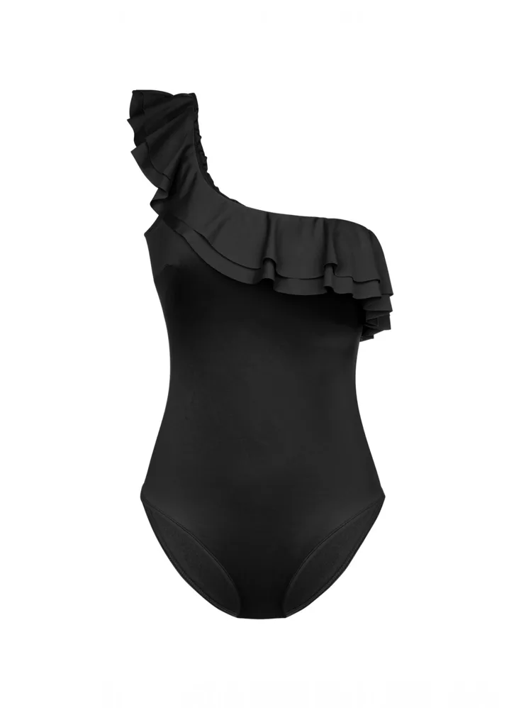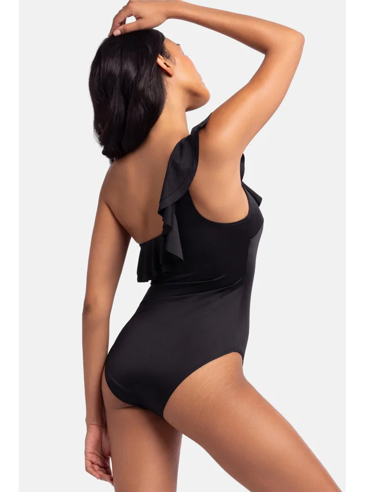 Černé jednodílné plavky na jedno rameno jsou ideální pro dny plné pohody a slunce u vody. Zaujmou ozdobným volánem, který dodává plavkám ženskost. Vyztužené košíčky zajišťují pohodlí, oporu a přirozeně tvarují poprsí, vycpávky lze odejmout. Vytvoří krásný dekolt, schovají oblast bříška a přizpůsobí se křivkám vašeho těla. Vsaďte na nadčasový design a perfektní střih, který lichotí každé postavě.