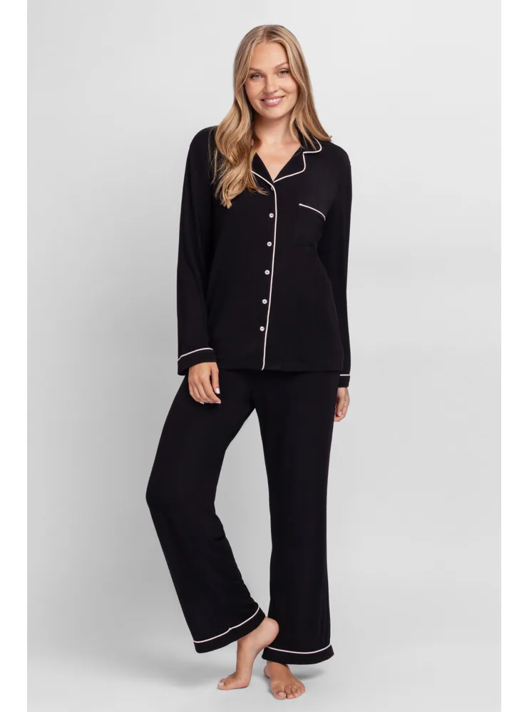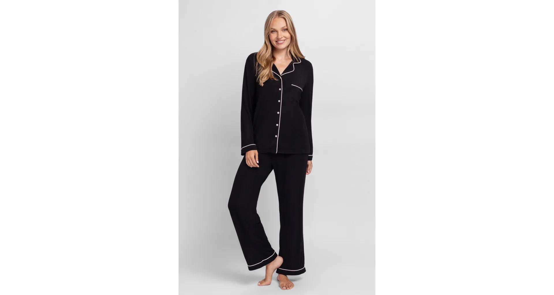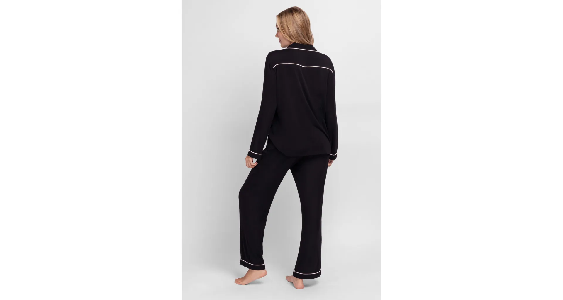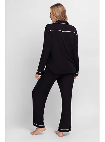 Dopřejte si pohodlí a styl i během spánku. Dlouhý černý pyžamový set se skládá z košile se zapínáním na knoflíky a kalhot rovného střihu. Decentní prošívání ve světle růžové barvě podtrhuje elegantní vzhled. Ideální na spaní nebo jako domácí oděv.