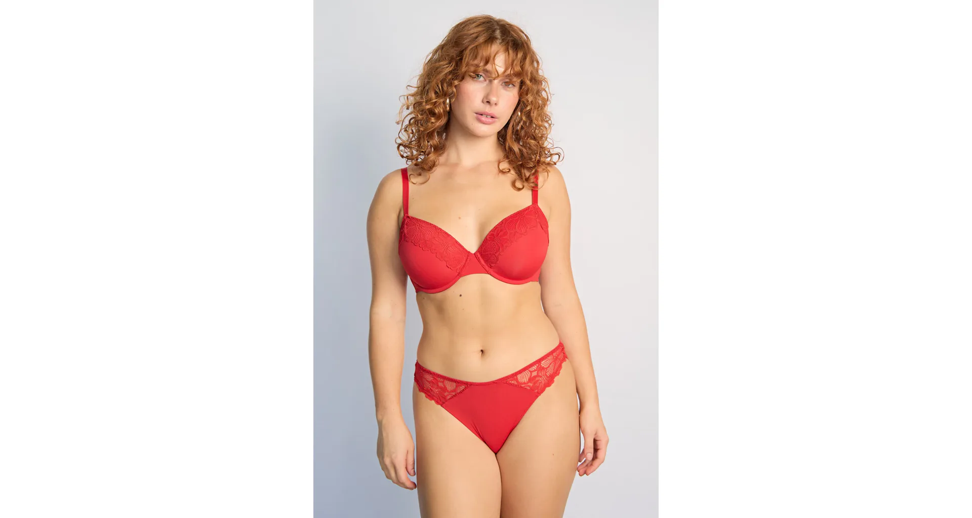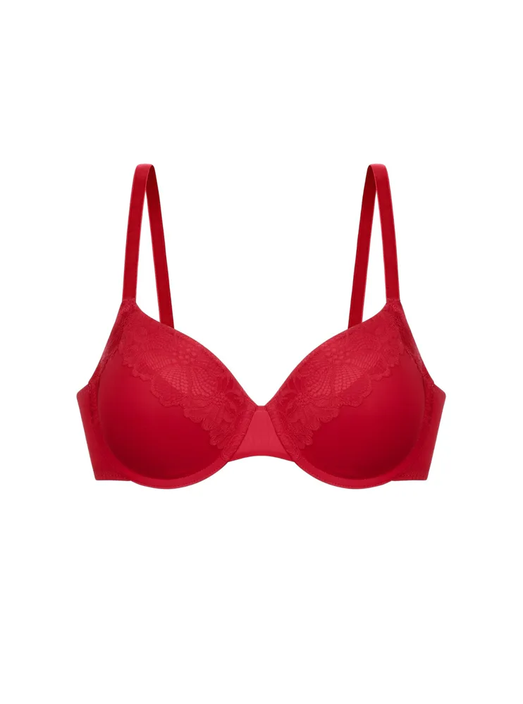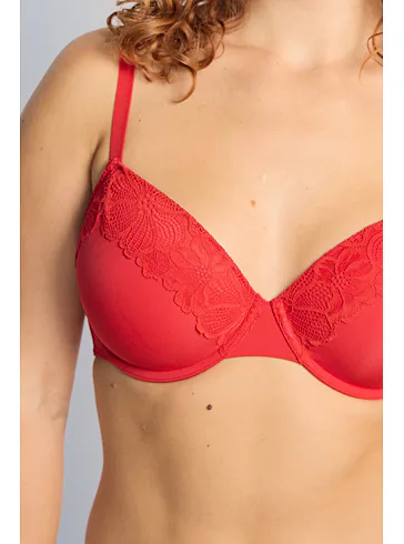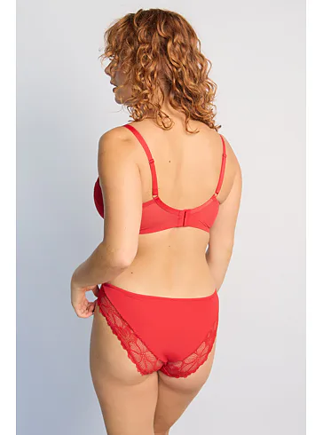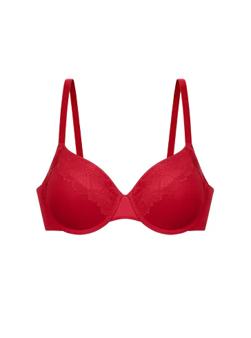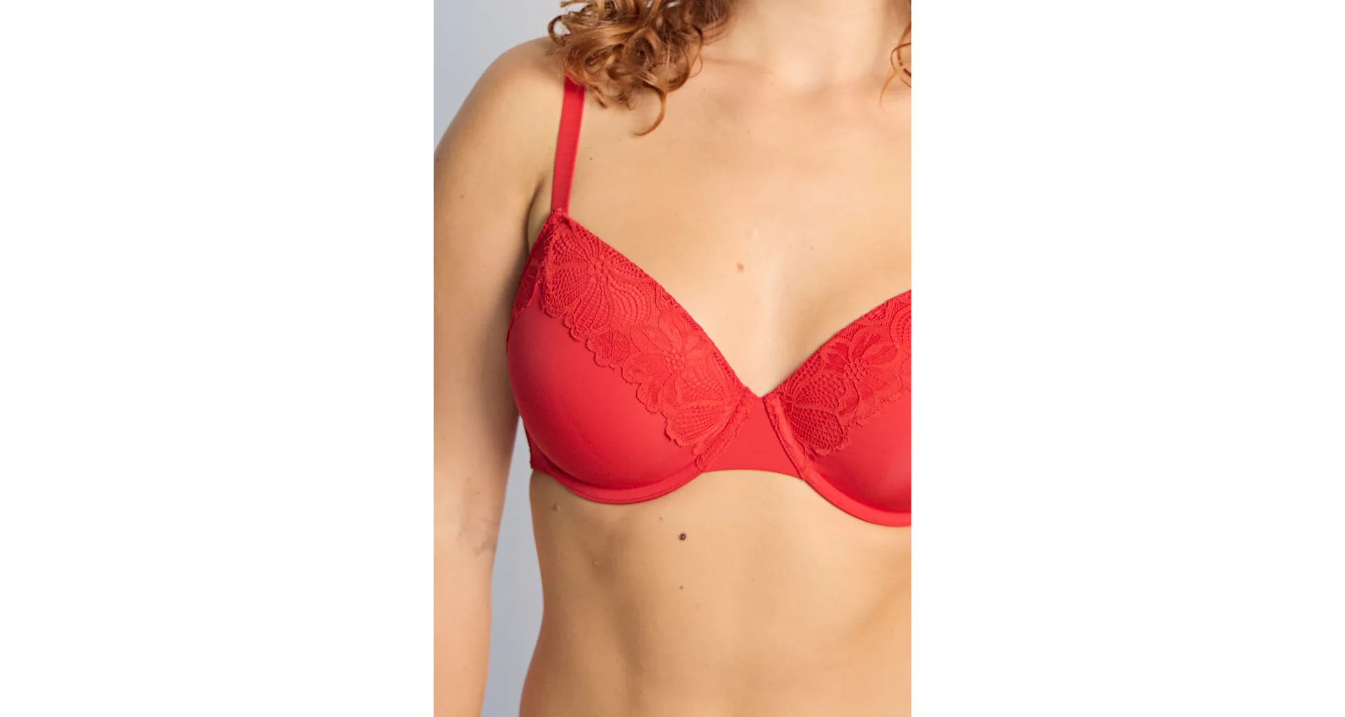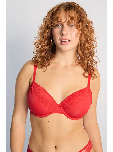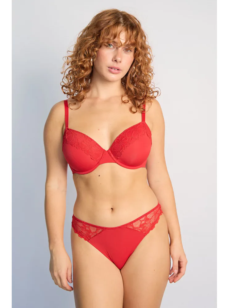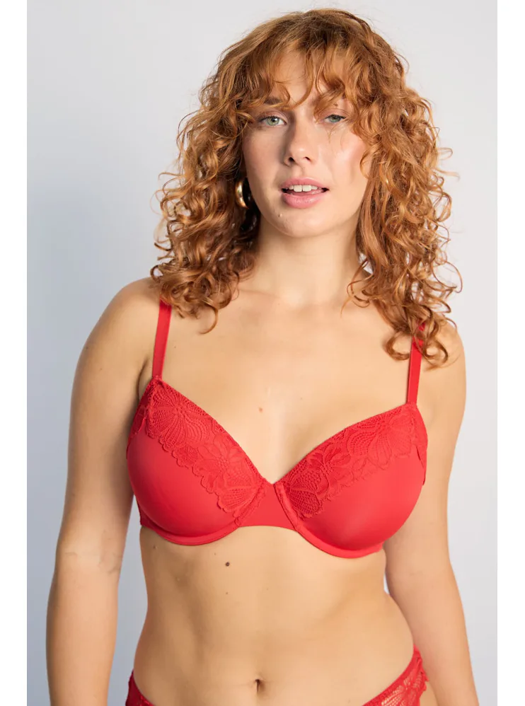 Červená podprsenka s krajkovým zdobením ve výstřihu a vyztuženými košíčky vykouzlí svůdný dekolt. Podprsenka Dorina je spojením pohodlného střihu a kvalitního zpracování z udržitelného materiálu. Udělejte si radost novým kouskem ve vaší šatní skříni. K této podprsence si lze pořídit kalhotky ve stejném designu.