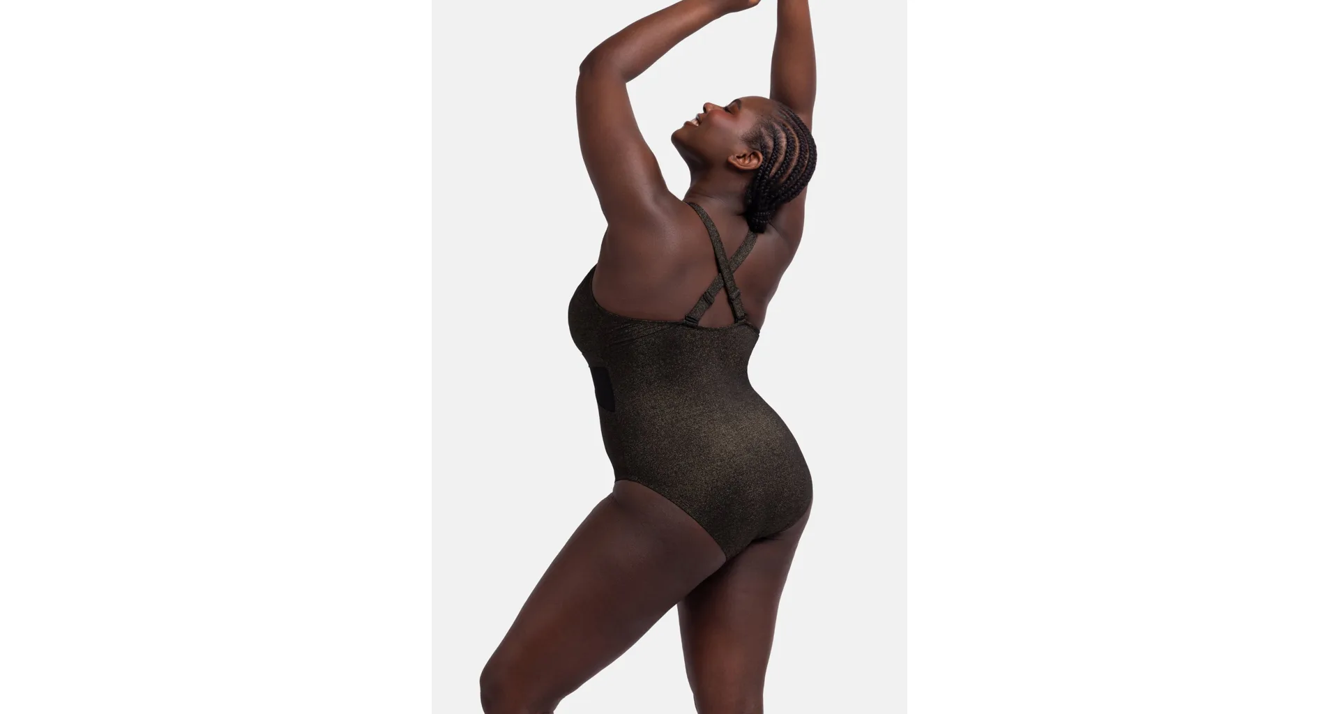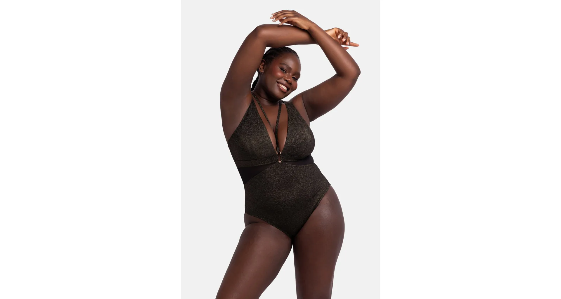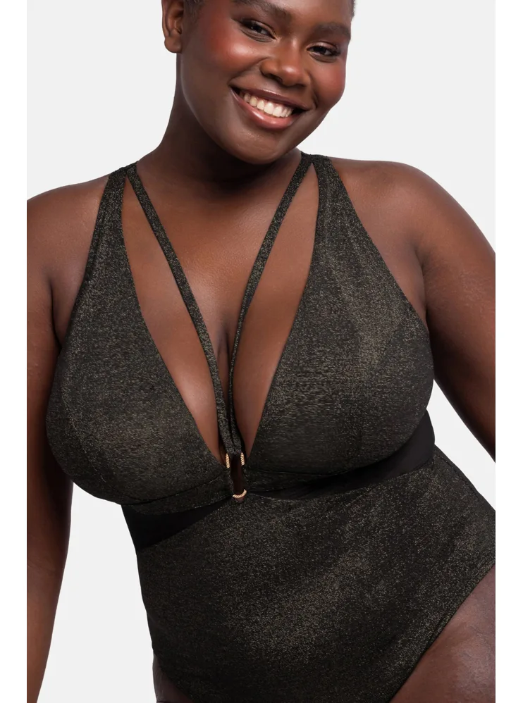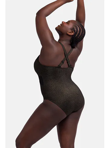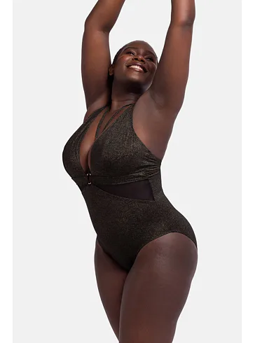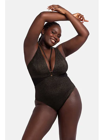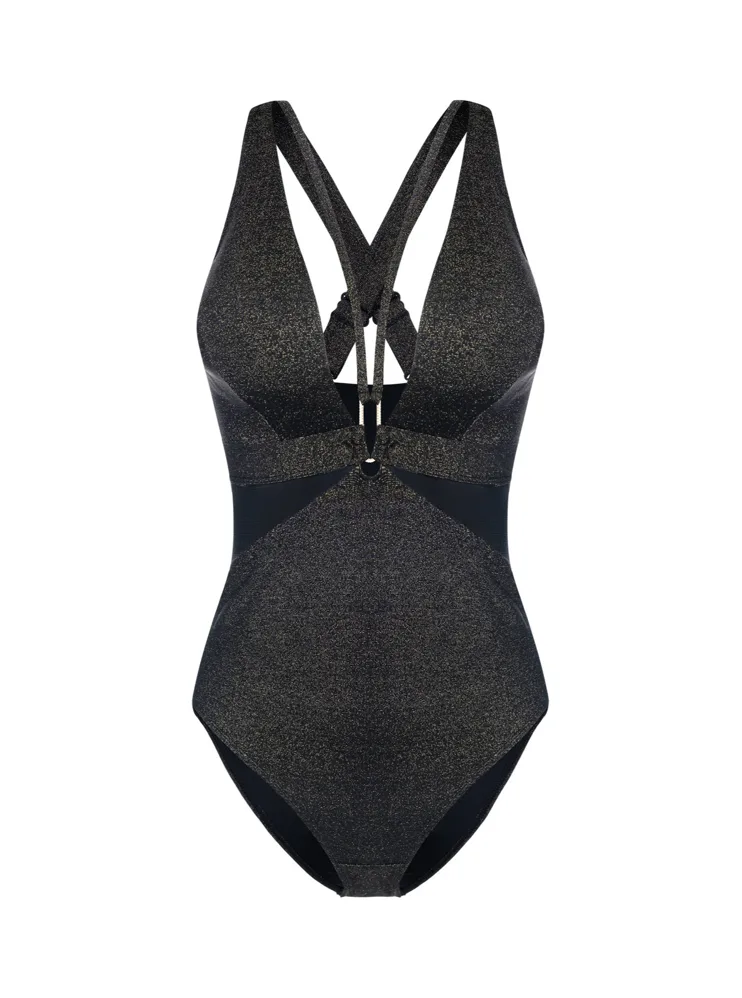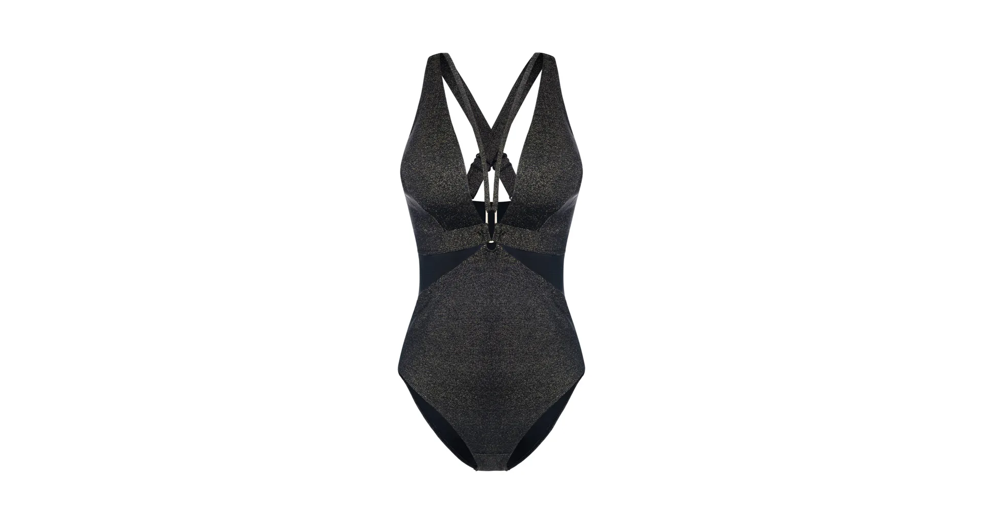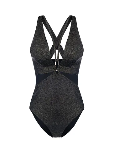 Třpytivé jednodílné plavky bez kostic zaujmou elegantním páskem a zlatým doplňkem ve výstřihu. Transparentní průstřihy na bocích dodávají plavkám svůdný vzhled. Plavky atypického střihu mají vyjímatelné vycpávky. Nastavitelná ramínka lze sepnout klasicky či do kříže. Lurexová tkanina je známá jemným třpytem a vysokou odolností proti opotřebení. Plavky jsou ideální jak na den strávený u vody, tak i na bazénovou párty.