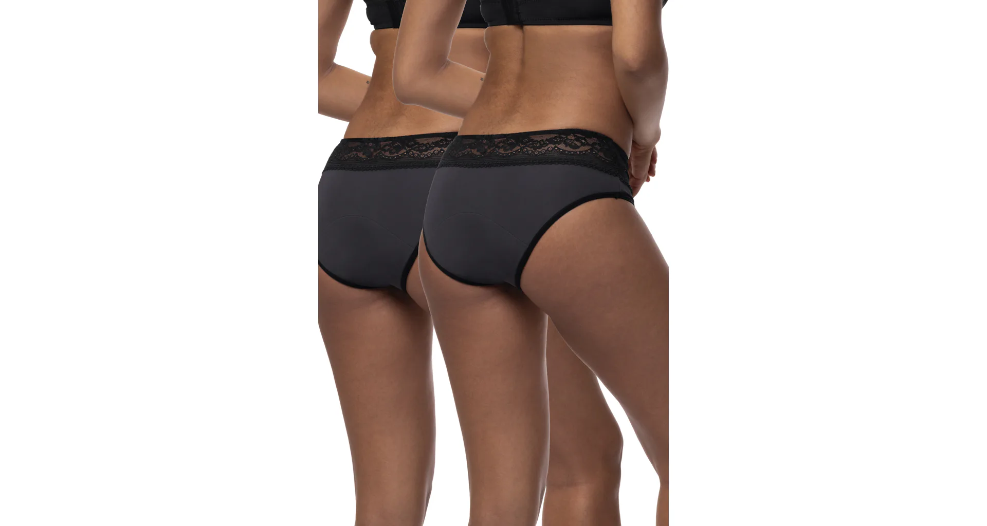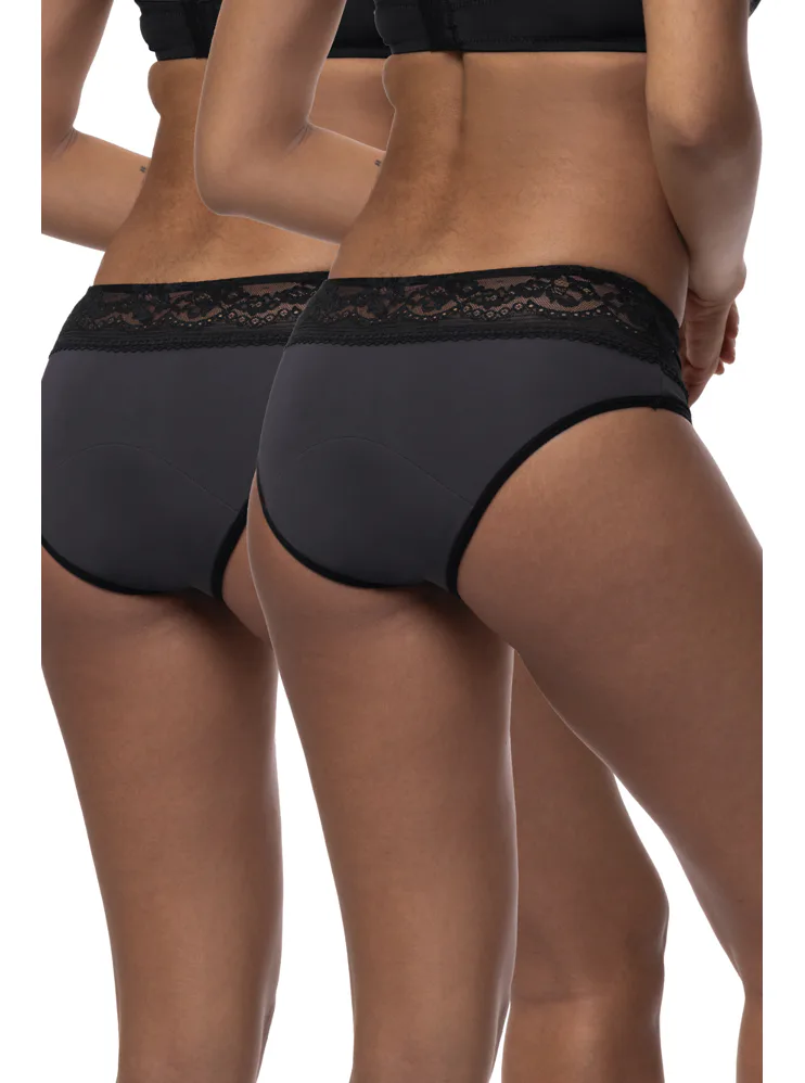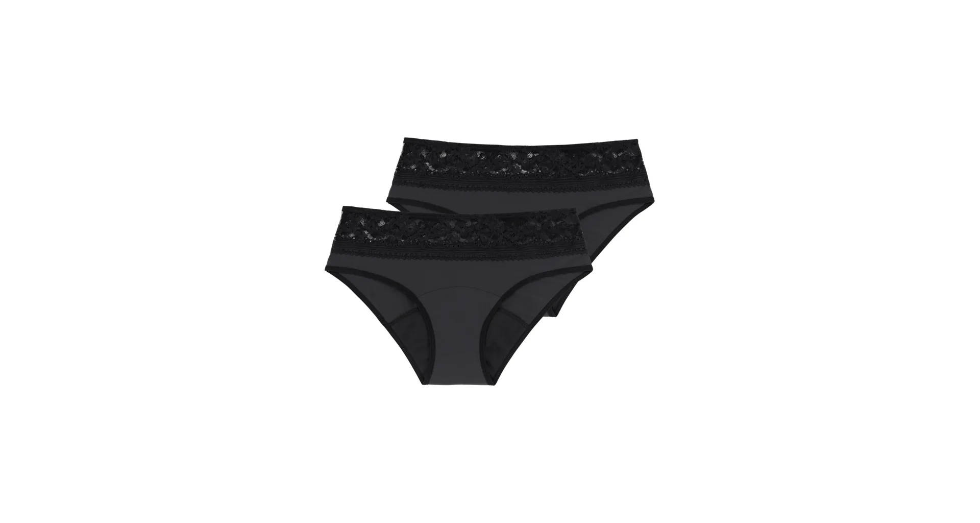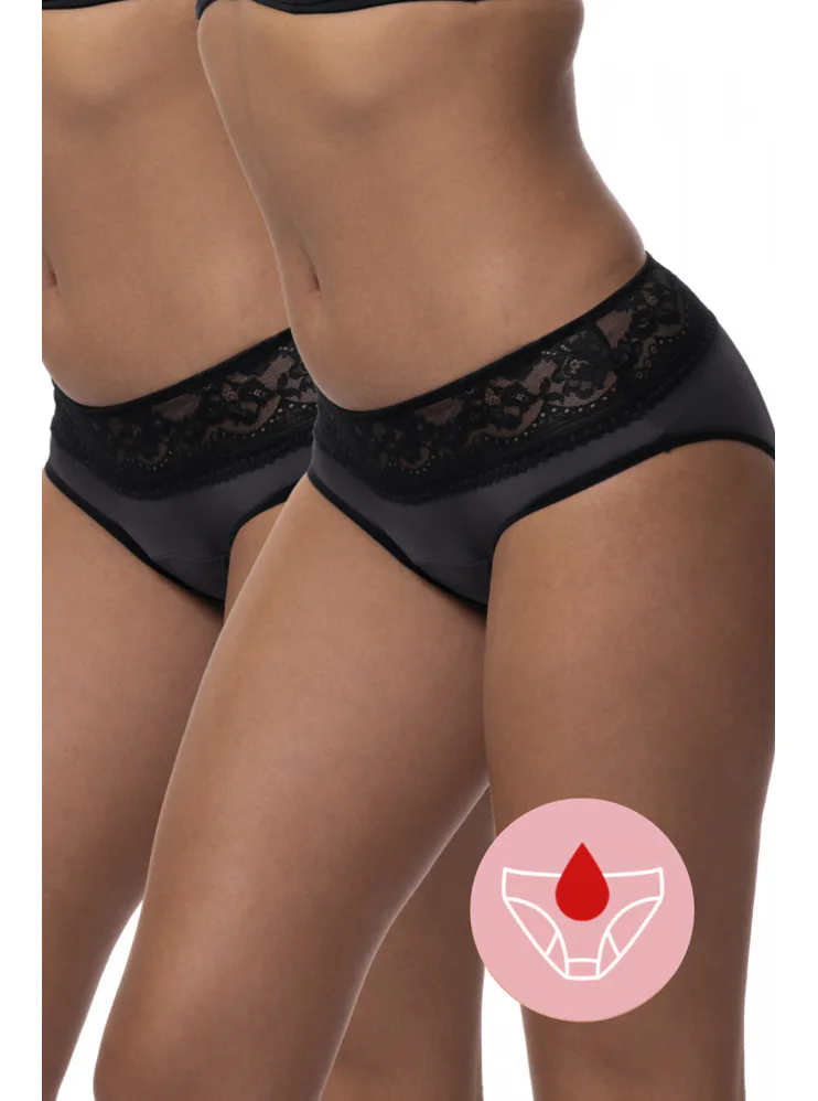 Ve výhodném balení se nachází dvoje černé menstruační kalhotky z organické bavlny, které zaujmou krajkou v oblasti pasu a elegantním střihem. Mají zesílenou antibakteriální vložku, která zabraňuje úniku menstruační tekutiny a zároveň eliminuje zápach. Pořiďte si pohodlnou a udržitelnou alternativu k běženým menstruačním pomůckám. V těchto kalhotkách se budete cítit komfortně a atraktivně i během vašich dní.