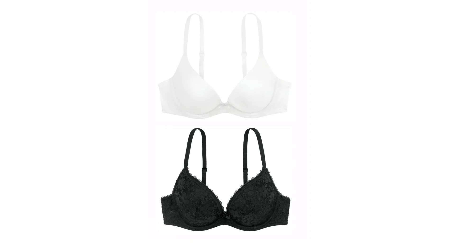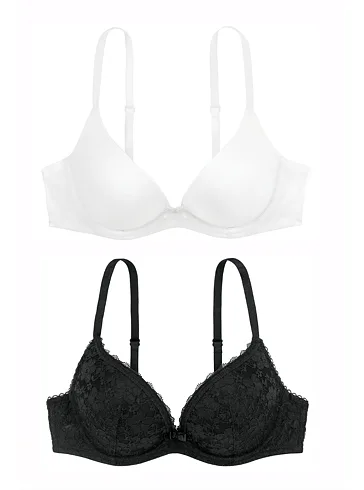 V setu se nachází bílá podprsenka v hladkém provedení a černá celokrajková podprsenka. Díky nízkému středu formuje prsa na střed a opticky vytváří plnější výstřih. Podprsenka má praktické zapínání vzadu na dva háčky se třemi polohami stažení a nastavitelná ramínka. Poskytne vašemu poprsí potřebnou podporu a zajistí pohodlí při celodenním nošení. V dobře padnoucím a kvalitním prádle se budete cítit skvěle. K této sadě podprsenek si lze pořídit stahovací kalhotky s vysokým pasem a vytvořit tak elegantní a funkční komplet.