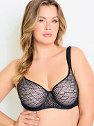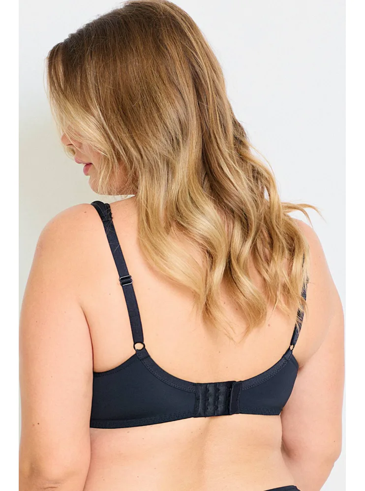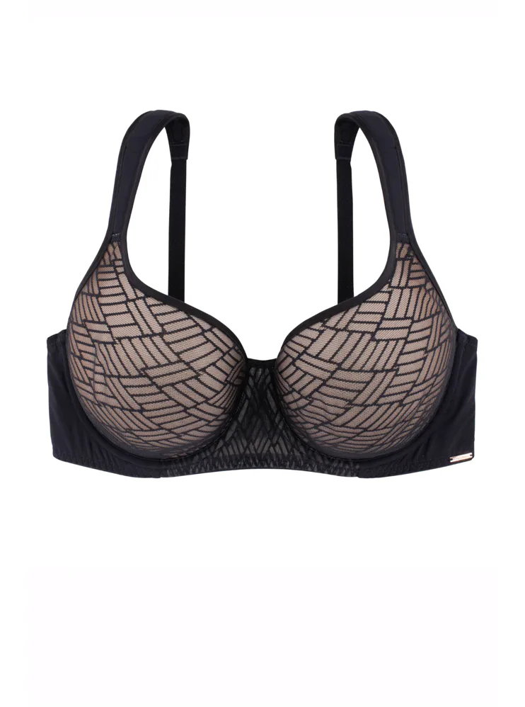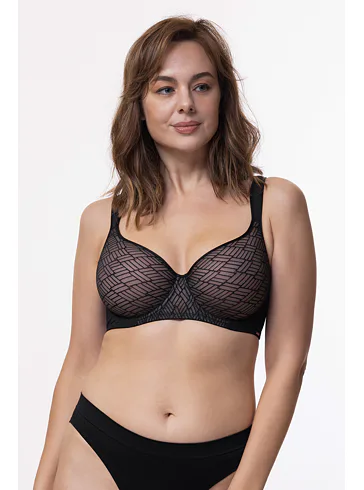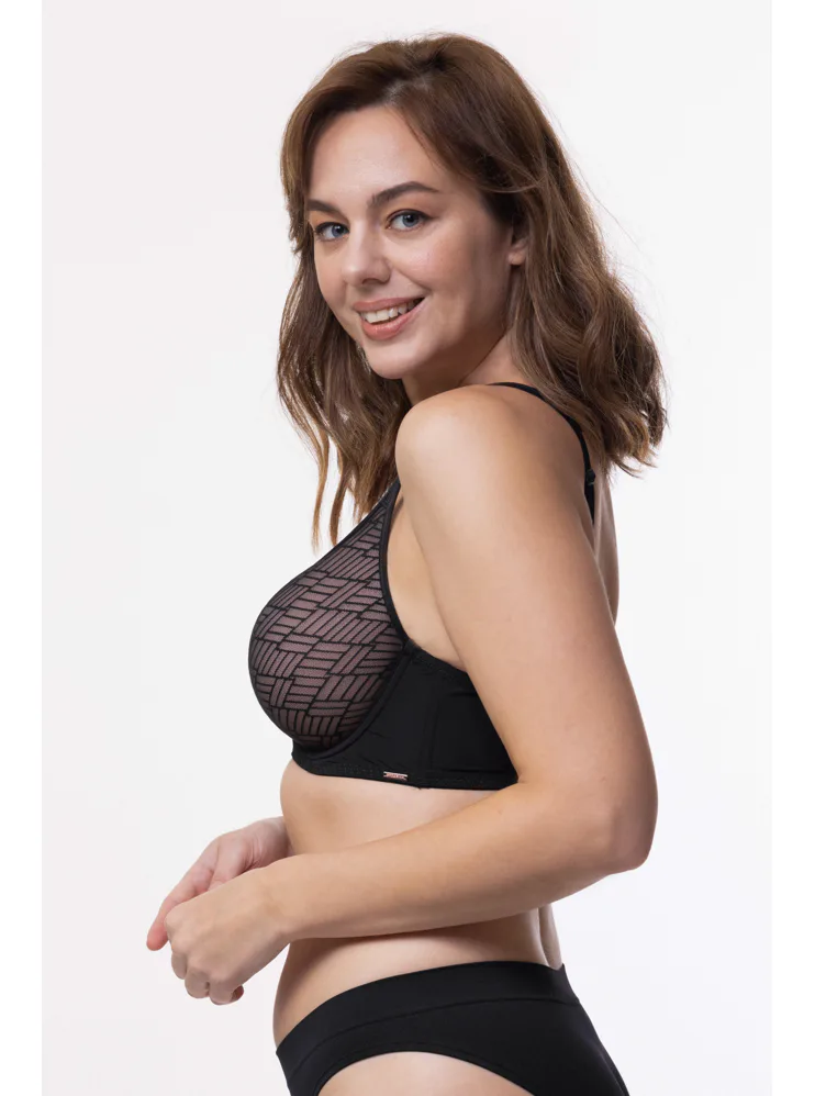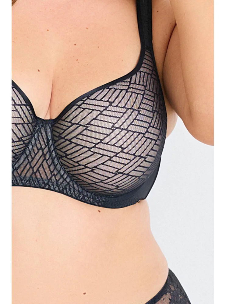 Podprsenka Dorina s vyšším středem udrží poprsí na svém místě, ideální pro větší poprsí. Má měkká podložená ramínka, která pomáhají rovnoměrně rozložit váhou prsou a nikde se nezařezávají. Spacer je speciální druh látky tvořený dvěma vrstvami jemné tkaniny, perfektně přiléhá k pokožce a zajišťuje maximální komfort. Podprsenka v černé barvě zaujme geometrickým vzorem a zapínání má vzadu na tři háčky se třemi polohami stažení. Podprsenku lze pořídit i v krémovém provedení.