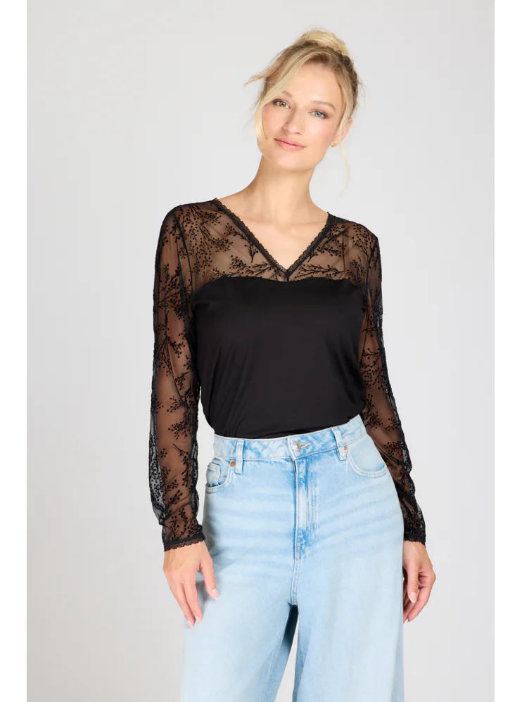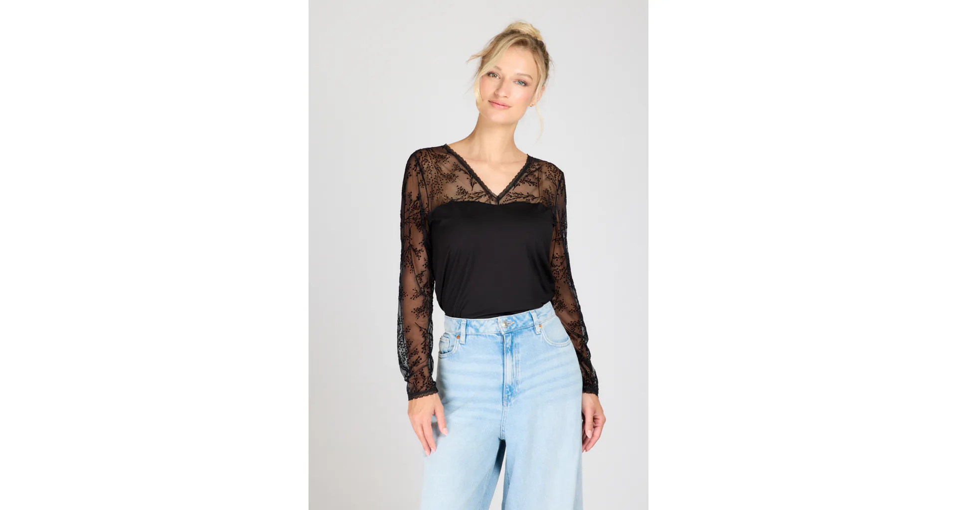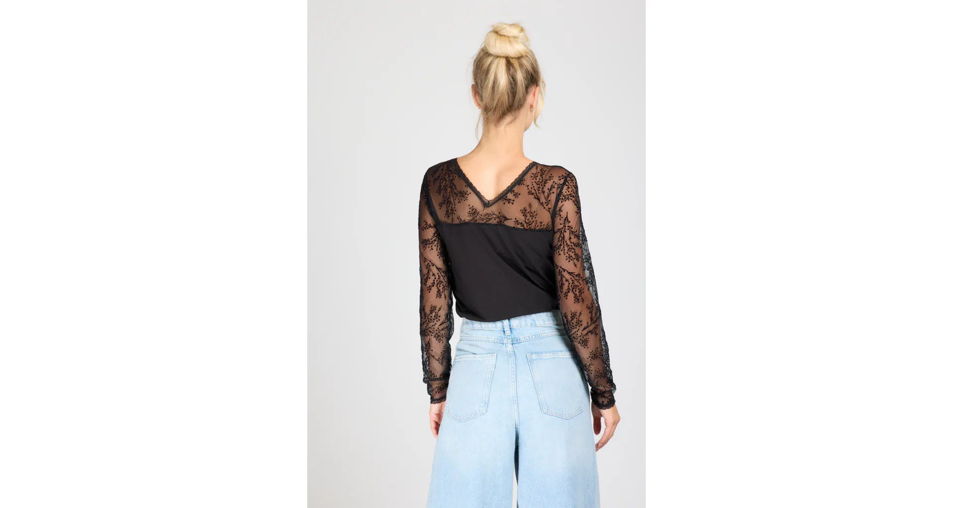 Objevte kombinaci elegance a pohodlí. Černá halenka představuje ideální outfit do práce, na schůzku nebo večírek. Zaujme průhlednými krajkovými rukávy a atraktivním výstřihem ve tvaru V, který prodlužuje krk a opticky zeštíhluje horní část těla.