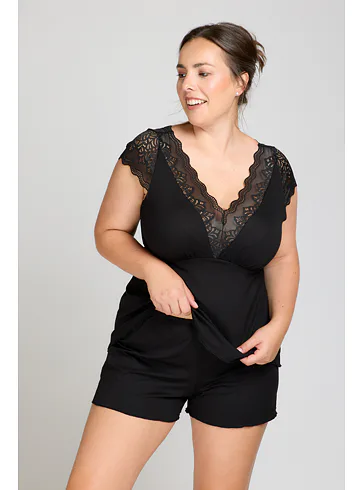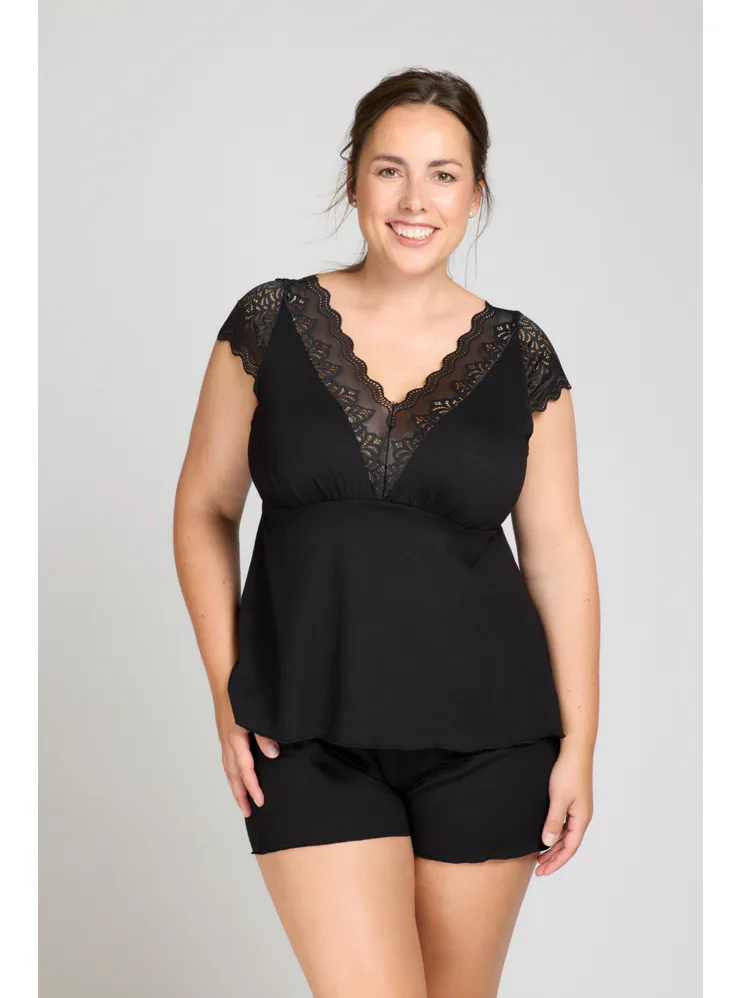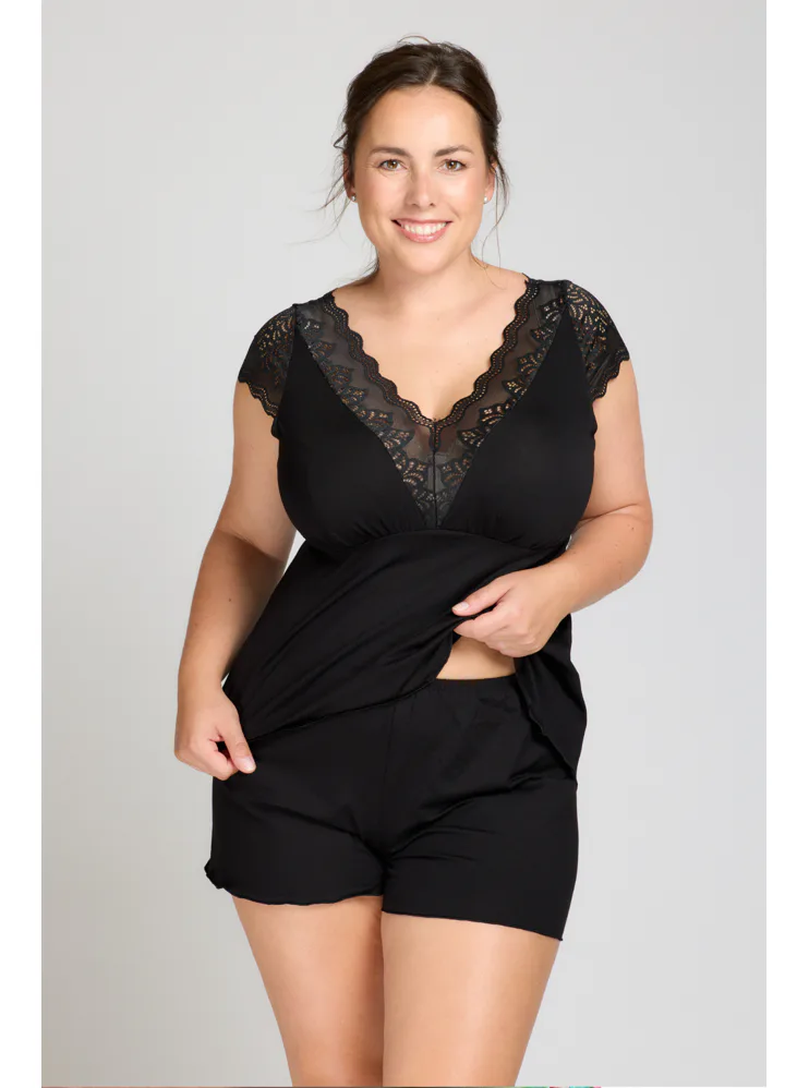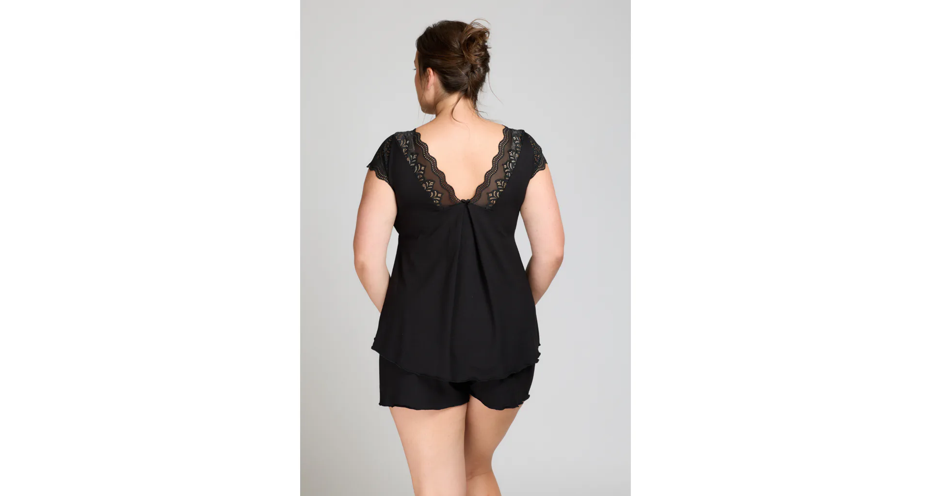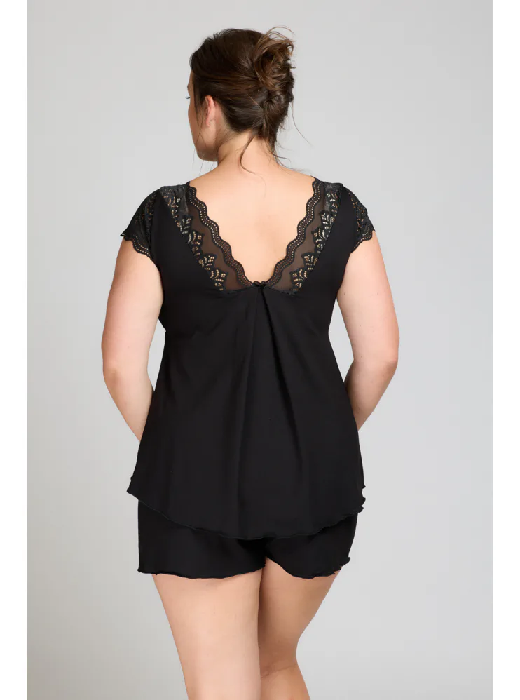Pohodlné dámské pyžamo s vysokým podílem viskózy vyniká svou hebkostí a prodyšností. Černé pyžamo zdobí krajkové detaily ve tvaru písmene V vpředu i vzadu. Motýlí rukávy dodávají tričku lehkost a eleganci. Volné šortky poskytují maximální pohodlí.
