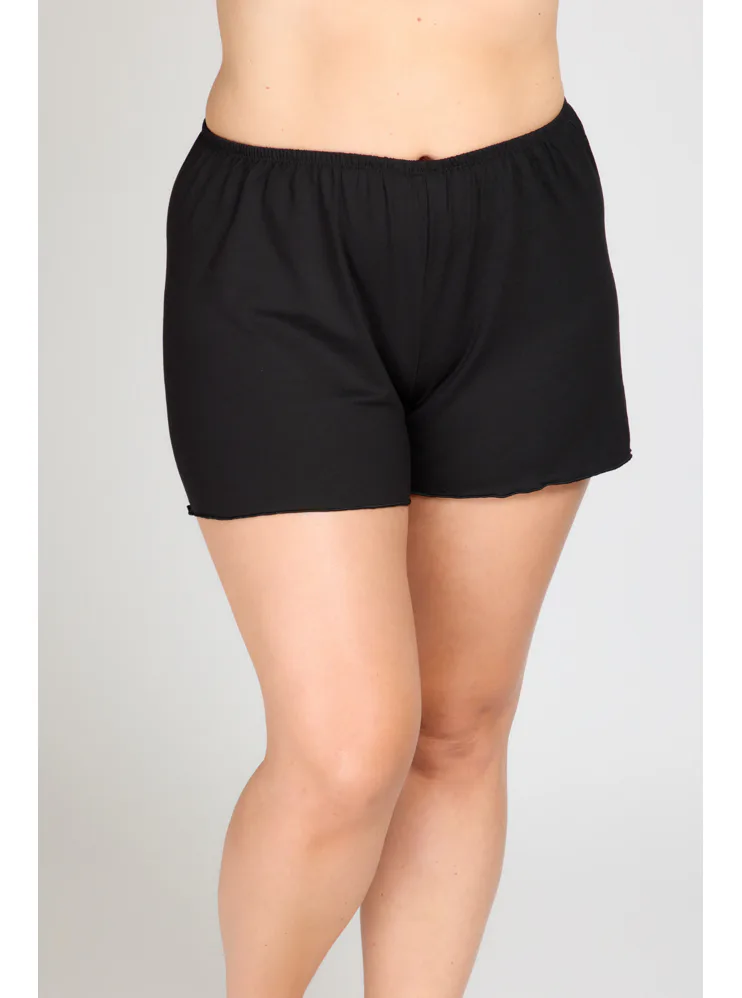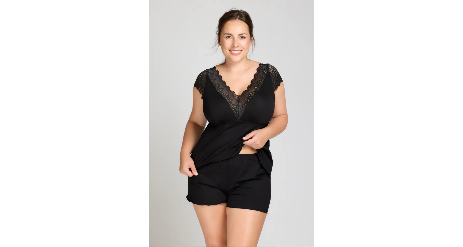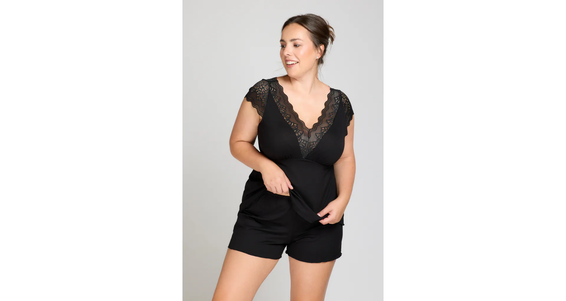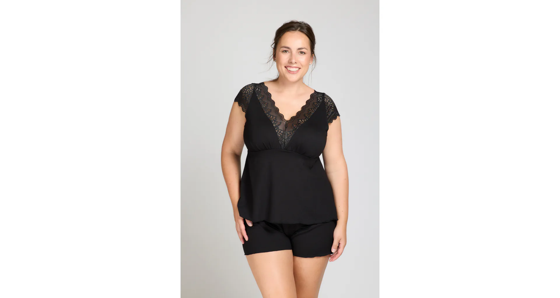 Pohodlné dámské pyžamo s vysokým podílem viskózy vyniká svou hebkostí a prodyšností. Černé pyžamo zdobí krajkové detaily ve tvaru písmene V vpředu i vzadu. Motýlí rukávy dodávají tričku lehkost a eleganci. Volné šortky poskytují maximální pohodlí.