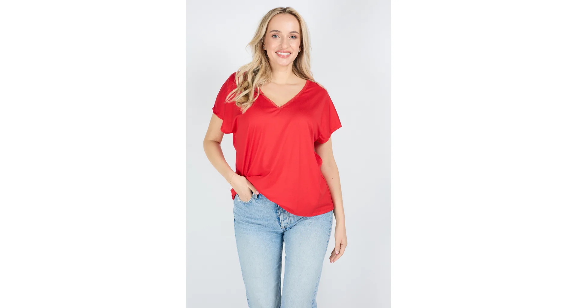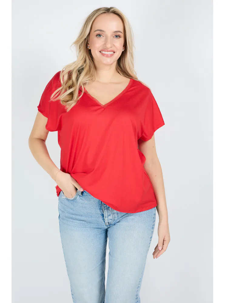 Elegantní červené tričko s krátkým rukávem je příjemné na celodenní nošení. Má volný střih, který lichotí každé postavě a umožňuje volnost pohybu. Vhodné pro běžné nošení i výjimečné příležitosti.