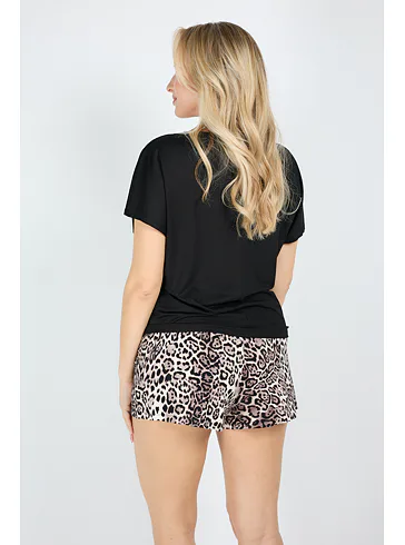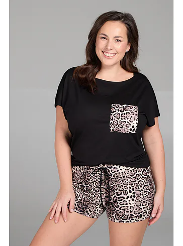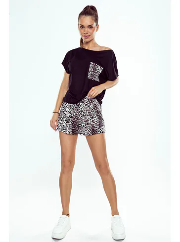 Pyžamo Silvana obsahuje volné černé tričko se spadlým ramenem a s krátkým rukávem, na kterém se nachází praktická kapsička s leopardím vzorem. Vzdušné kraťasy ve stejném zvířecím motivu skvěle doplňují celý outfit. Pyžamo poskytuje volnost a pohodlí během nošení. Vyrobeno je z vysoce kvalitní viskózy, která vyniká neuvěřitelnou jemností a měkkostí. Dopřejte si chvíle odpočinku v okouzlujícím dámském pyžamu.