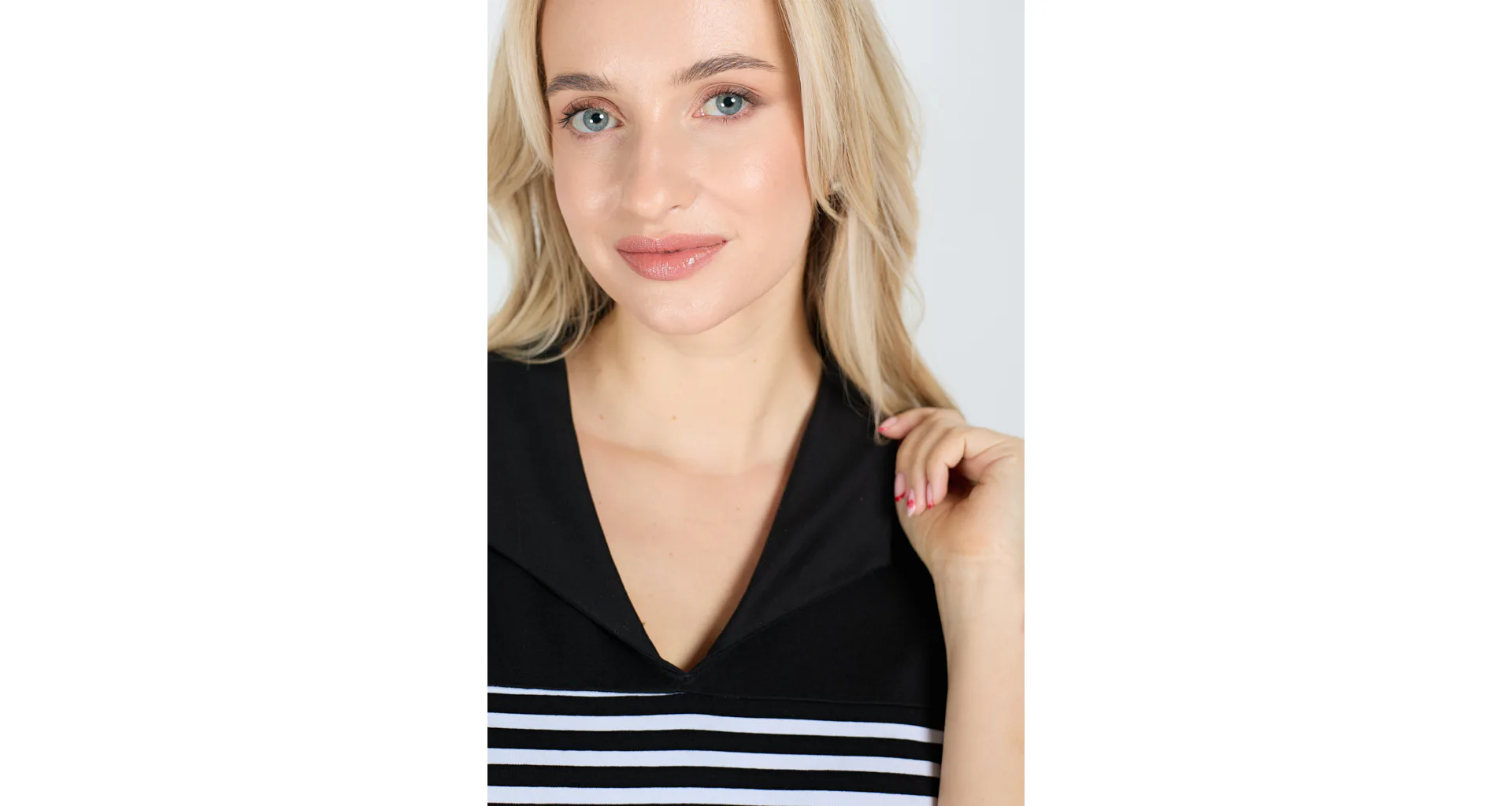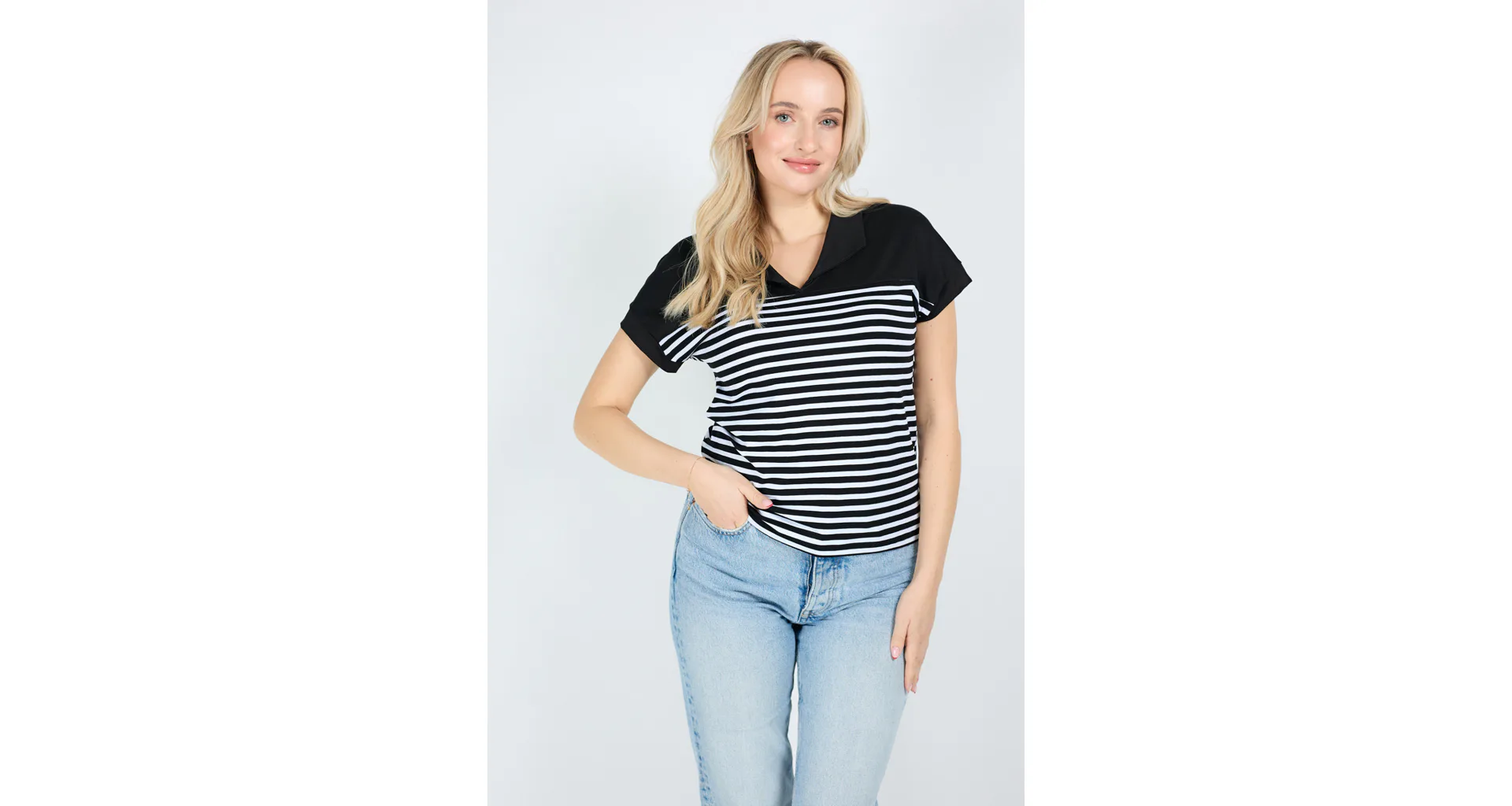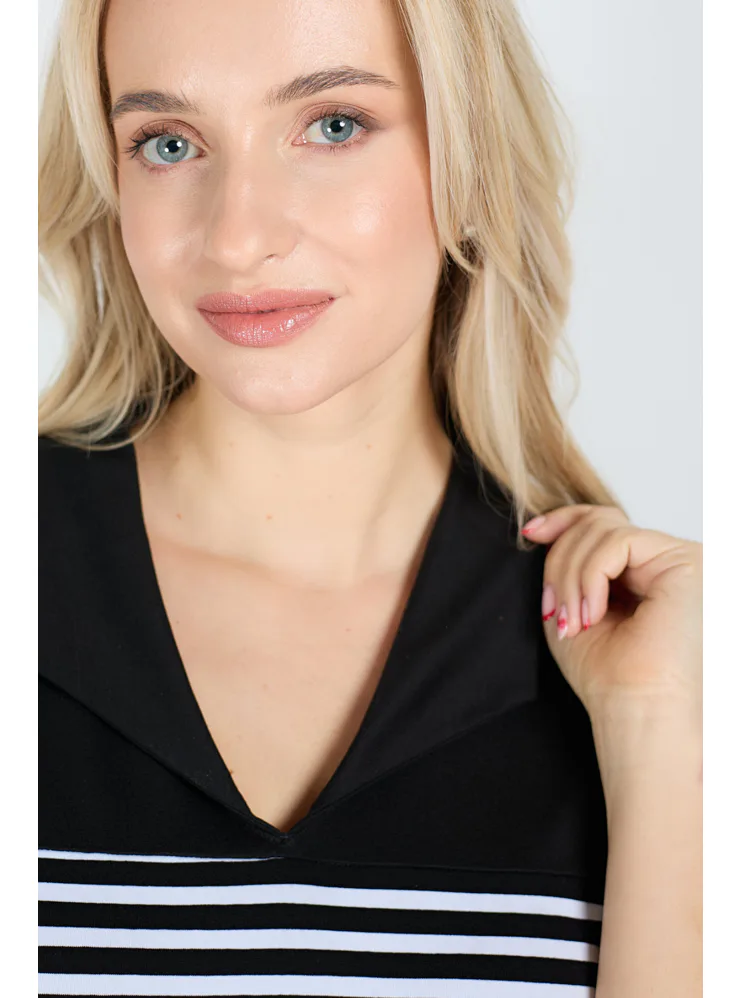 Dámské tričko Tatina zaujme na první pohled elegantním límečkem a výstřihem do písmene V. Černé tričko s bílými pruhy má volnější střih a je vyrobeno z viskózy, která dobře odvádí vlhkost, krásně splývá s postavou a vyniká svou jemností a měkkostí. Ohrnuté rukávy dodávají triku šmrnc. Perfektní volba pro ženy, které hledají rovnováhu mezi stylem, elegancí a komfortem.