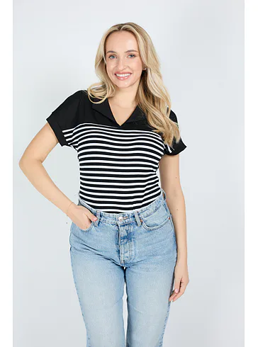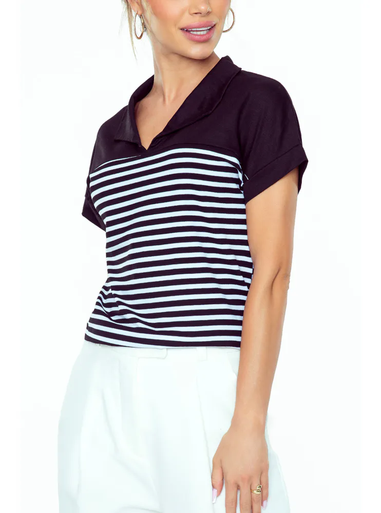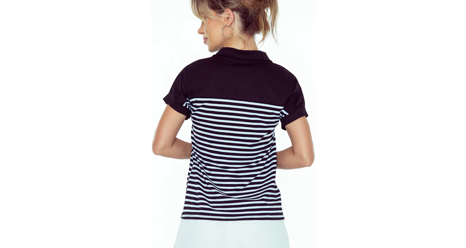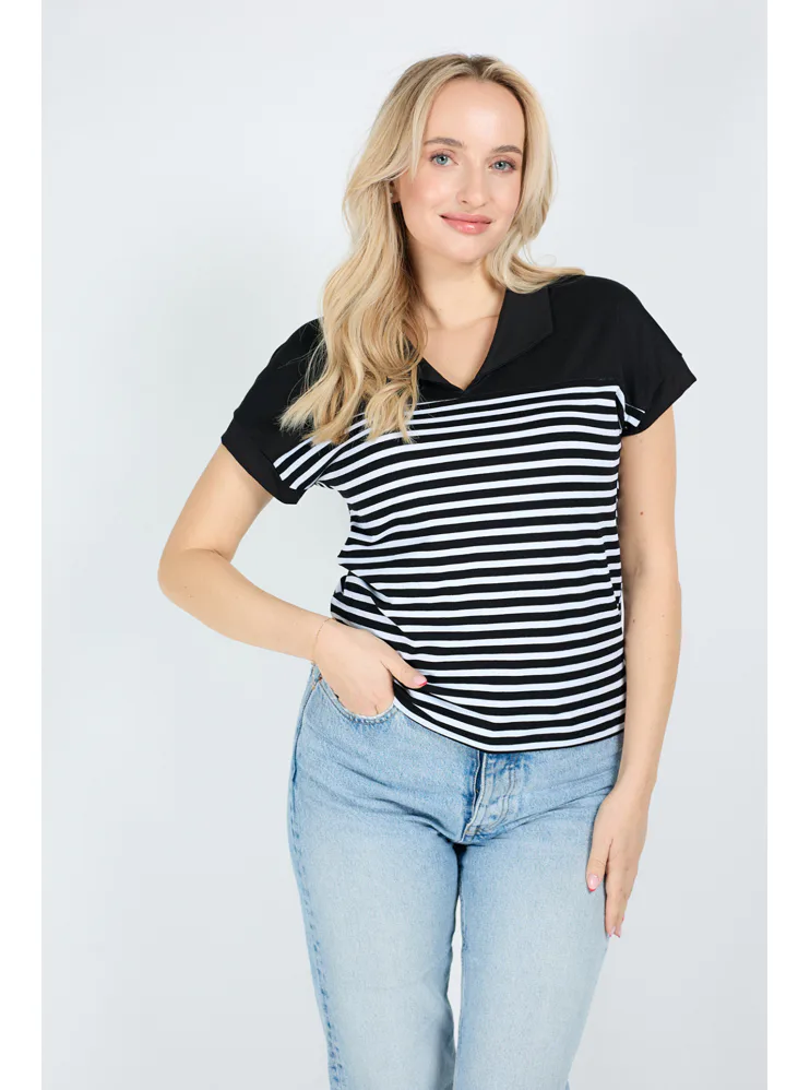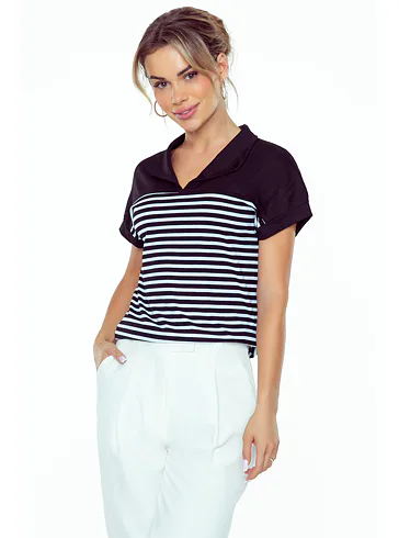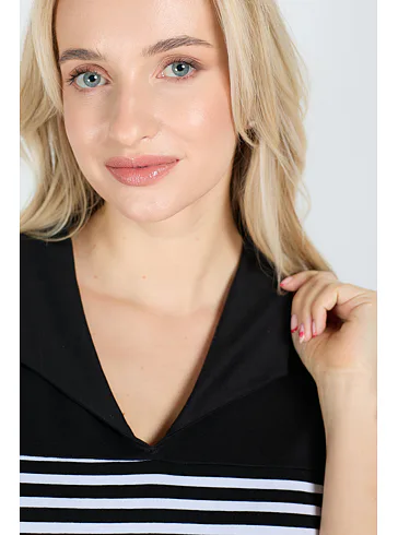 Dámské tričko Tatina zaujme na první pohled elegantním límečkem a výstřihem do písmene V. Černé tričko s bílými pruhy má volnější střih a je vyrobeno z viskózy, která dobře odvádí vlhkost, krásně splývá s postavou a vyniká svou jemností a měkkostí. Ohrnuté rukávy dodávají triku šmrnc. Perfektní volba pro ženy, které hledají rovnováhu mezi stylem, elegancí a komfortem.