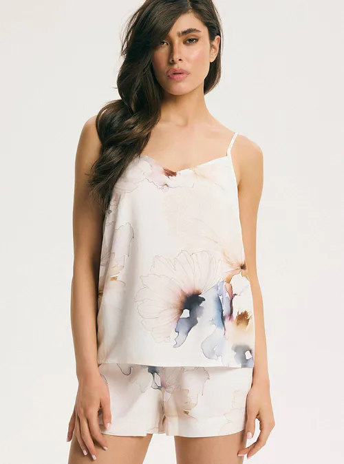 Dámské dvoudílné pyžamo vás okouzlí jemným květinovým vzorem. Tílko s výstřihem do V působí jemně a žensky, volné kraťasy poskytují volnost pohybu. Dopřejte si klidný spánek v pohodlném dámském pyžamu.