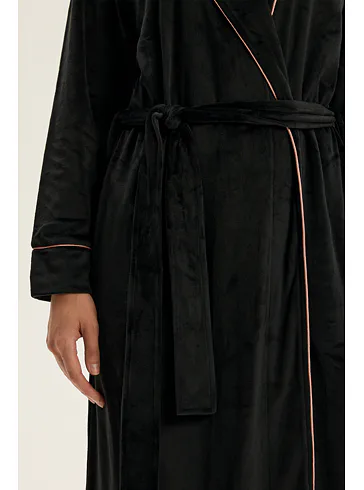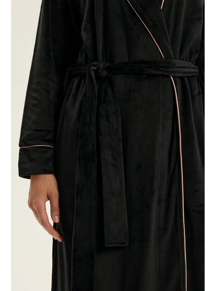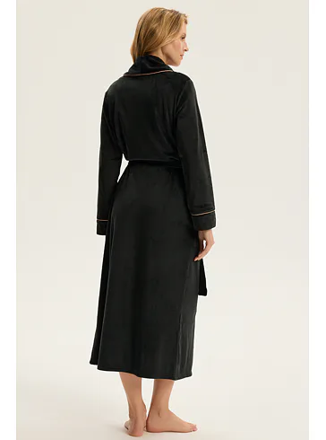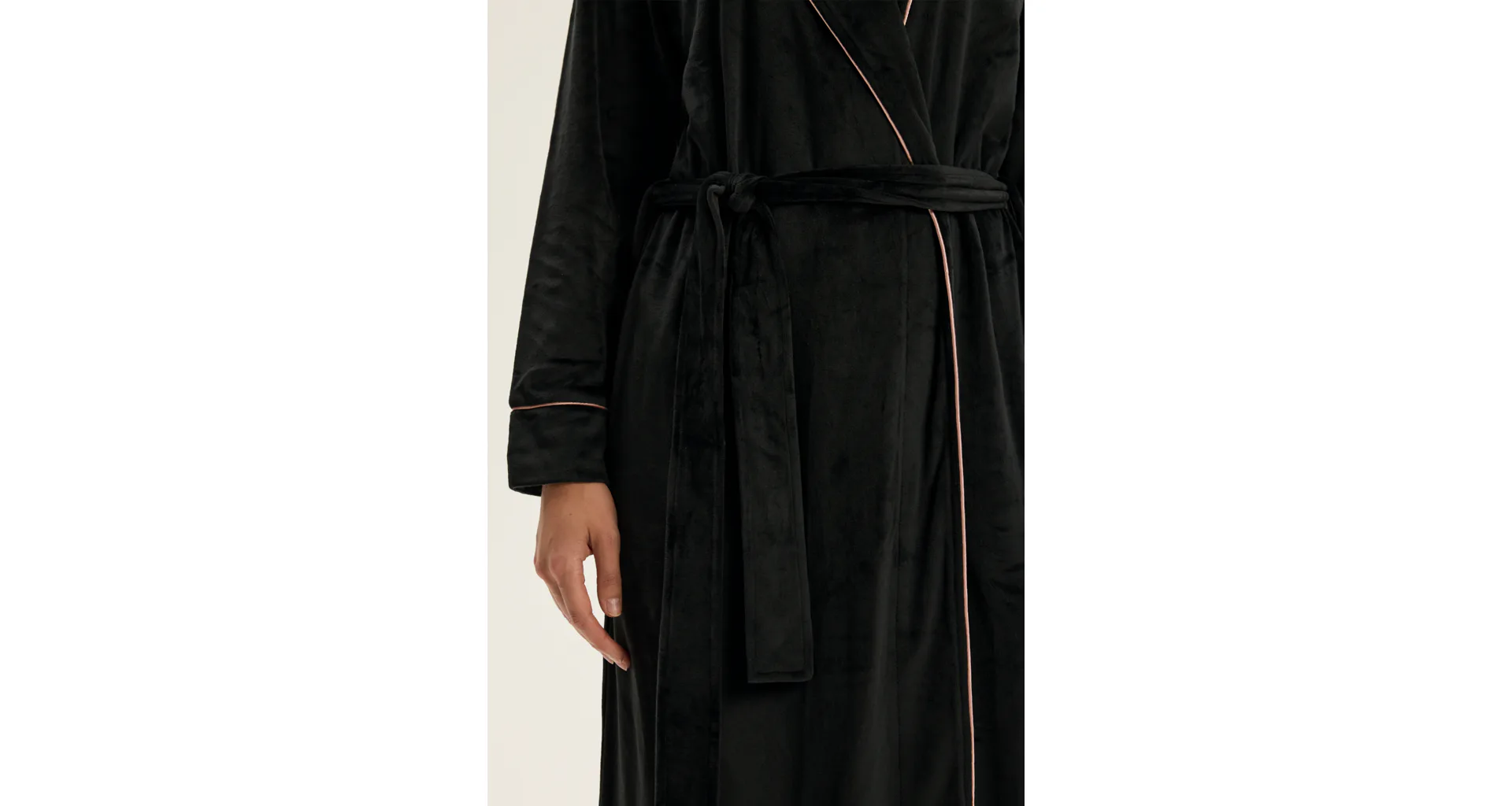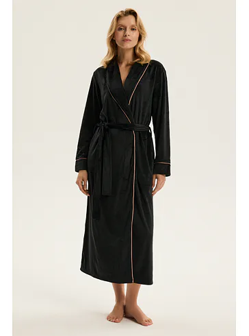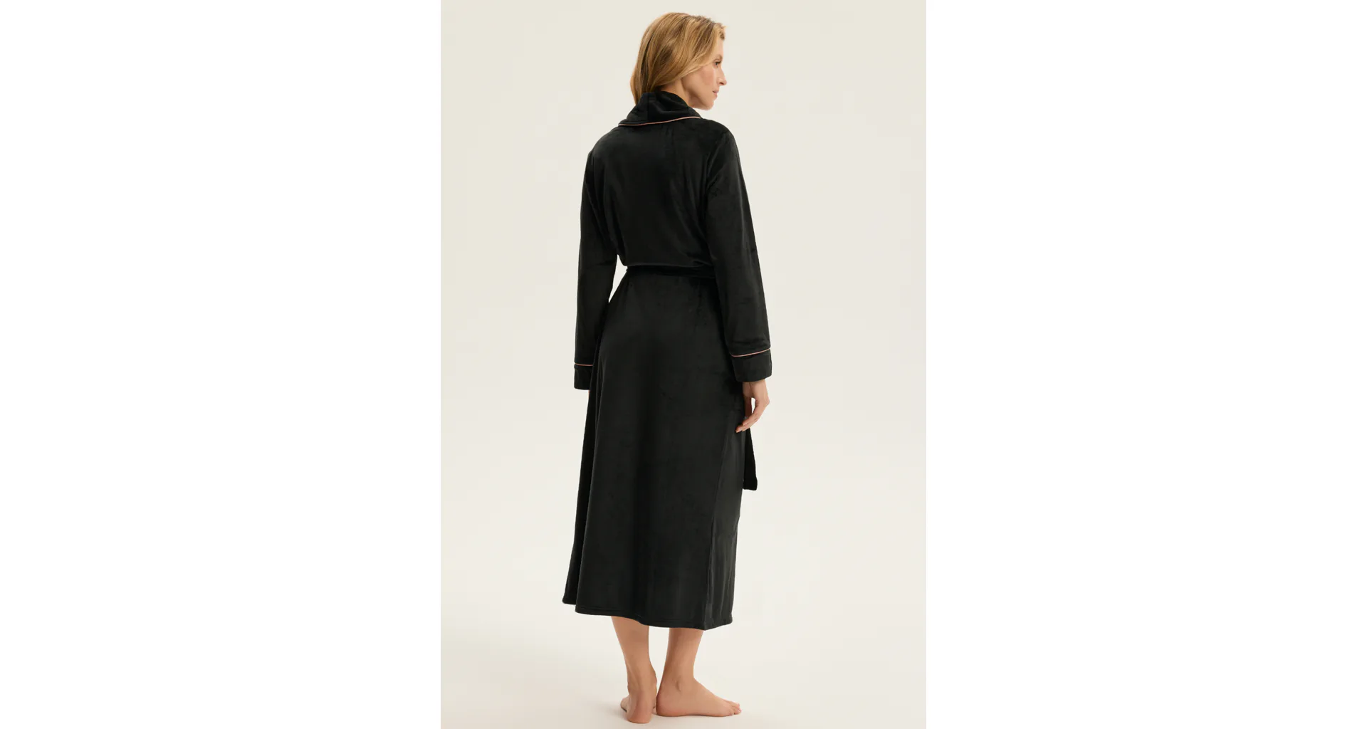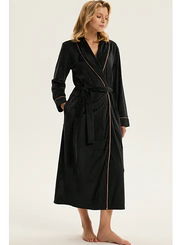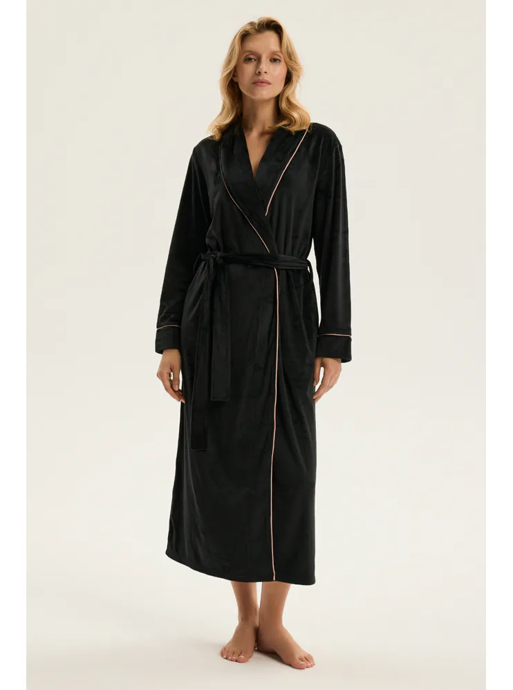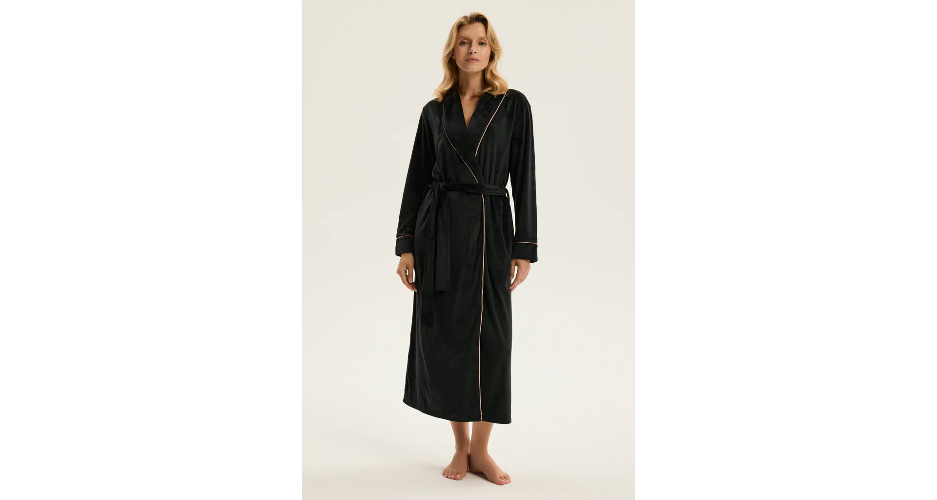 Černý župan zaujme kontrastním lemováním, které mu dodává elegantní šmrnc. Příjemný měkký materiál pohladí pokožku a poskytne vám pocit maximálního komfortu, ať už po koupeli, ve wellness nebo při lenošení na gauči. Užijte si spojení pohodlí, funkčnosti a moderního vzhledu.