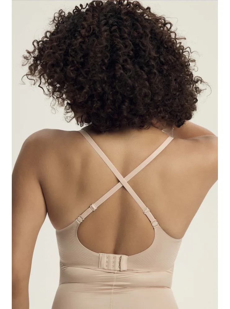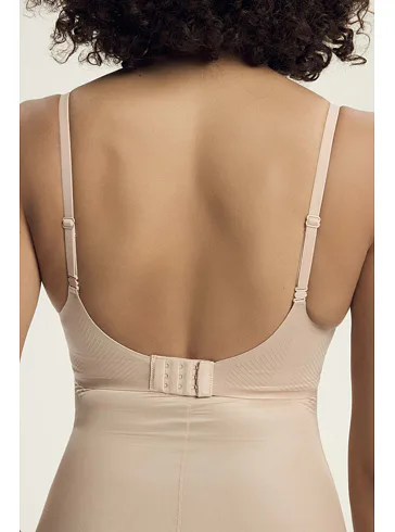Béžová podprsenka bez kostic zajistí spolehlivou oporu. Pro maximální komfort doporučujeme objednat o velikost větší. Má pevný obvod, díky kterému podprsenka pevně drží na těle. Ramínka se dají vzadu odepnout a překřížit. Ideální volba pod oblečení s velkým výstřihem.