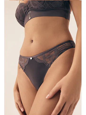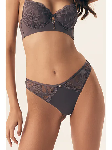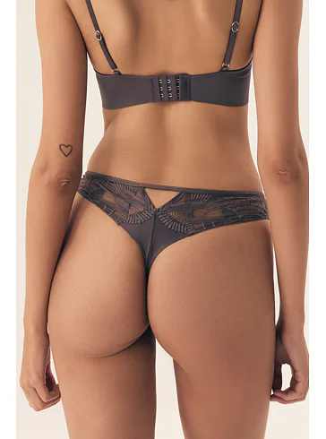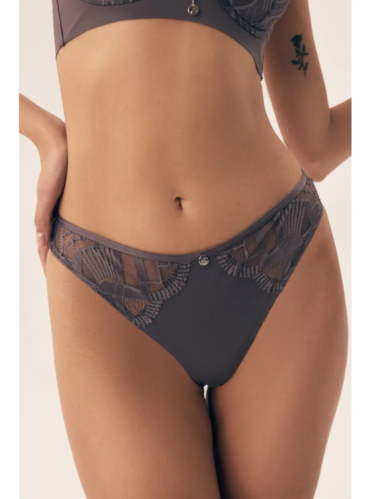 Sexy tanga zdobí lesklý přívěsek na přední straně a krajkové detaily dodávají kalhotkám romantický nádech. Bavlněný klínek poskytuje komfort a má přirozené absorpční vlastnosti. Šedá tanga zaujmou v zadní části atraktivním výstřihem ve tvaru trojúhelníku. Pořiďte si dámská tanga, perfektní volbu pro ženy, které chtějí vypadat stylově a cítit se komfortně. K těmto tangám si můžete pořídit i braletku ve stejném designu a vytvořit tak dokonalý komplet.