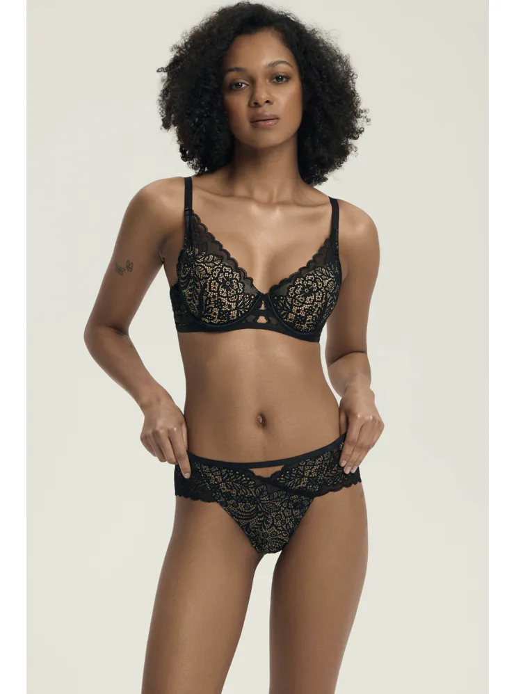 Zvětšete opticky své poprsí ve svůdné push-up podprsence. Vytvoří plný dekolt, poskytne potřebnou oporu a zajistí maximální komfort při každodenním nošení. Tělový košíček je pokrytý sexy černou krajkou a spodní část zdobí dvě jemné stuhy.