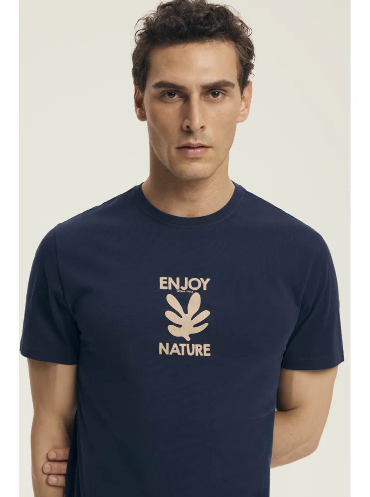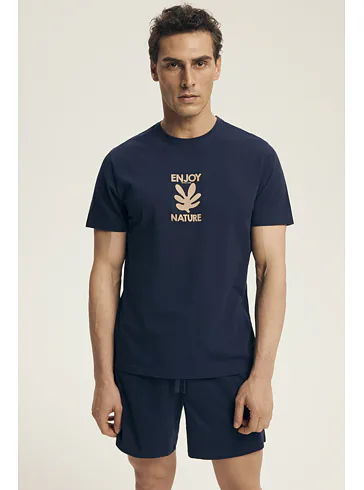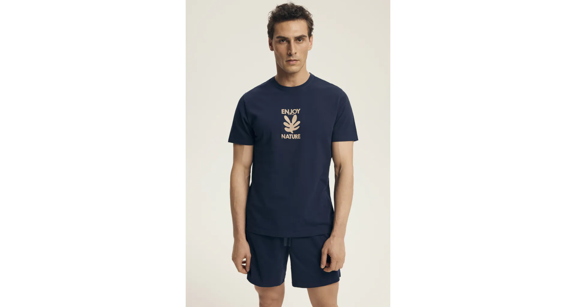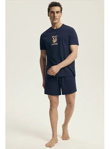 Pyžamo pro muže v námořnicky modré barvě zaujme zlatým přírodním motivem a nápisem ENJOY NATURE. Vyrobeno je z měkkého a prodyšného materiálu, ideální pro klidný spánek i víkendový relax v pohodlí domova. Perfektní jako dárek pro muže.