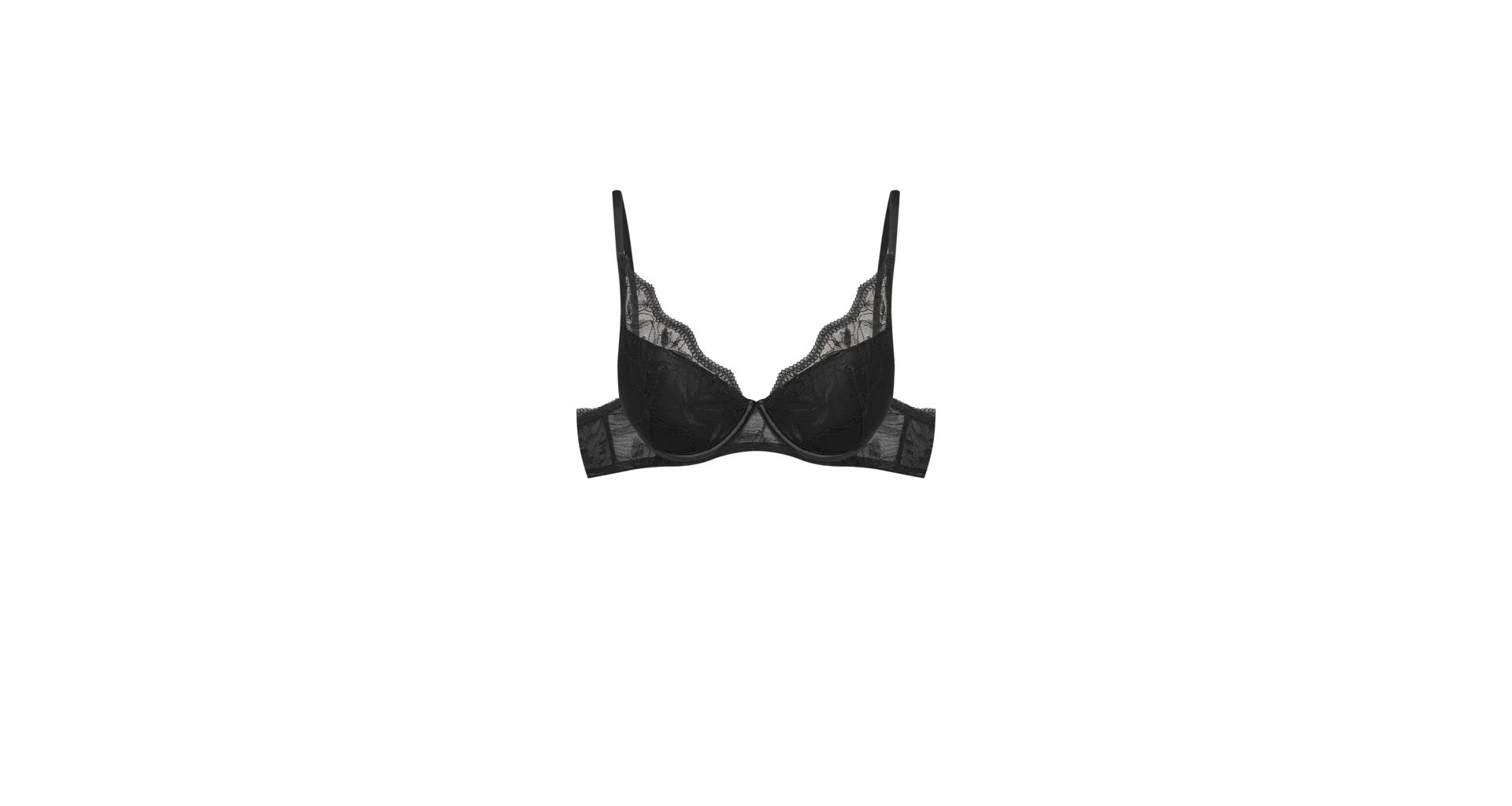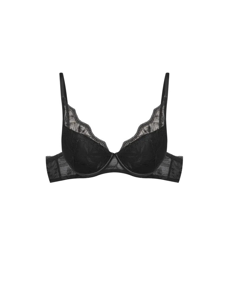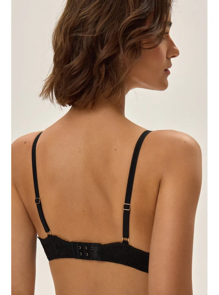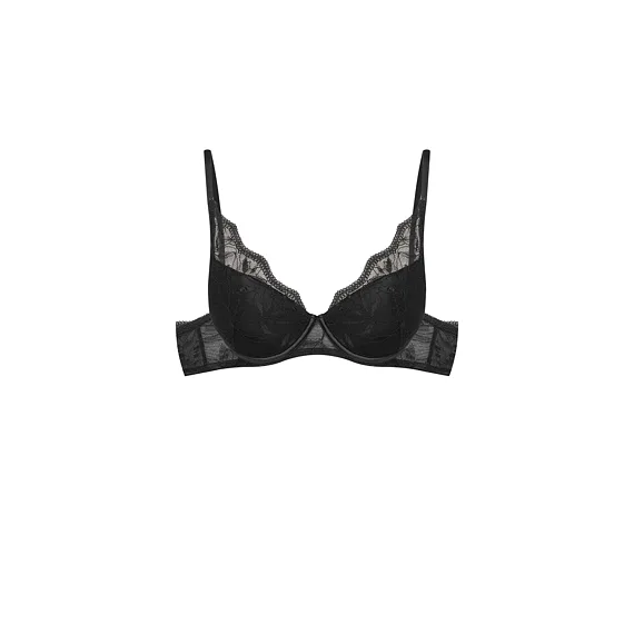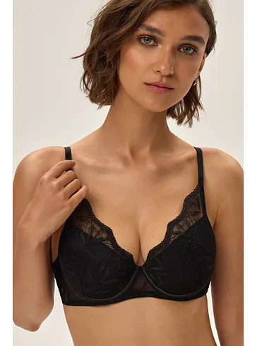 Černá push-up podprsenka s kosticemi vykouzlí svůdný dekolt a prsa pěkně vytvaruje. Zaujme ozdobným tylem s romantickou výšivkou. Pořiďte si podprsenku, ve které se budete cítit sebevědomě a atraktivně. K této podprsence si lze pořídit kalhotky ve stejném designu.