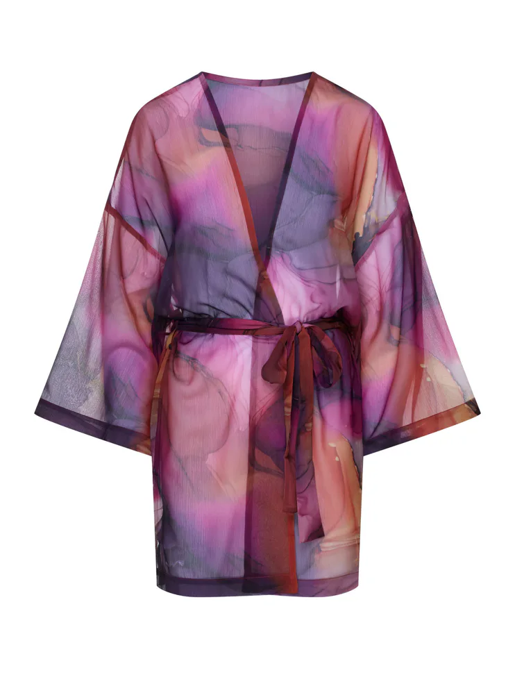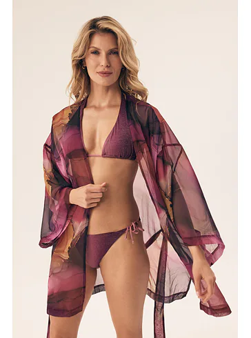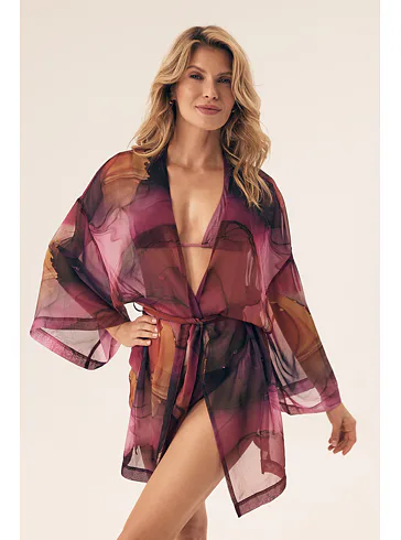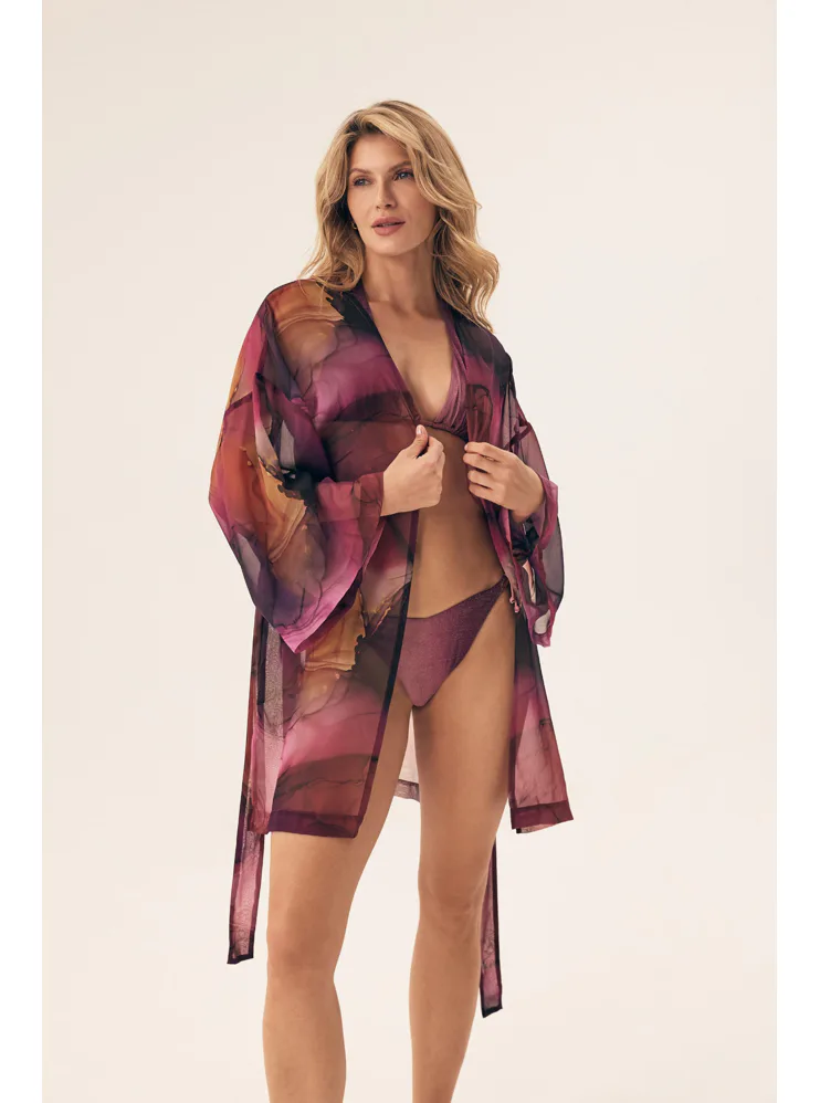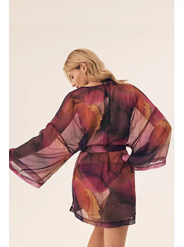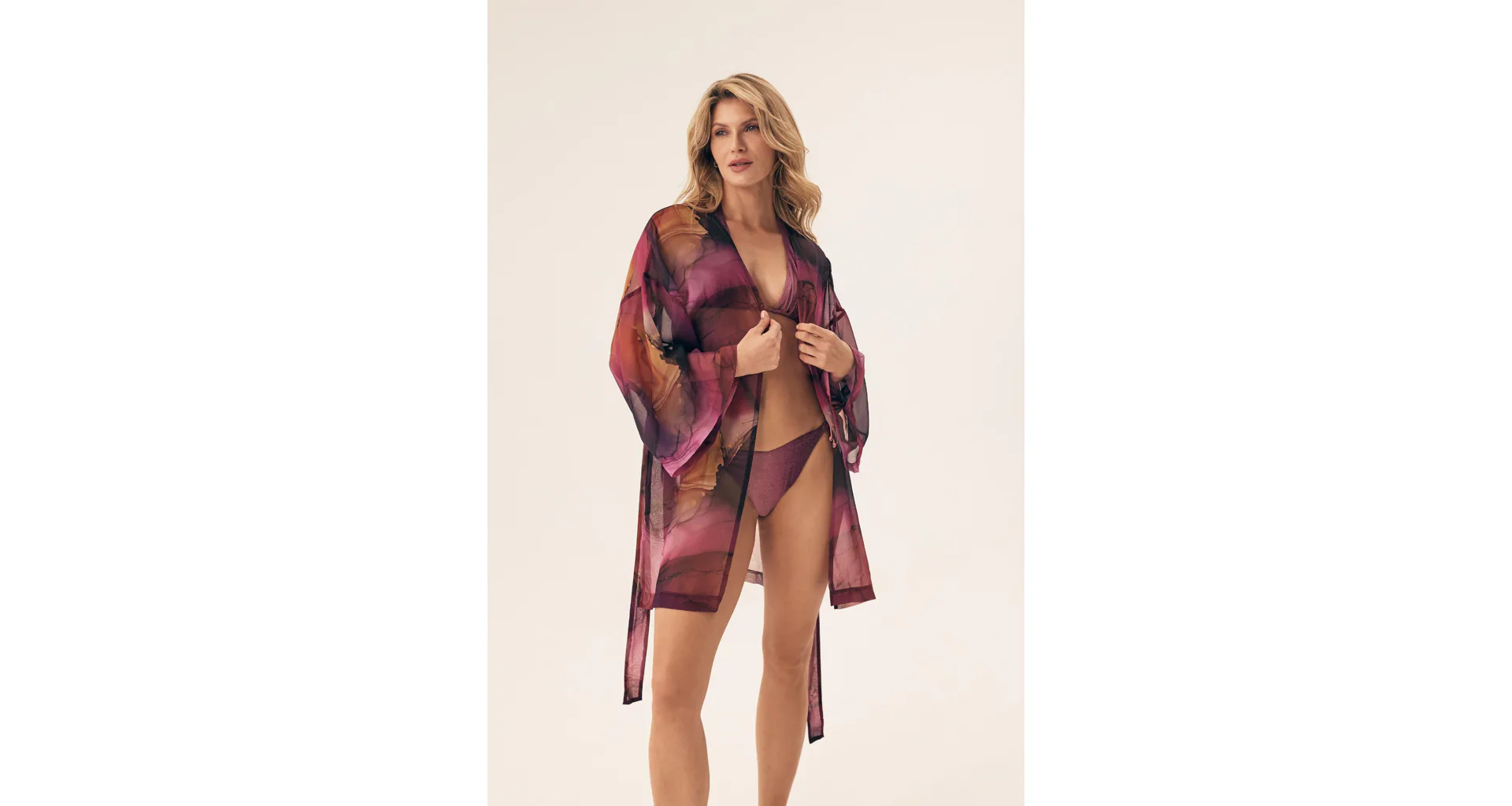 Dámský kaftan má promyšlený design do posledního detailu a končí přibližně v půlce stehen. Zavazování v pase umožňuje zvýraznit siluetu. Plážový přehoz upoutá pozornost akvarelovými tóny růžové, fialové a oranžové barvy. Vhodný jako přehoz přes plavky či ke kraťasům nebo sukni. Pořiďte si univerzální letní kousek, ve kterém se budete cítit a vypadat skvěle.
