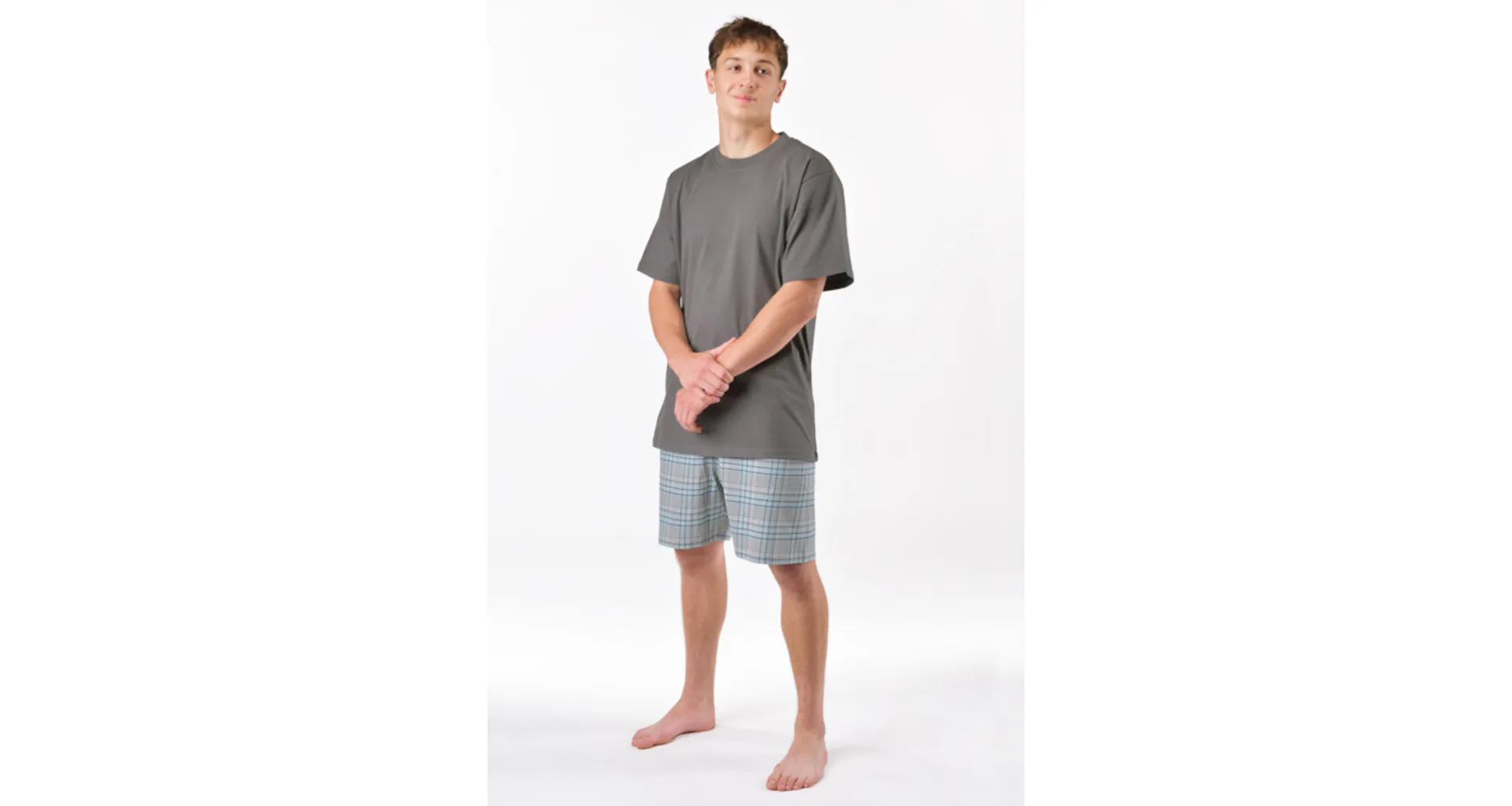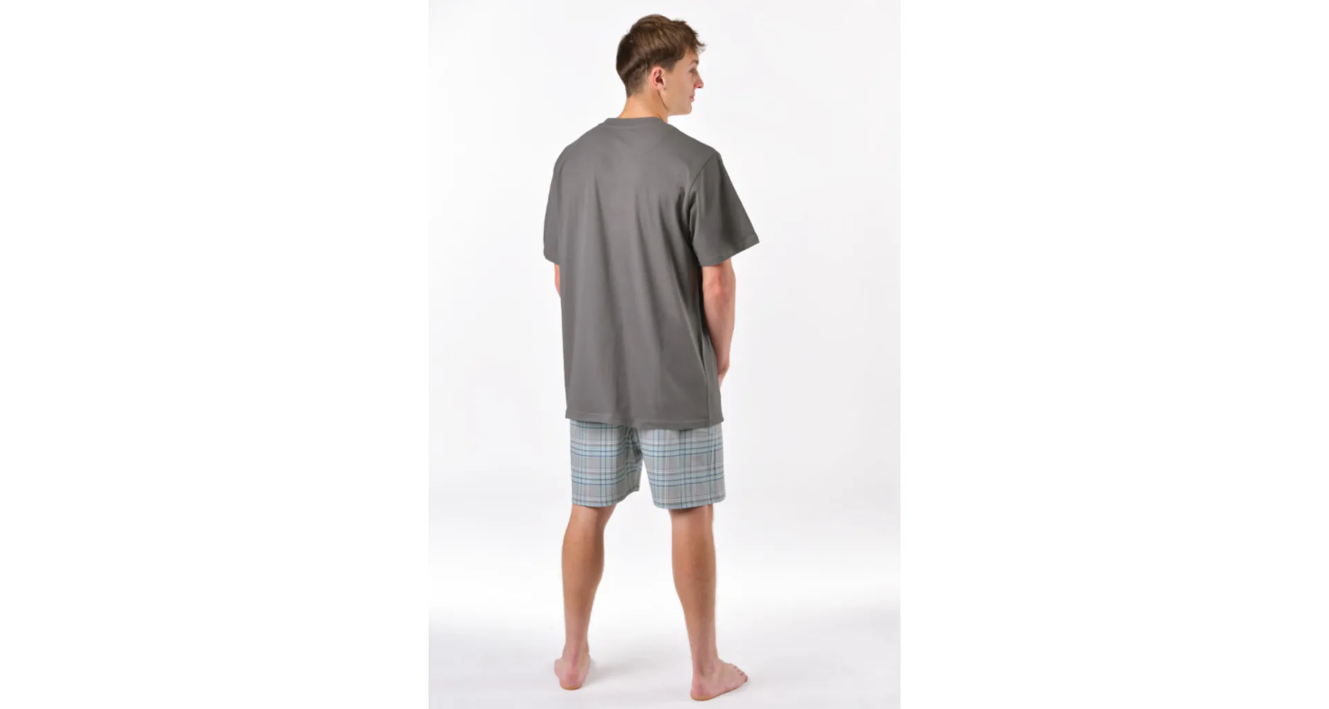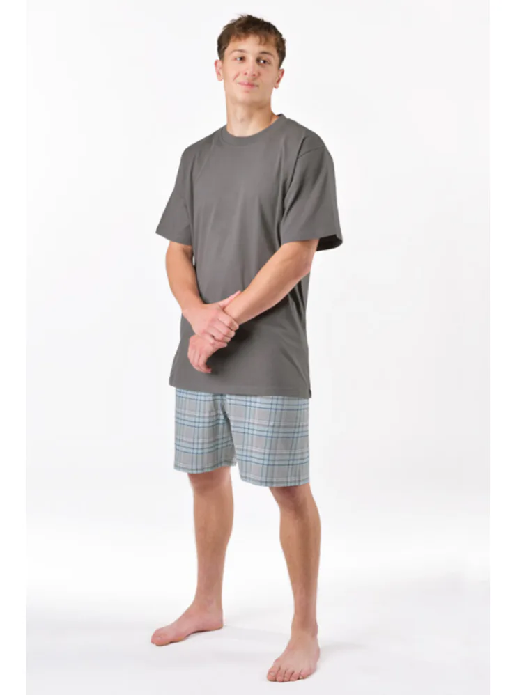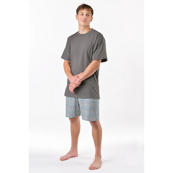 Pánský pyžamový komplet ze 100% bavlny vyniká svou měkkostí a jemností. Tričko s krátkým rukávem bez vzoru je ideální pro muže, kteří mají rádi minimalistický styl. Pyžamo skvěle padne každé postavě. Objevte pohodlí, které si zasloužíte.