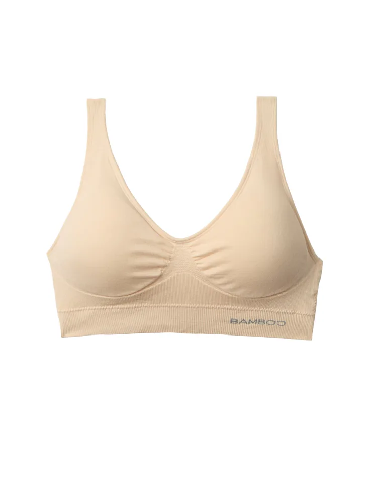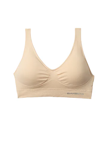 Béžová podprsenka je vyrobena z bambusového vlákna, které vyniká 3-4x vyšší savostí než bavlna, má antibakteriální účinky a je přirozeně prodyšné. Podprsenka bez kostic v minimalistickém designu se obléká přes hlavu a má vyjímatelné vycpávky, které umožňují si přizpůsobit míru podpory dle vašich potřeb. Široká ramínka bez délkové regulace rovnoměrně rozloží váhu vašeho poprsí a nezařezávají se. Díky bezešvému provedení se vám nebude rýsovat pod přiléhavým oblečením.