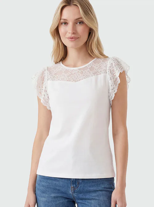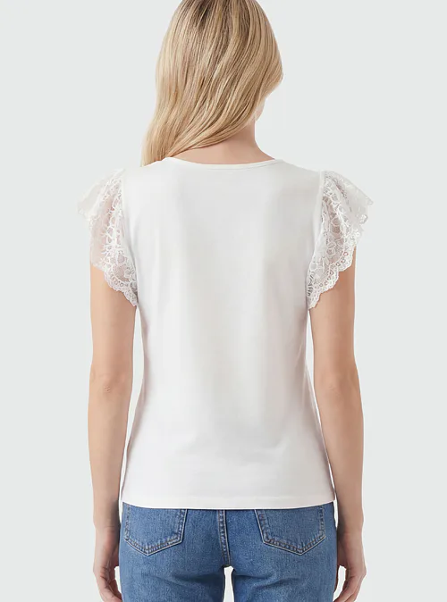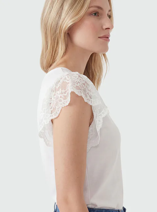 Viskóza se vyrábí z celulózy, nejčastěji ze dřeva. Vyniká měkkostí, splývavostí, prodyšností a je velmi příjemná na omak. Viskózové bílé tričko zdobí něžná krajka na rukávech a kolem krku. Pořiďte si nadčasový kousek, který skvěle doplní váš šatník.
