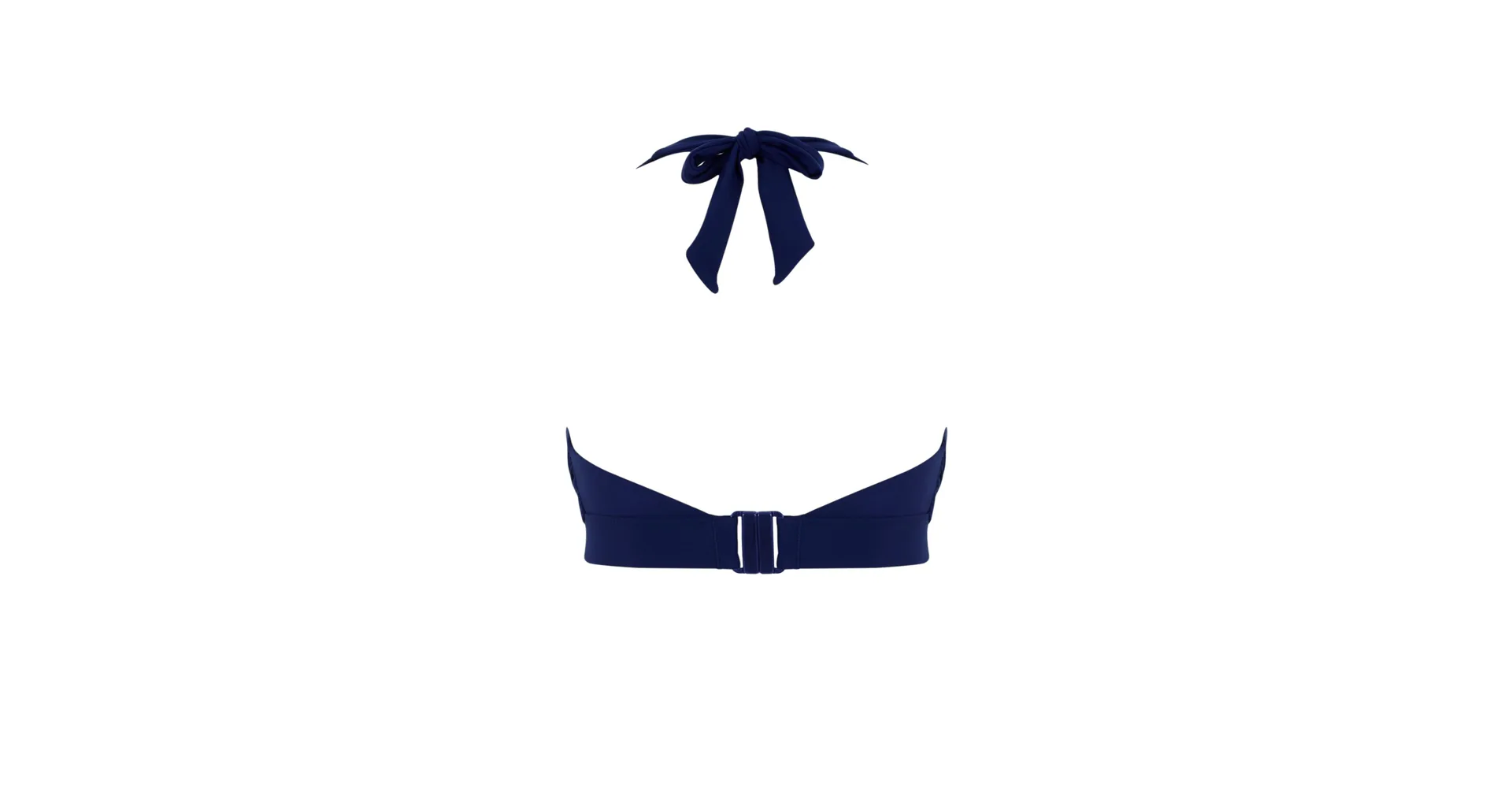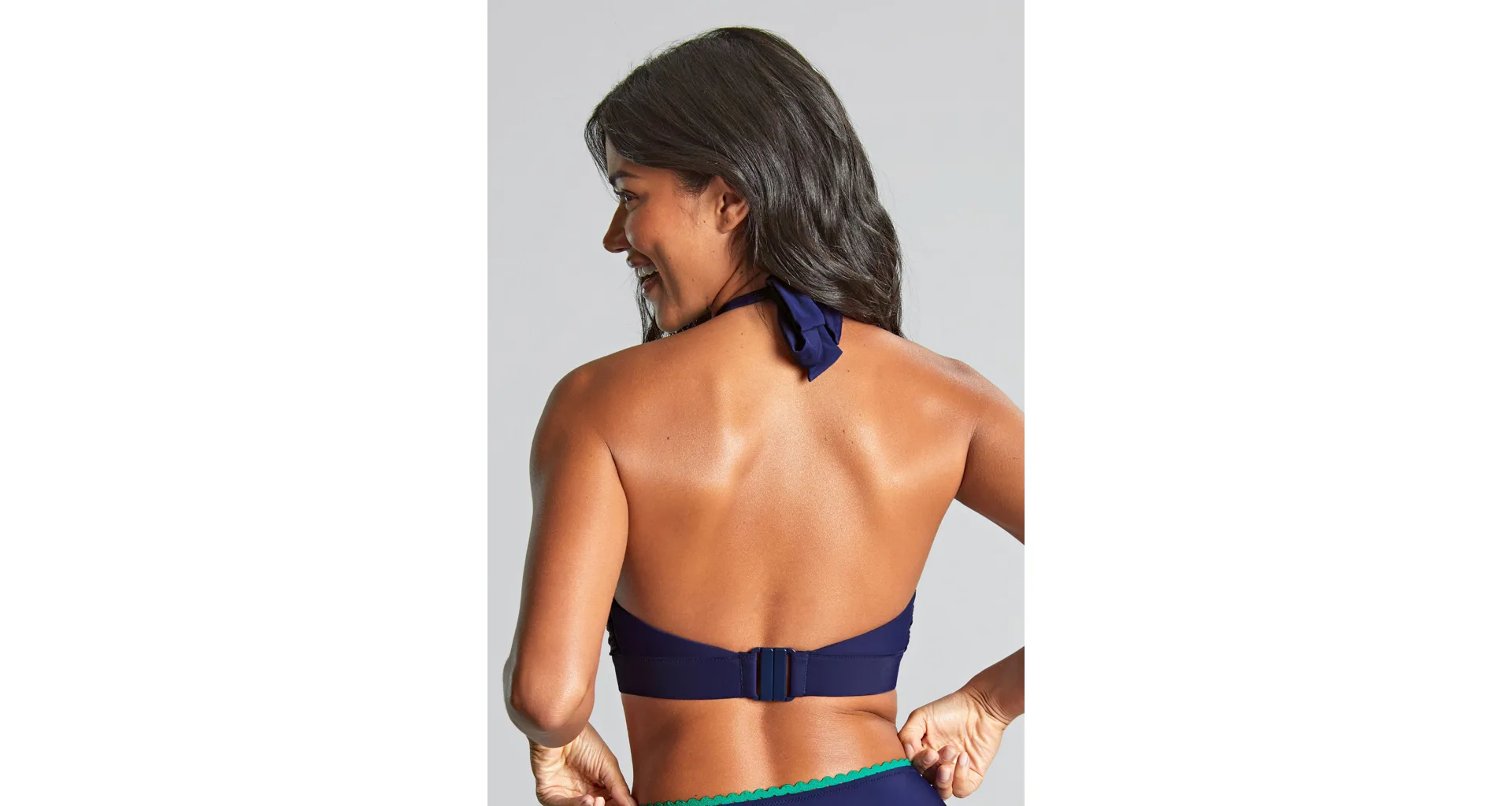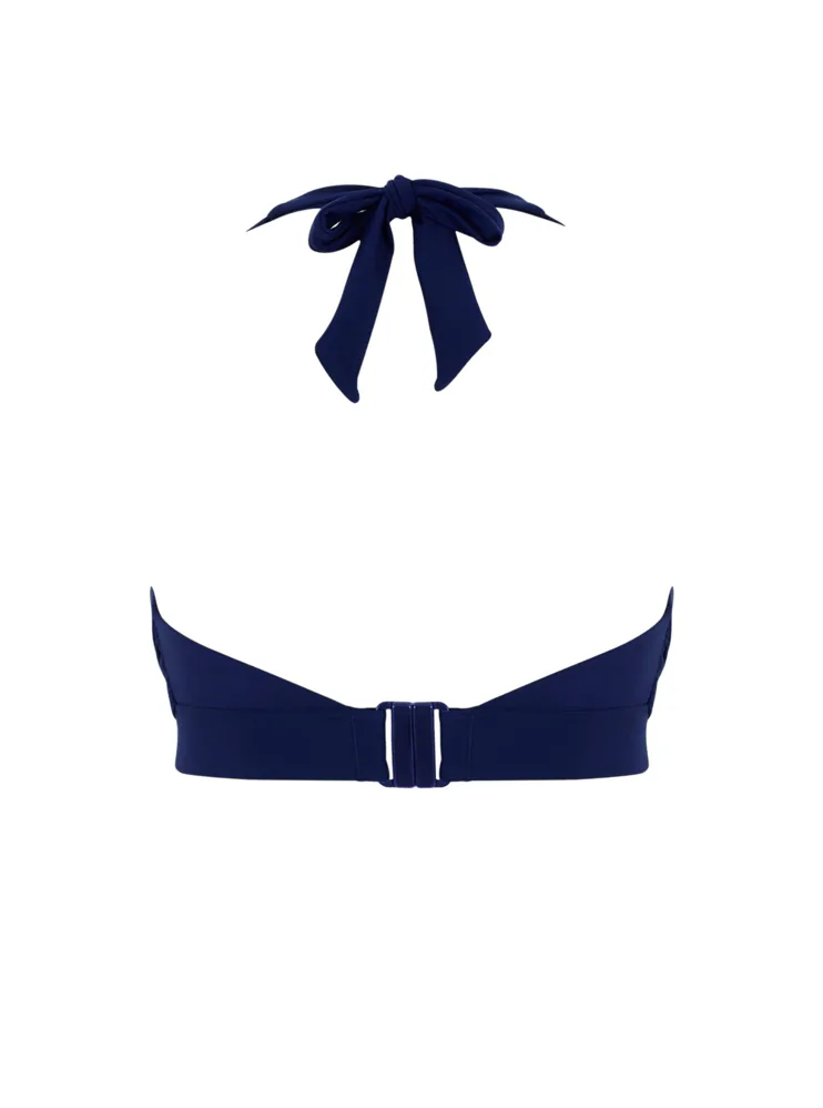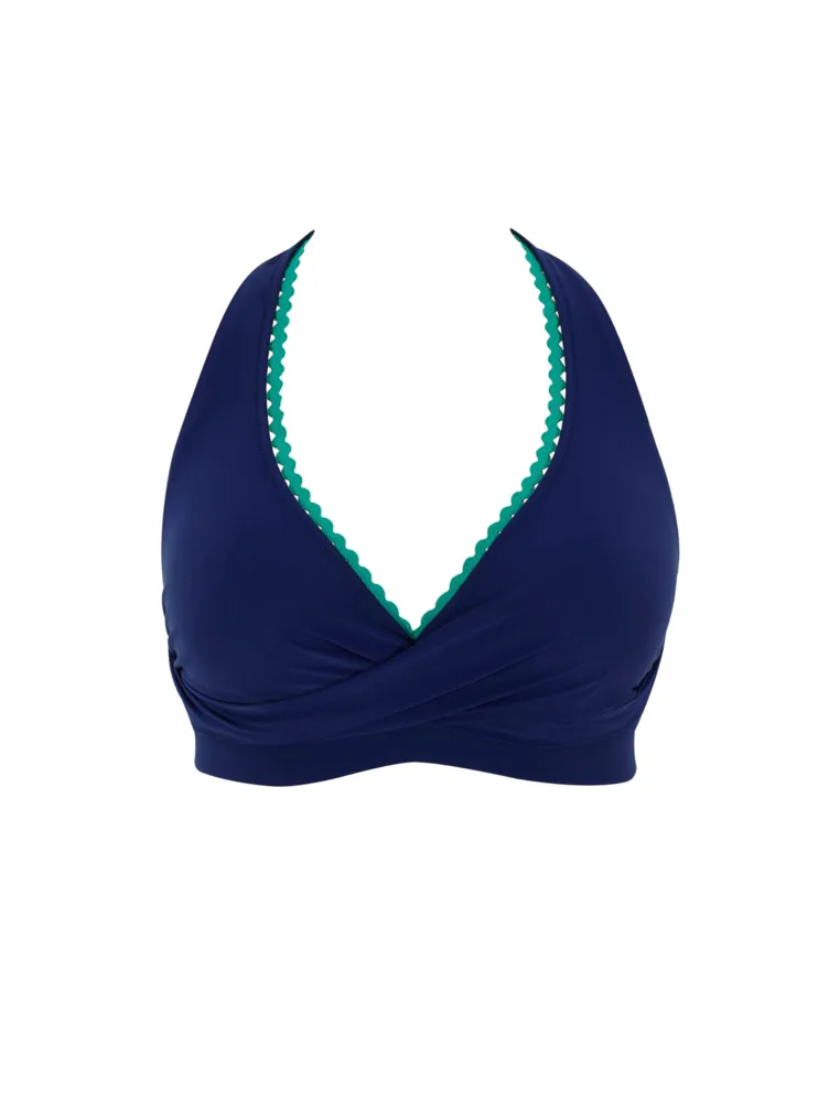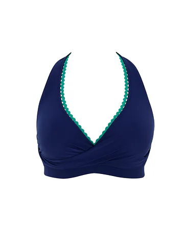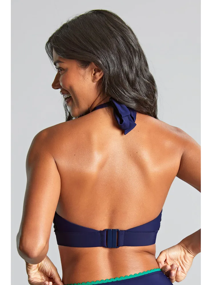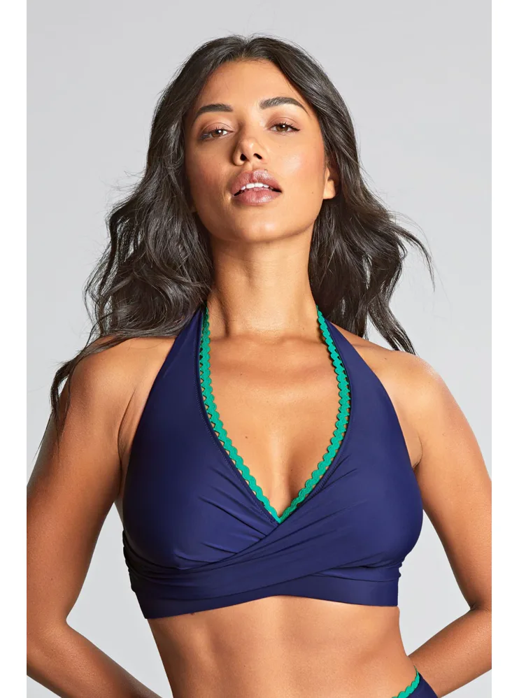 Bikinová nevyztužená podprsenka s překříženými, trojúhelníkovými koši umožňuje oporu i pro větší prsa. Díky zavazování za krkem podprsenku snadno upravíte, aby dokonale seděla. Výstřih modré podprsenky je lemovaný kontrastní zelenou lemovkou. Ke kompletnímu setu si můžete pořídit i plavkové kalhotky ve stejném designu.