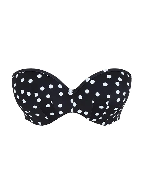 Plavková podprsenka zaujme bílými puntíky na černém podkladu. Balkonetka s kosticemi se perfektně přizpůsobí vašim křivkám a dodá prsům krásně kulatý tvar. Vyrobena je ze 100% recyklovaného materiálu. Pořiďte si ve stejném provedení i plavkové kalhotky klasického střihu a zazařte na každé pláži.