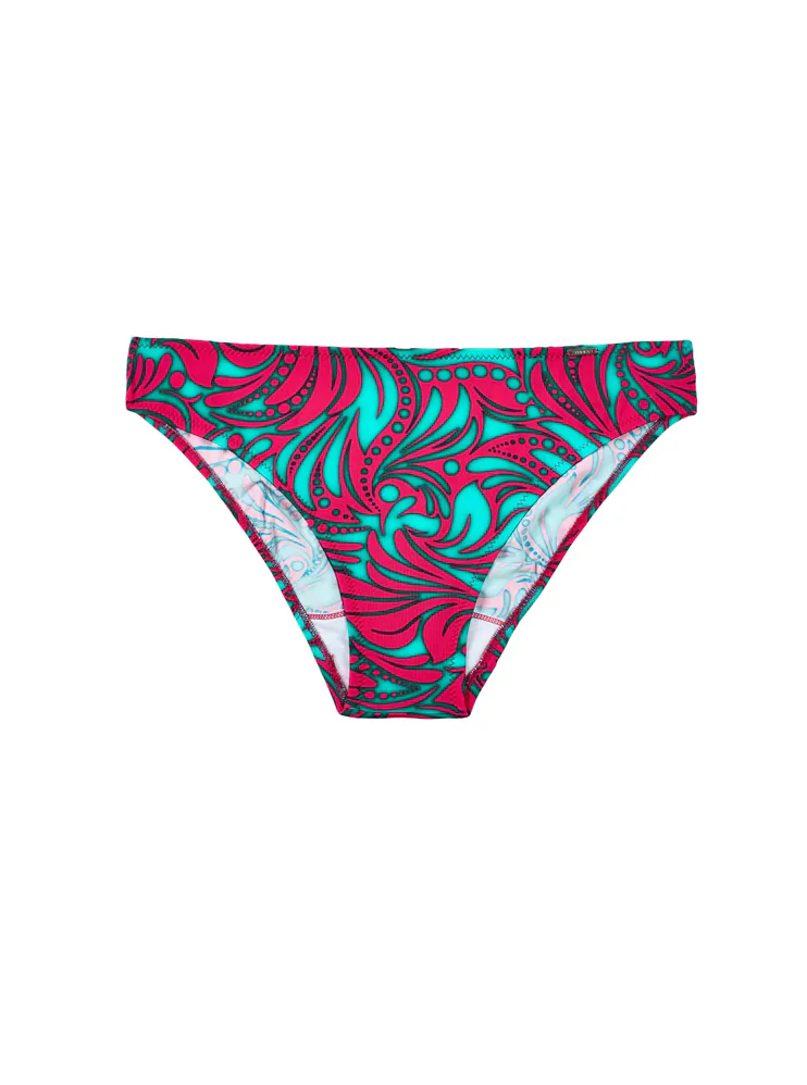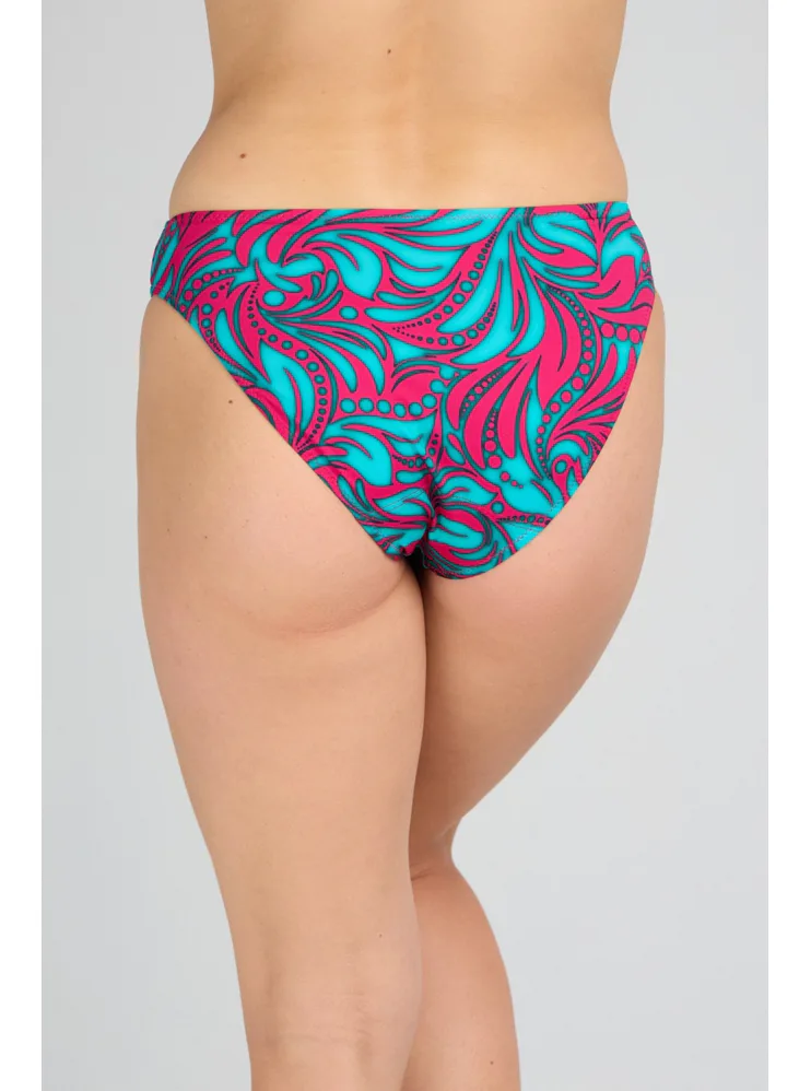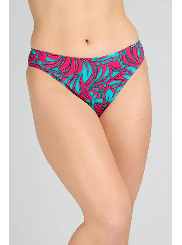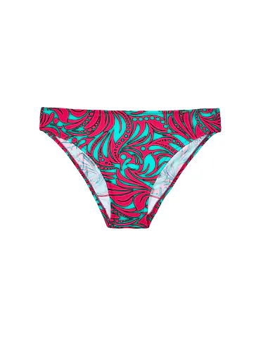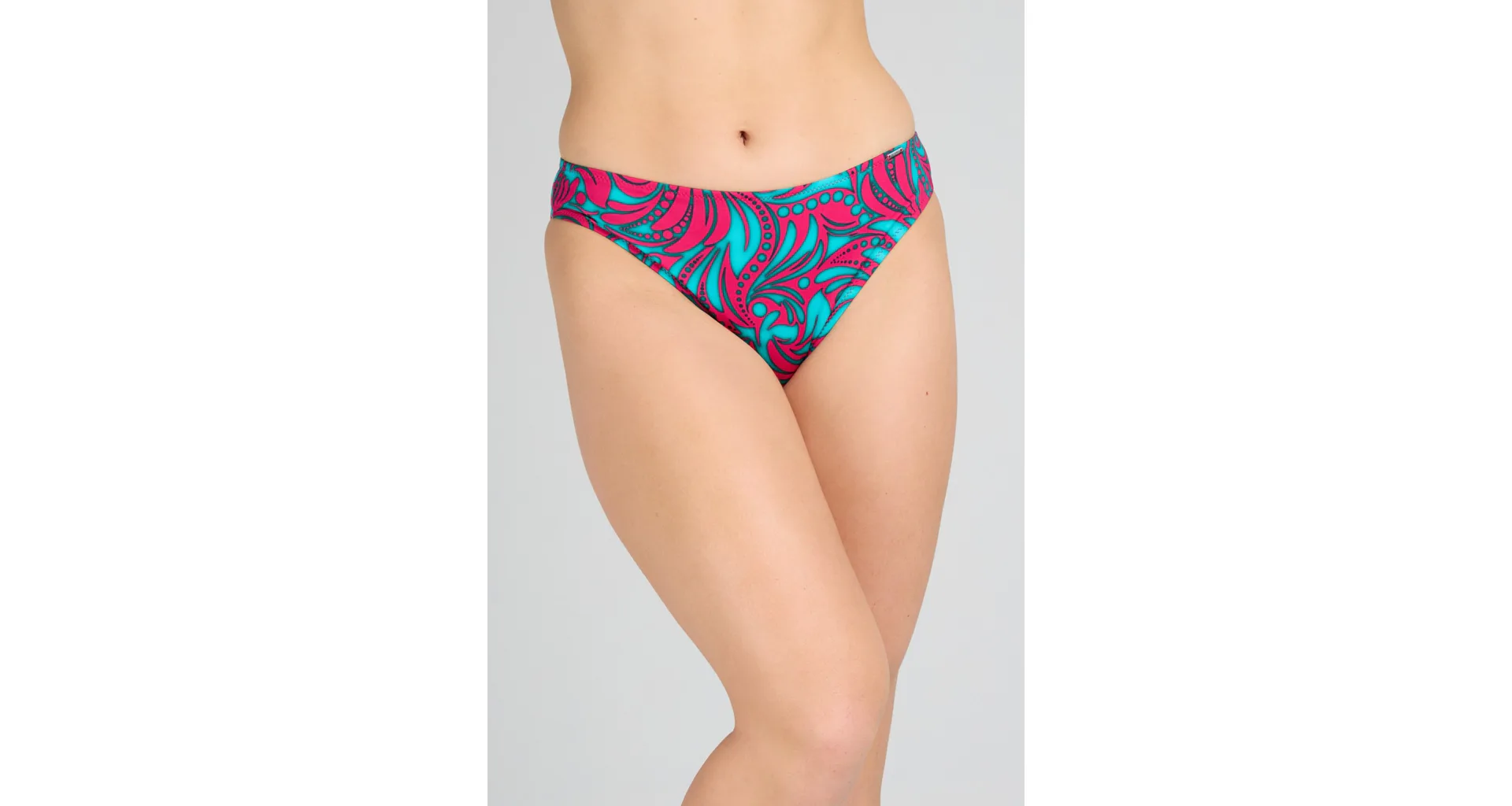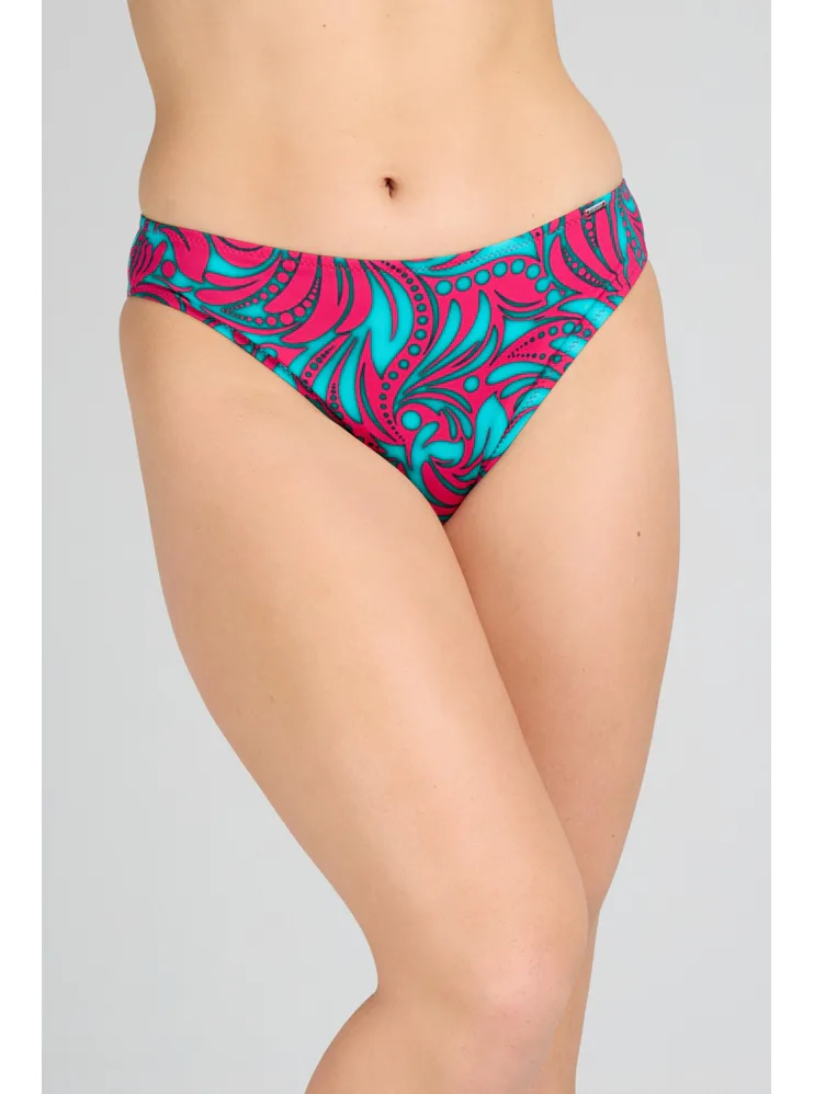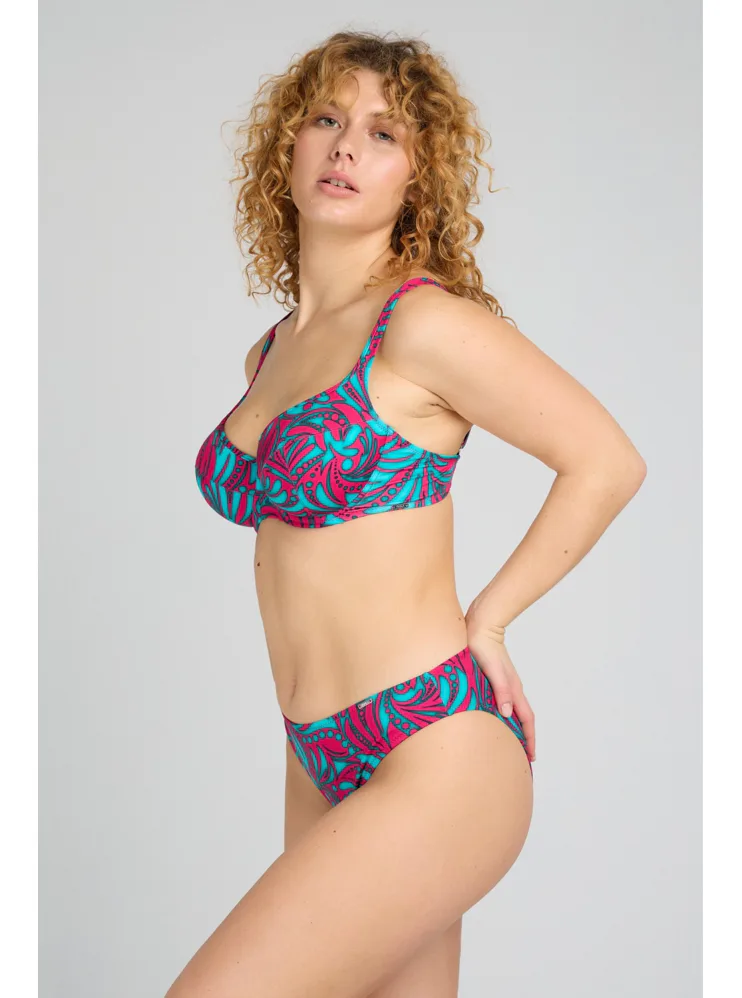 Elegantní plavkové kalhotky ve fuchsiové a tyrkysové barvě s letním vzorem podtrhnou vaši krásu. Vybíráte plavky na letní dovolenou? Vyzkoušejte dvoudílné plavky z nové kolekce Triola 2025.