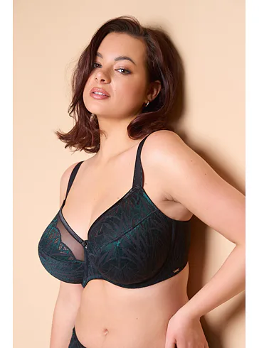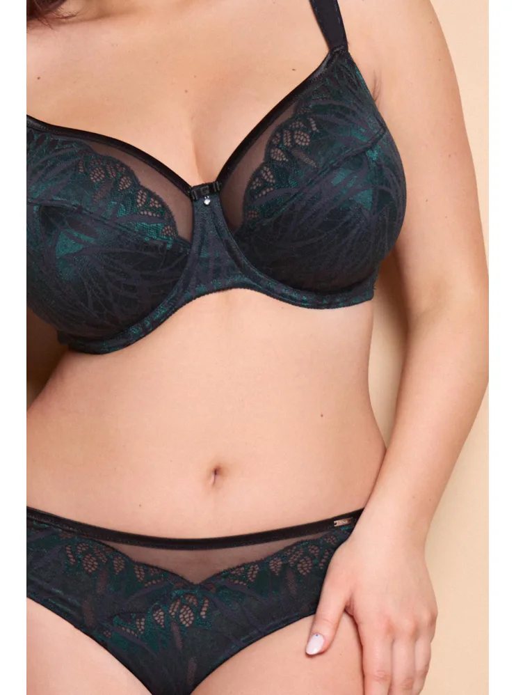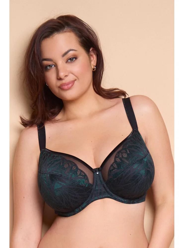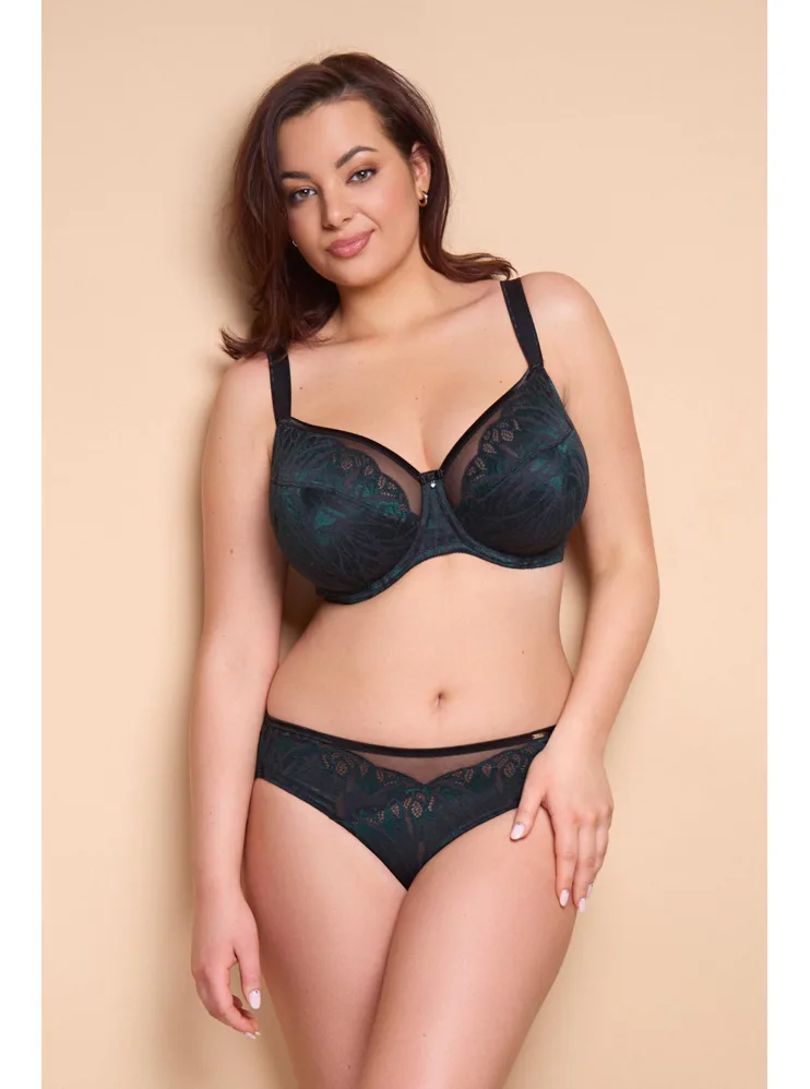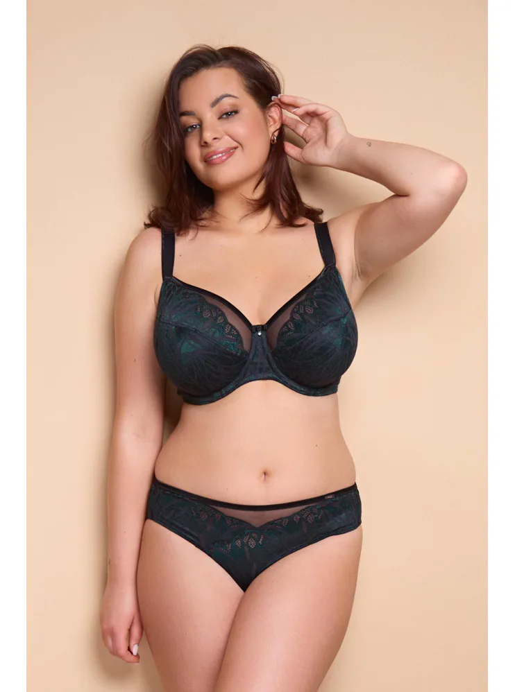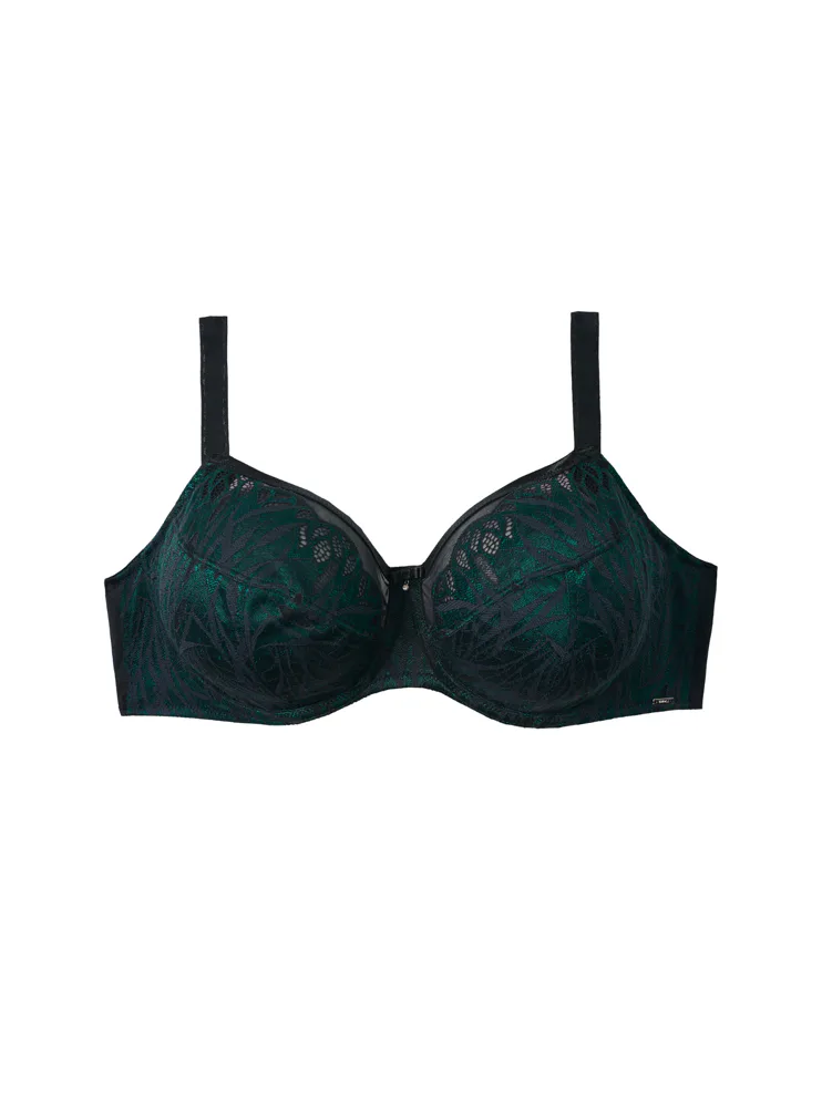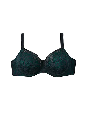 Nevyztužená krajková podprsenka s kosticemi zafixuje a vytvaruje velké poprsí. Komfortní měkká ramínka se nikde nezařezávají. Podprsenka Larissa s bohatým černo-zeleným vzorem a s vysokým podílem viskózy je prodyšná a dobře se přizpůsobí tvaru vašeho těla. Podprsenku lze pořídit až do velikosti K. Udělejte si s příchodem podzimu radost pohodlným a zároveň krásným spodním prádlem.