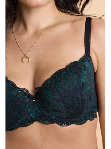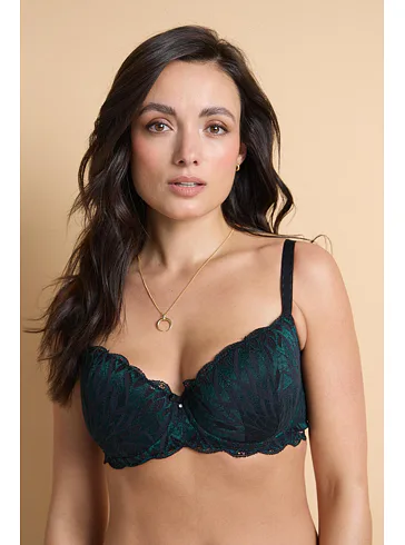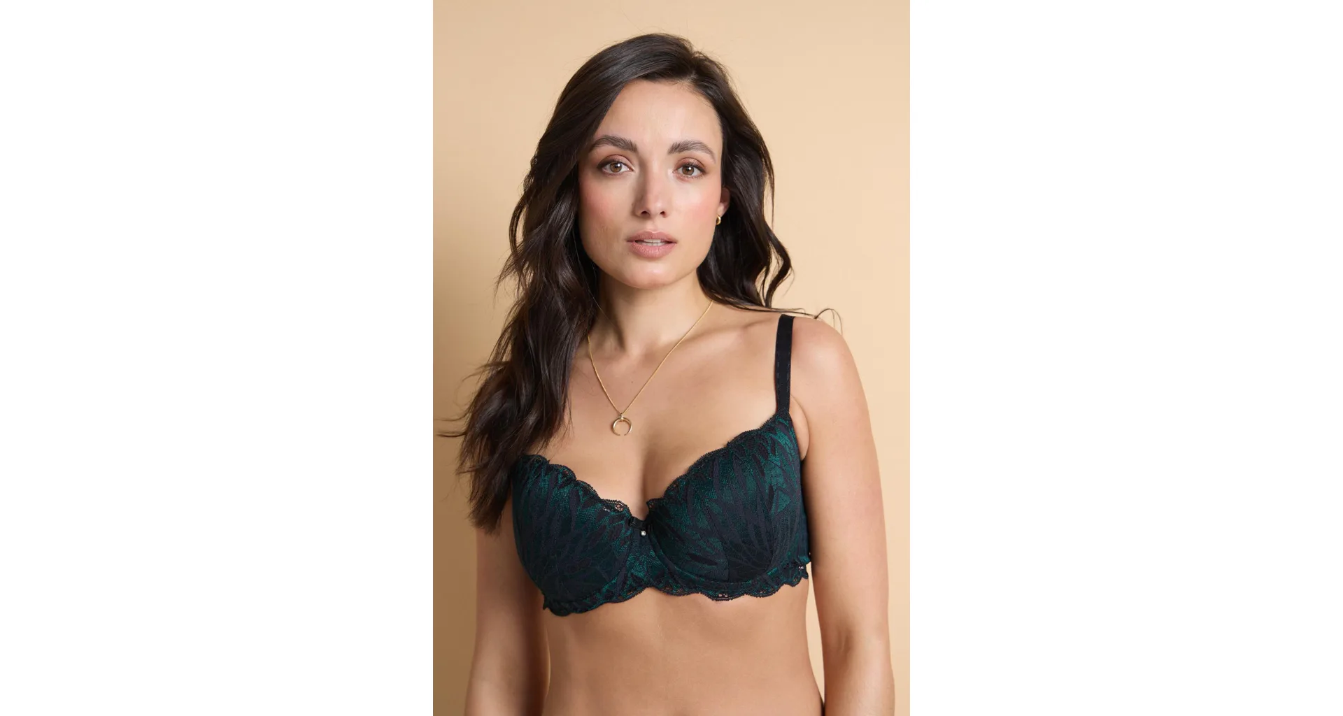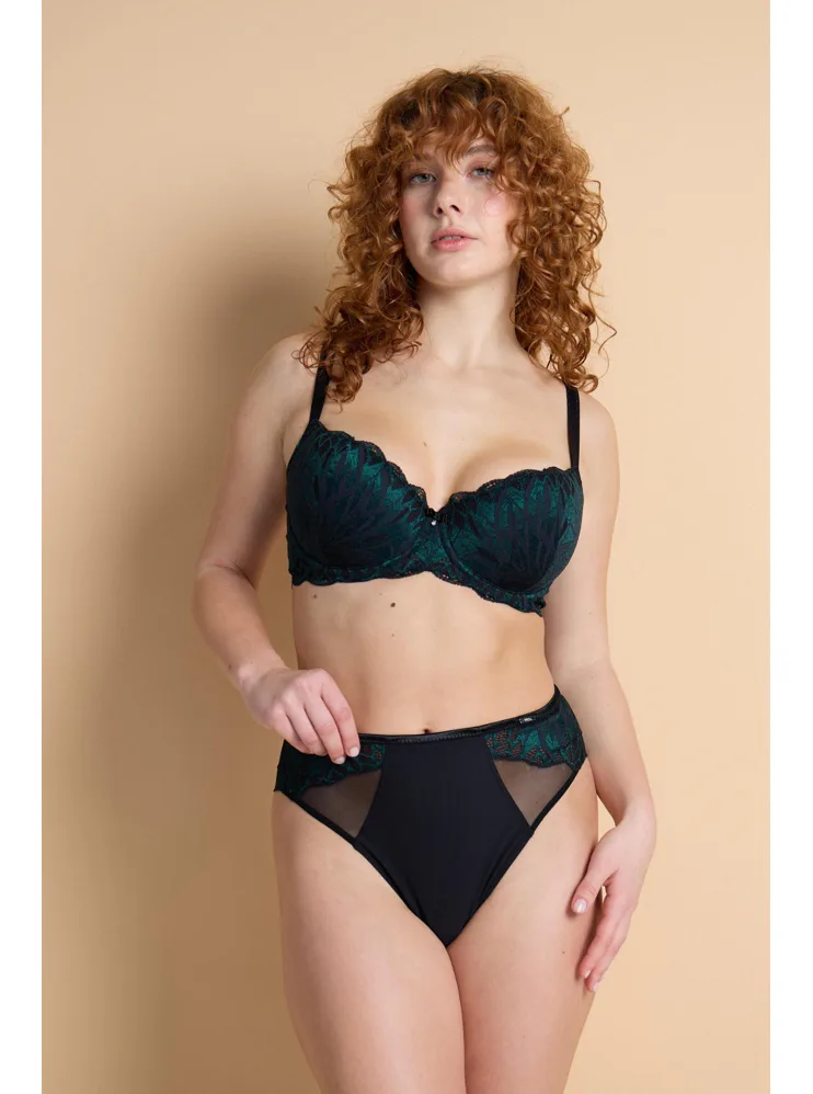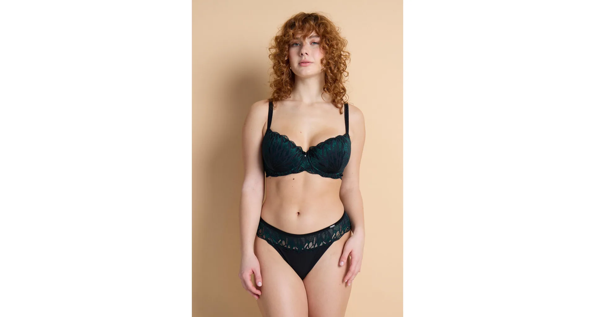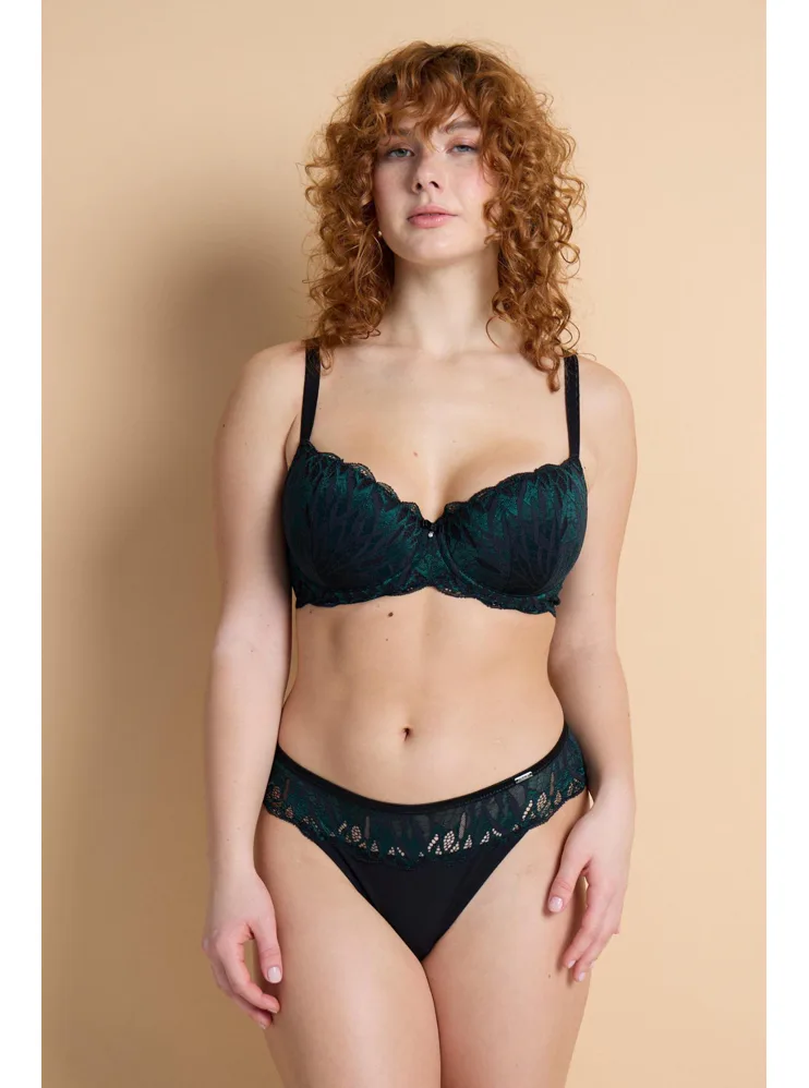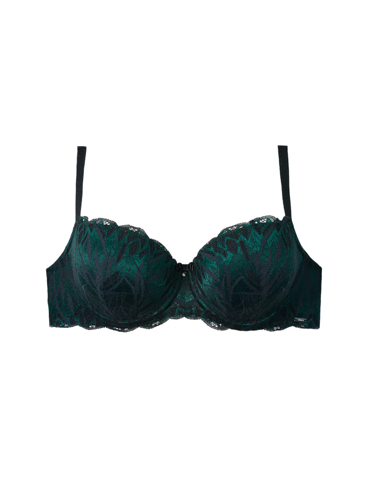 Podprsenka ve střihu Sexy-Fit se díky všitým flexi kosticím přizpůsobí každému vašemu pohybu, vytvoří neodolatelný hluboký dekolt a nikde netlačí. Tenké vyztužení krásně zakulatí vaše poprsí. Střih balcony je mezi ženami velmi oblíbený. Udělejte si radost celokrajkovou podprsenkou z elegantní černo-zelené krajky. Žakárová ramínka lze nastavit dle potřeby a zapínání má vzadu na háčky. Podprsenku lze pořídit ve velikosti B až H.