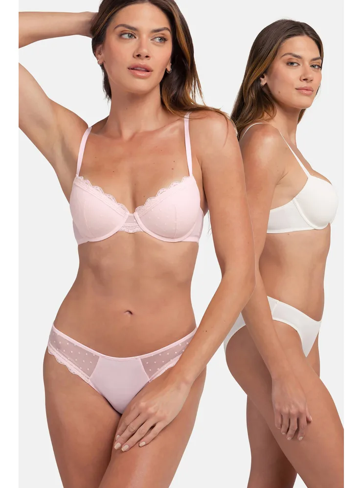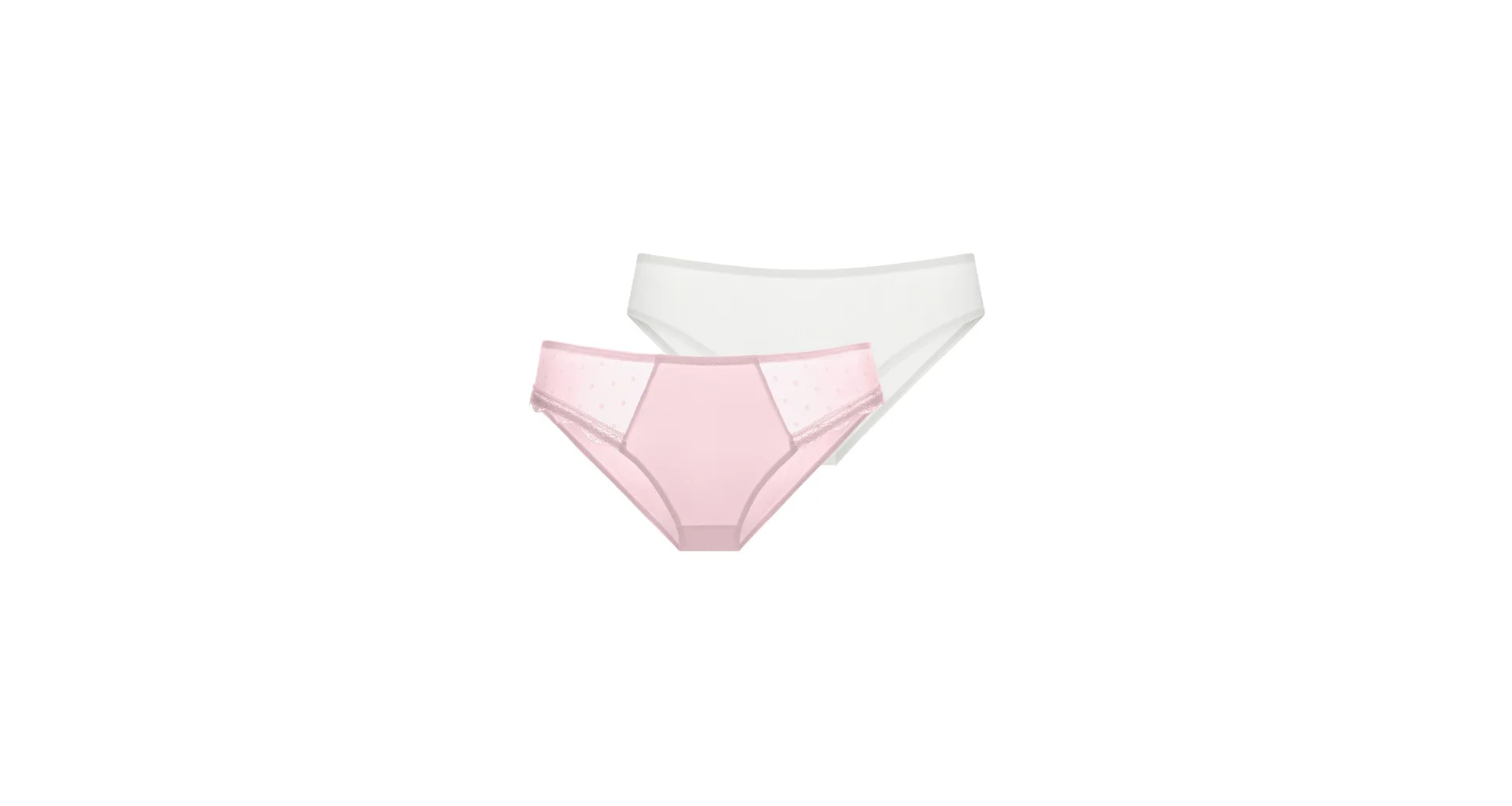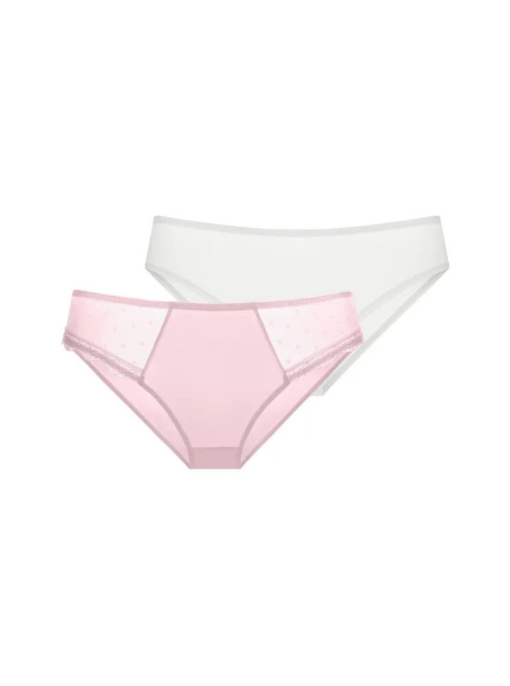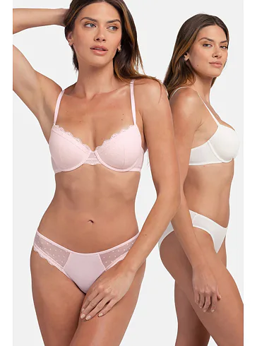 Hledáte pohodlné a elegantní kalhotky, které podtrhnou vaši krásu? Výhodné balení obsahuje bílé kalhotky v hladkém provedení a růžové kalhotky zdobené něžnou krajkou. Klasický střih kalhotek sluší každé ženě, udělejte si radost. K těmto kalhotkám si lze pořídit podprsenky ze stejné kolekce.